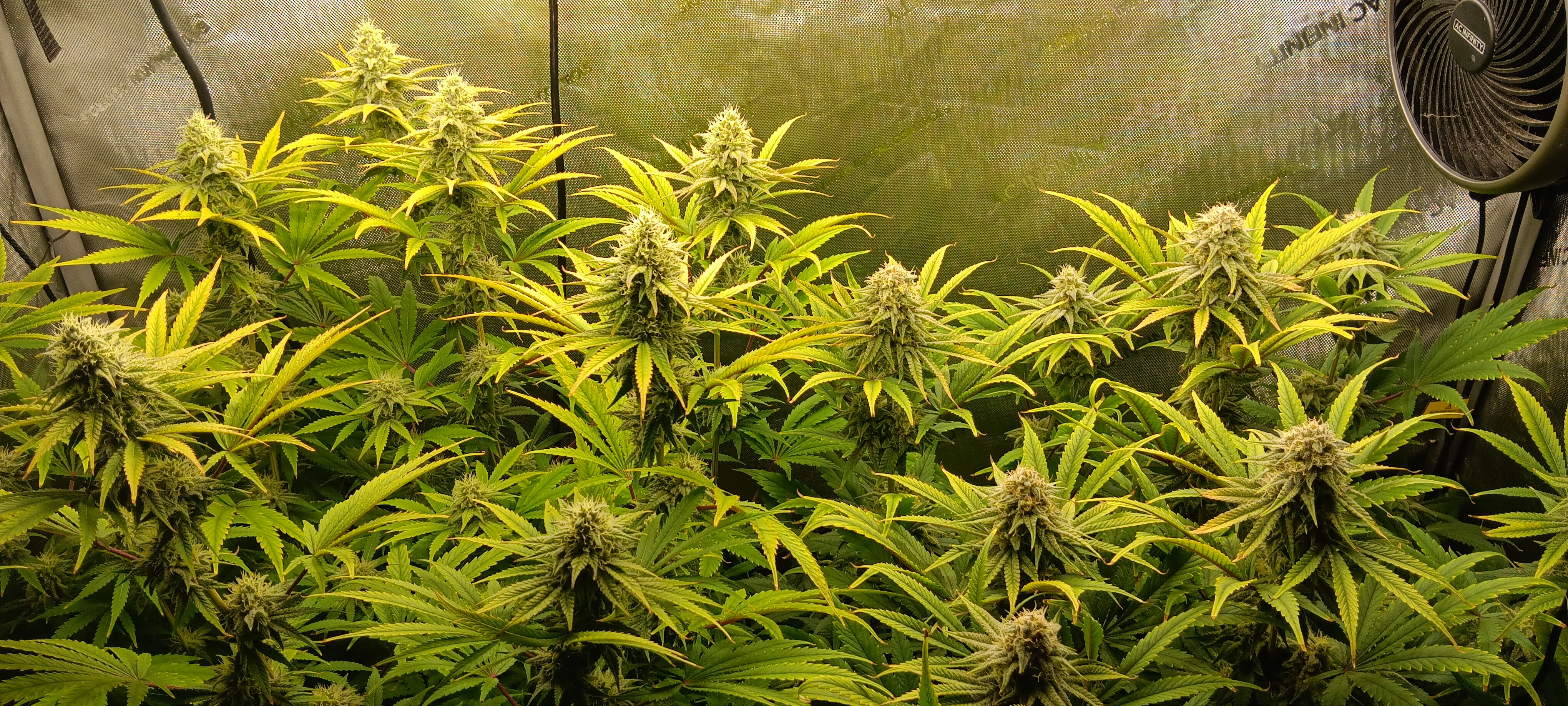 Flower Room: 11' x 7' x 7.5'H, 480w AC, 13gal/day dehumidifier, 1.5gal ultrasonic humidifier, 60gal (27gal usable) nute tank, 16" pedestal fan & 18" wall fan. Lighting and climate automated. Hand watering.