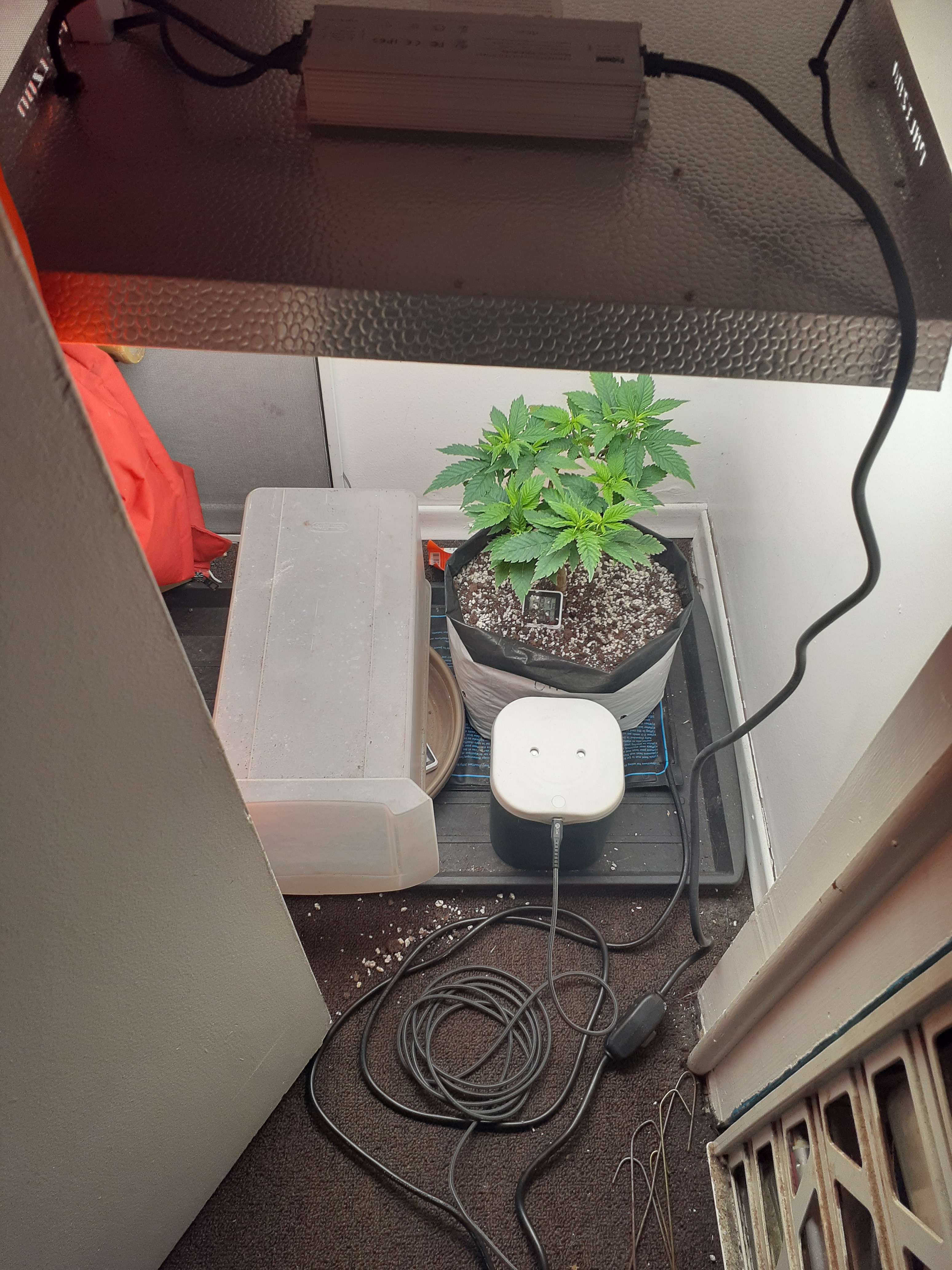 Flower Room: 11' x 7' x 7.5'H, 480w AC, 13gal/day dehumidifier, 1.5gal ultrasonic humidifier, 60gal (27gal usable) nute tank, 16" pedestal fan & 18" wall fan. Lighting and climate automated. Hand watering.