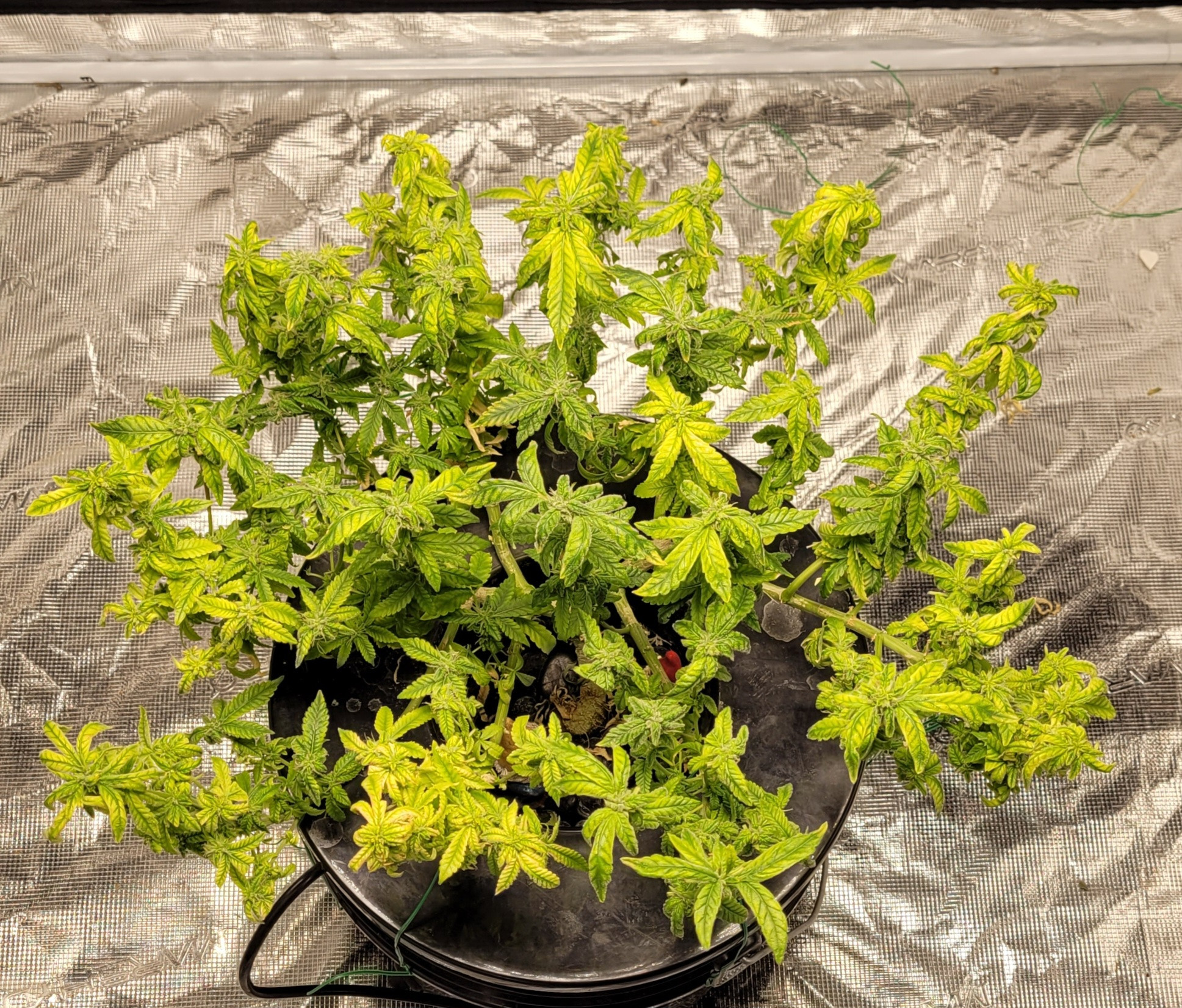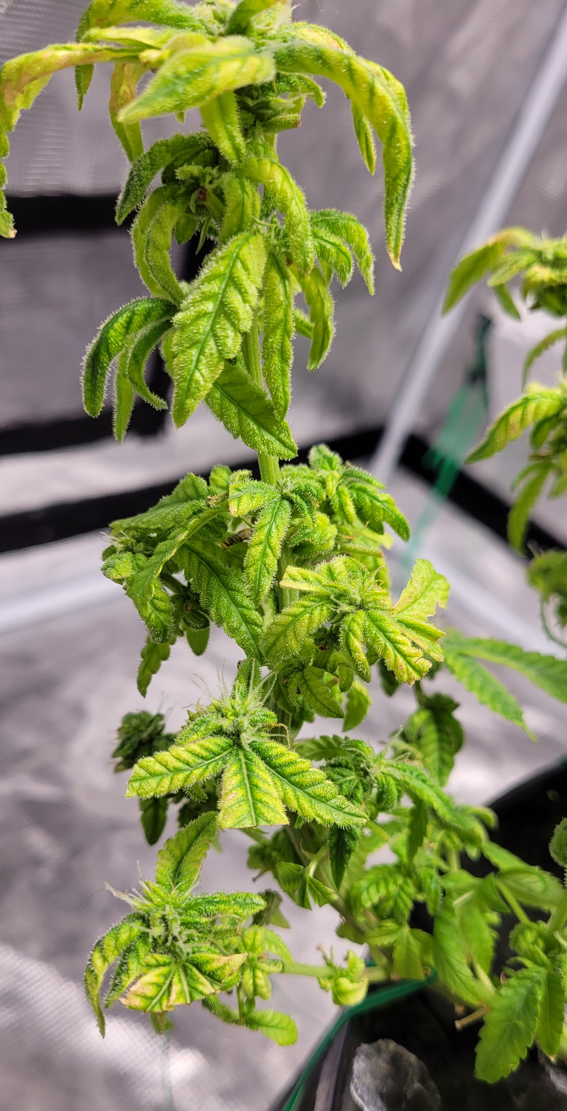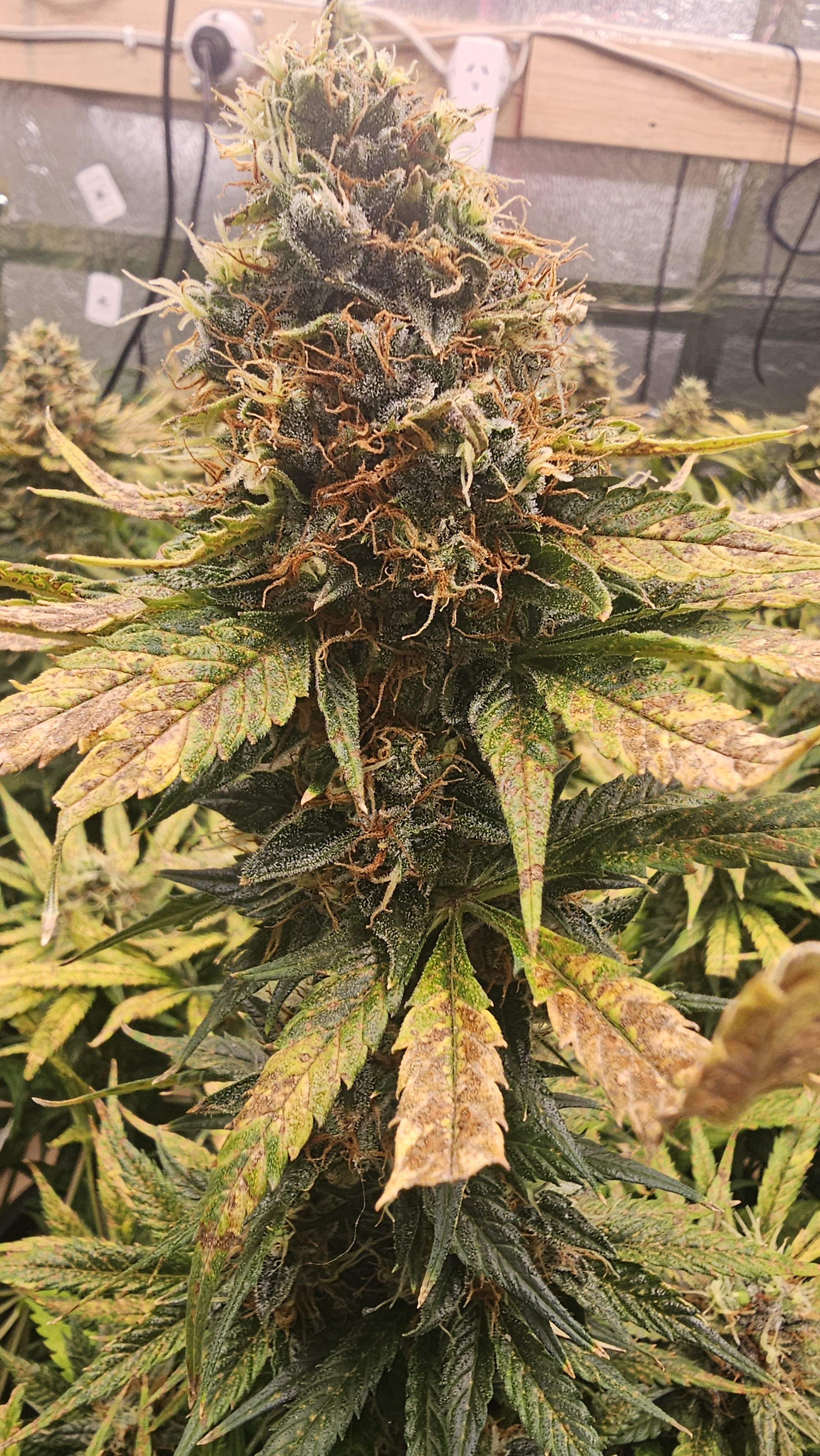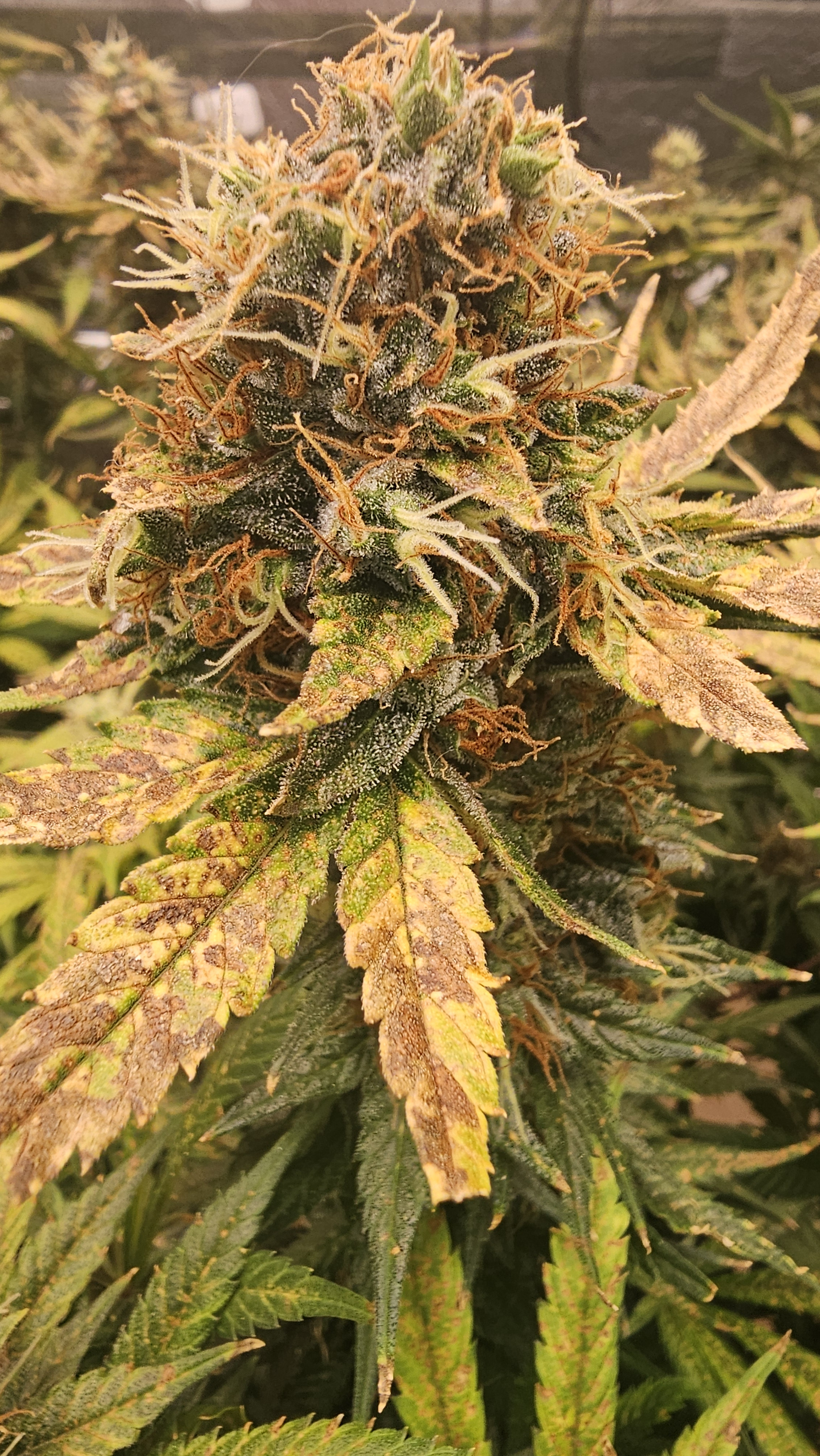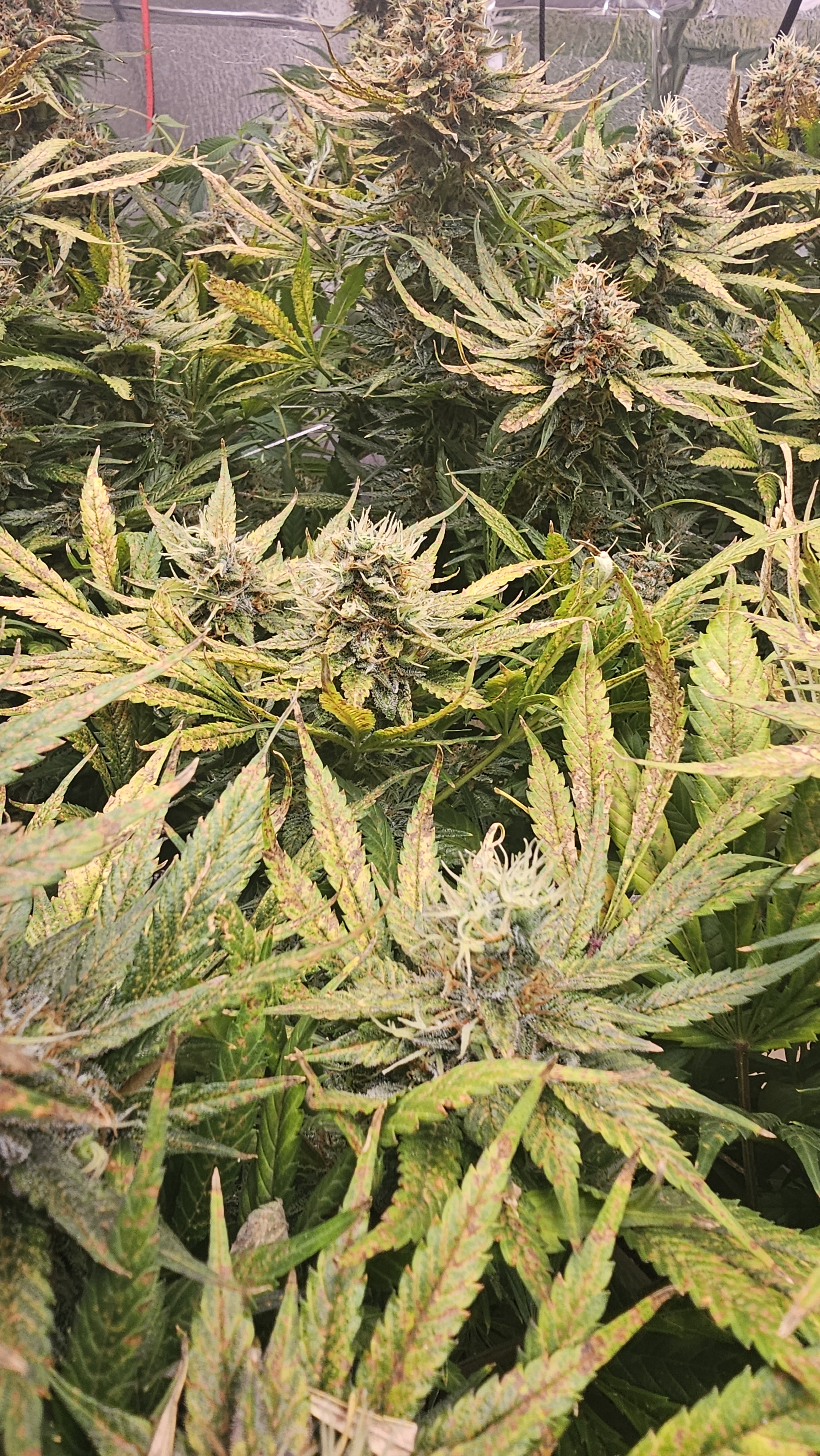 I kept up calmag well into midflower then replaced with PK strong doses but EC not more than 1.7 or they'd burn. Losing all the top leaves lost pigment and dry as a crisp with rust. Was worried I may have stressed her too much but she is powering on. She has a full under canopy of green but a few starting to show rust spots now. I've reduced far red and IR a lot and about to cut them all together (they are supplemental reds and I reckon they cause as much nute problems and leaf issues than they do promote growth). Anyway it has come good.