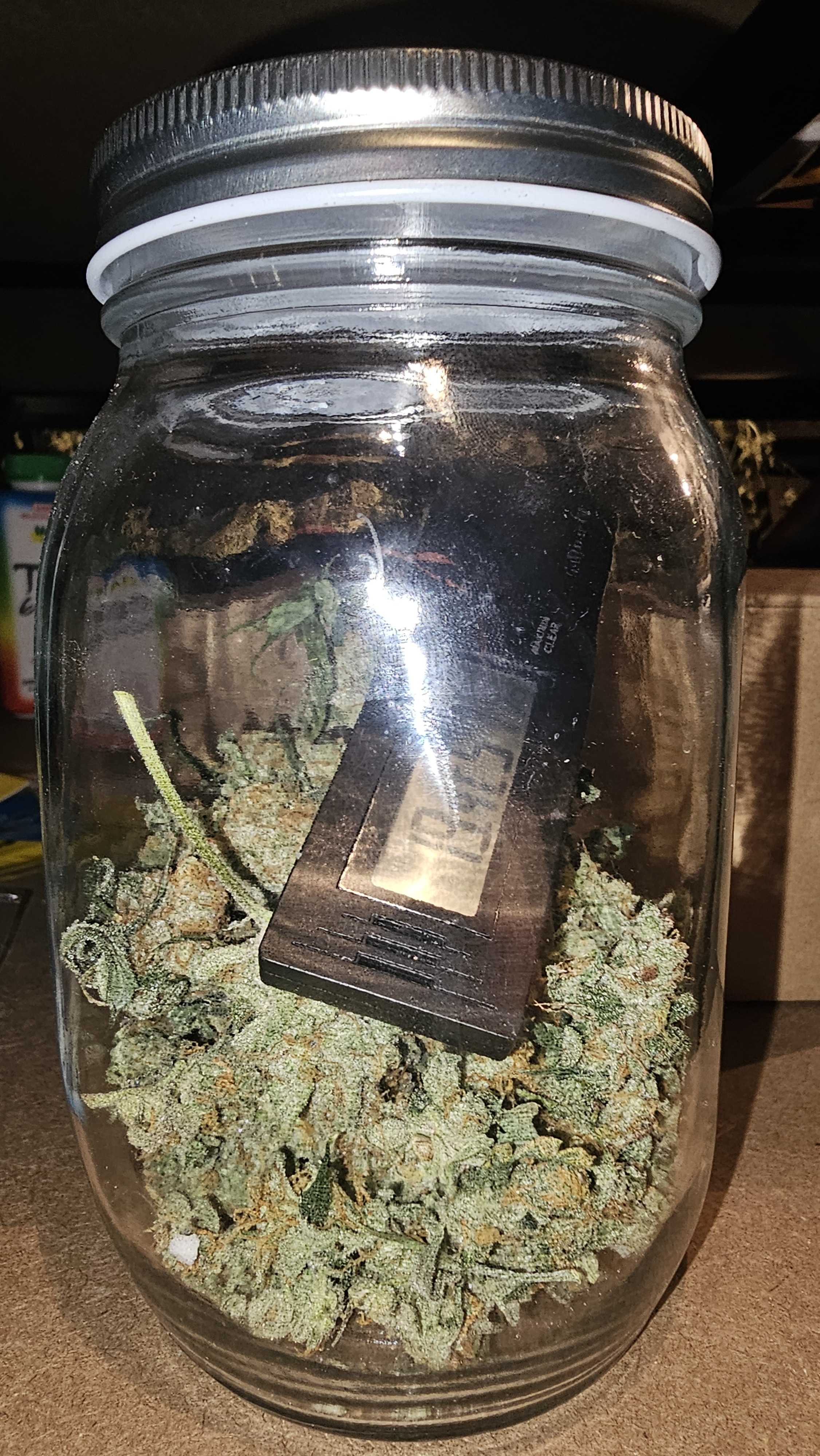 I've bought 60 more jars. The above jar has settled down around 60% RH in the jar and I've just started jarring the rest of the above plant and comfortably fitting 34 gram in a jar with a 20% air gap at the top. Sticky as these buds. The stickiest buds I've harvested in over 30 years no doubt. Will update with yield once done.