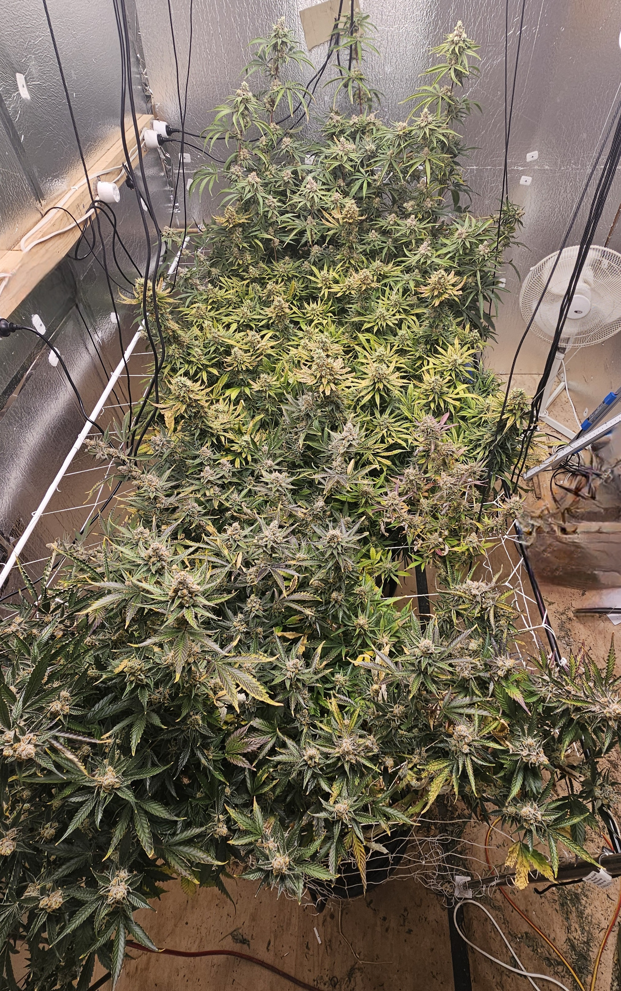 Flower Room: 11' x 7' x 7.5'H, 480w AC, 13gal/day dehumidifier, 1.5gal ultrasonic humidifier, 60gal (27gal usable) nute tank, 16" pedestal fan & 18" wall fan. Lighting and climate automated. Hand watering.