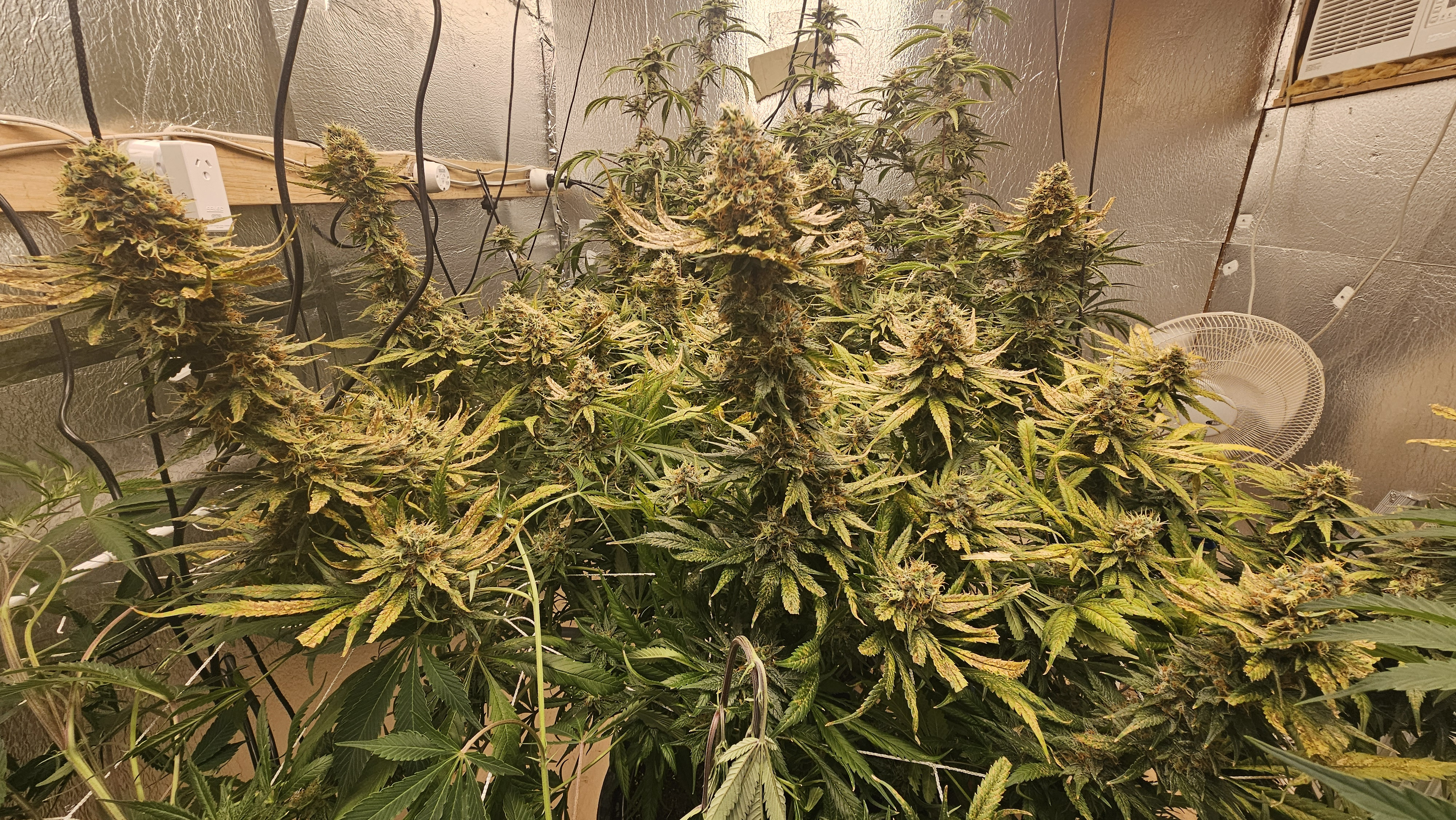 Flower Room: 11' x 7' x 7.5'H, 480w AC, 13gal/day dehumidifier, 1.5gal ultrasonic humidifier, 60gal (27gal usable) nute tank, 16" pedestal fan & 18" wall fan. Lighting and climate automated. Hand watering.