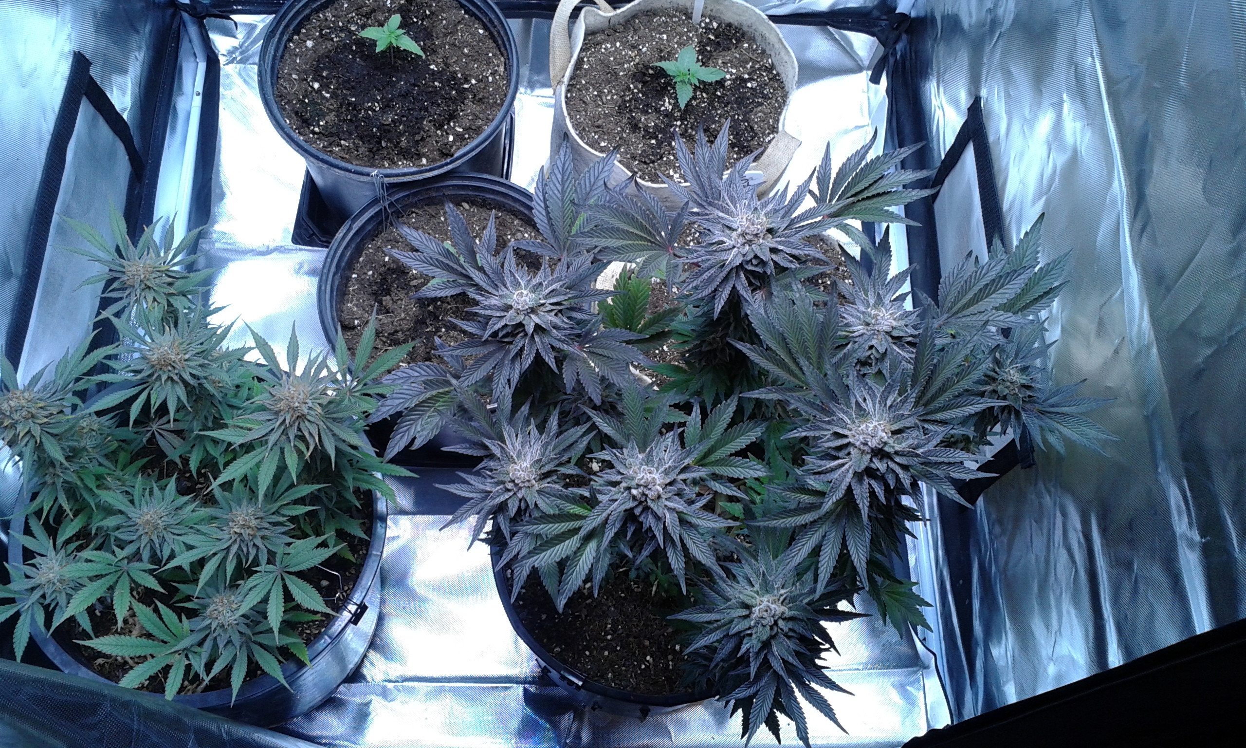 Seven and five weeks with the White Widow non-feminized. The trimmed plant at the back left is seven weeks old and just came out as female. The sick sister to the right, foreground is female at five weeks, but she has her own way. The other two have not identified themselves so I suspect male. The younger ones will go off to breed in ten days, and the big girl will get a bigger playpen to grow into.
