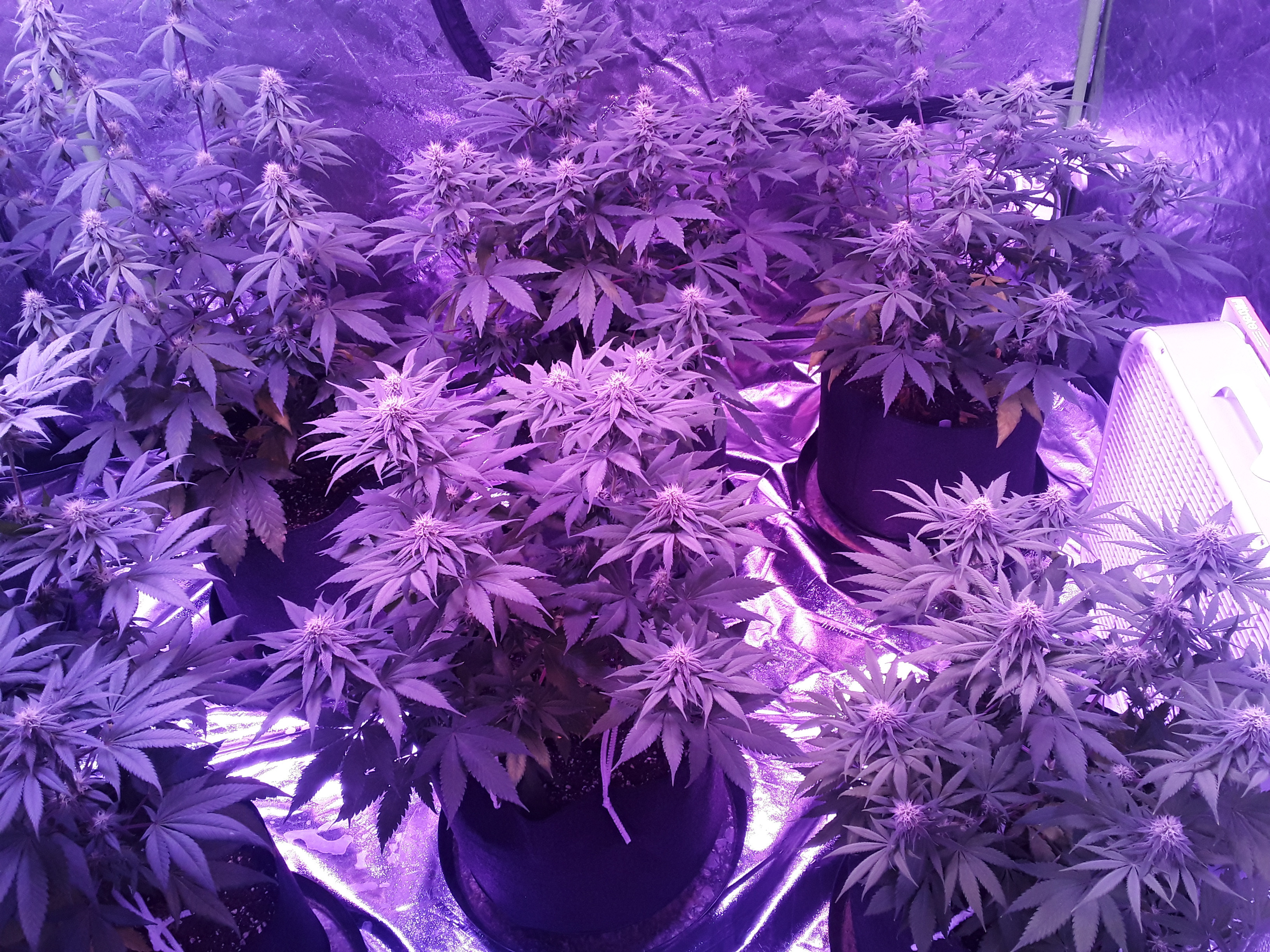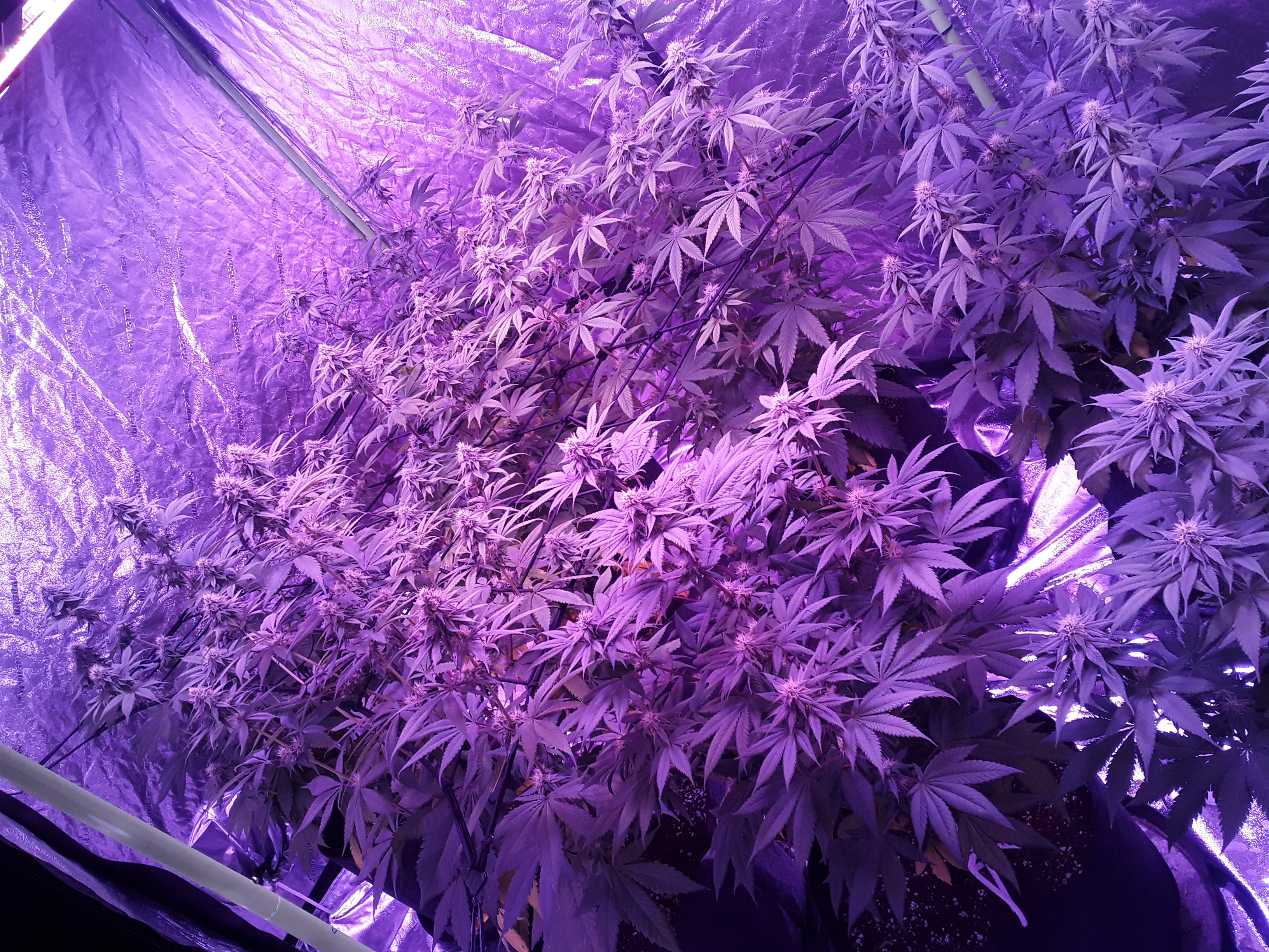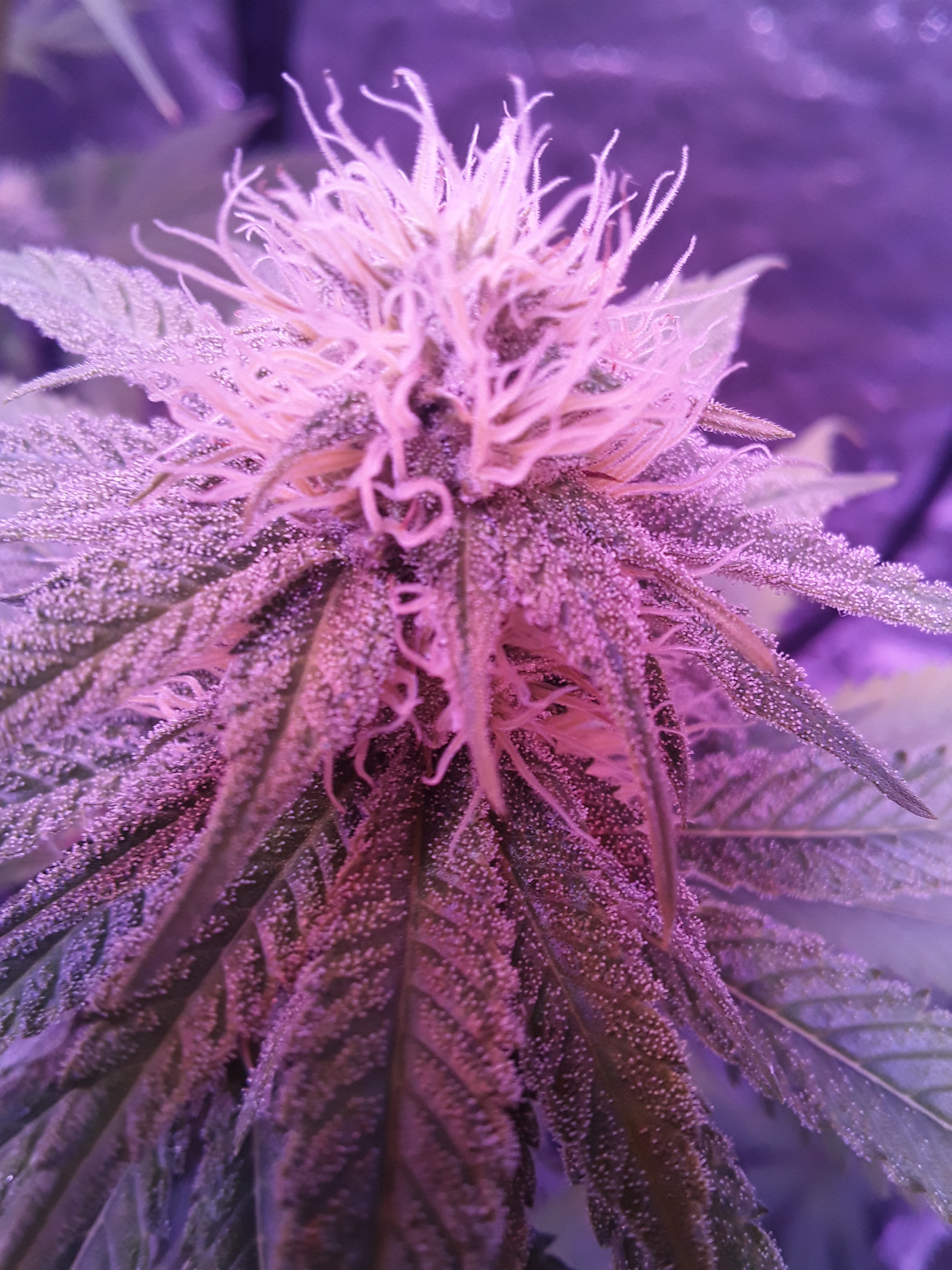 it's really purple color almost black never had that in the first black cherry punch and the other pic came from the same pkg. It's got really bright orange hairs and stayed shorter. Tall one is about 25" other 18" The 2 450vipras are now 20" from the tallest, I took it off it's riser. The shorter one I think I defoliated way to much early on but it was like a cauliflower bunched of leaves in the center so it stayed short? At this point we just want to harvest the gals they are getting last flush/drink today of unsulfurated molasses 1/2 gal ea. Then next weekend i'm going to harvest