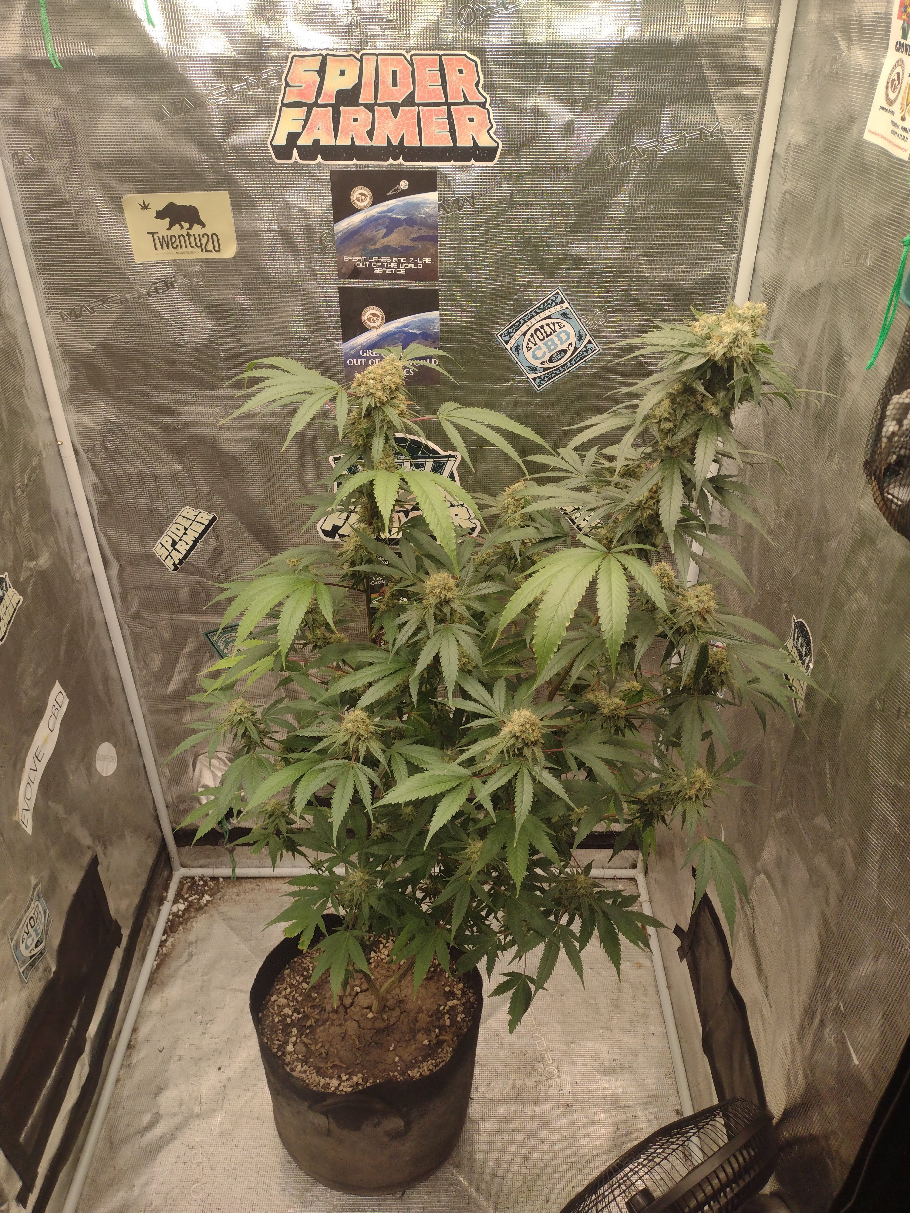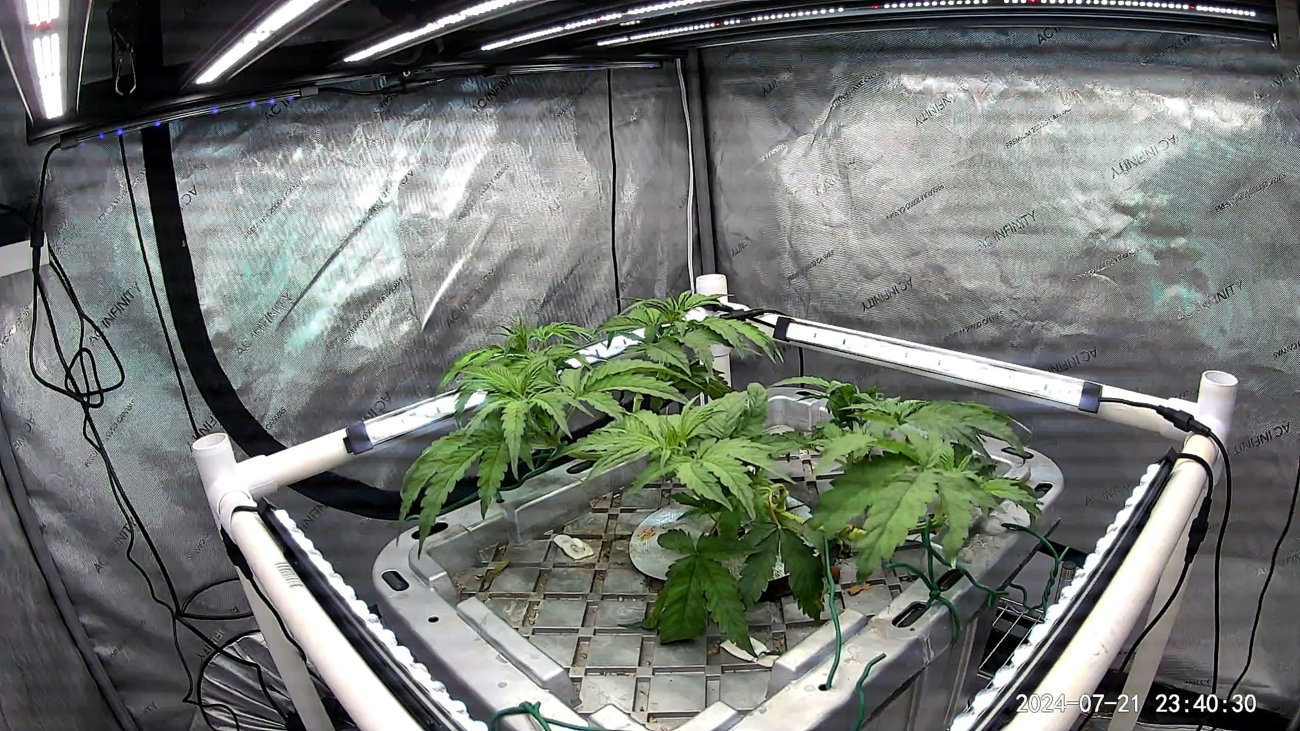 Flower Room: 11' x 7' x 7.5'H, 480w AC, 13gal/day dehumidifier, 1.5gal ultrasonic humidifier, 60gal (27gal usable) nute tank, 16" pedestal fan & 18" wall fan. Lighting and climate automated. Hand watering.