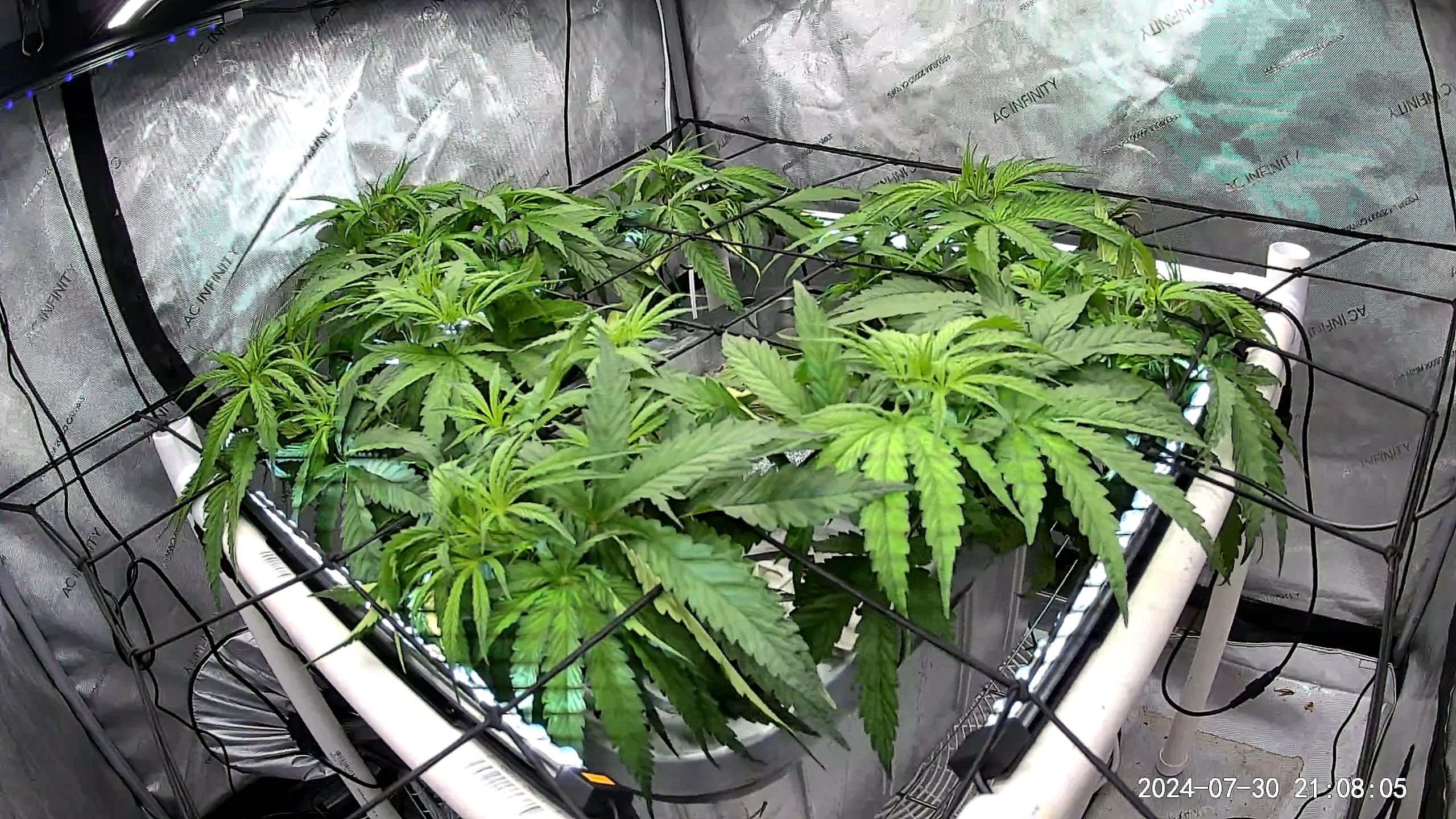 Flower Room: 11' x 7' x 7.5'H, 480w AC, 13gal/day dehumidifier, 1.5gal ultrasonic humidifier, 60gal (27gal usable) nute tank, 16" pedestal fan & 18" wall fan. Lighting and climate automated. Hand watering.