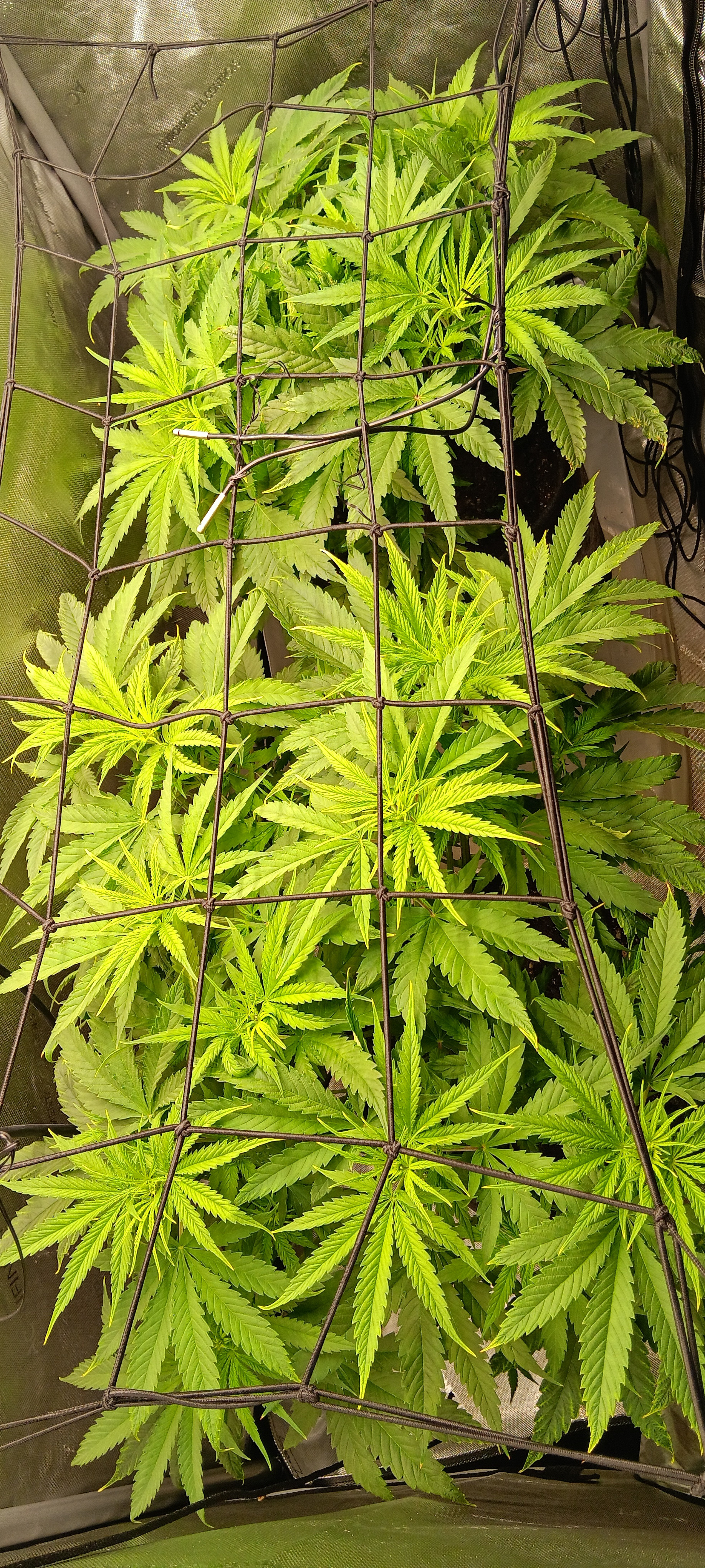 Well this next grow is looking way better. Bluey I figured out the FeO2 toxicity. It was coming from old plant staples. You can see the improvement. I went back to electrical wire for training.