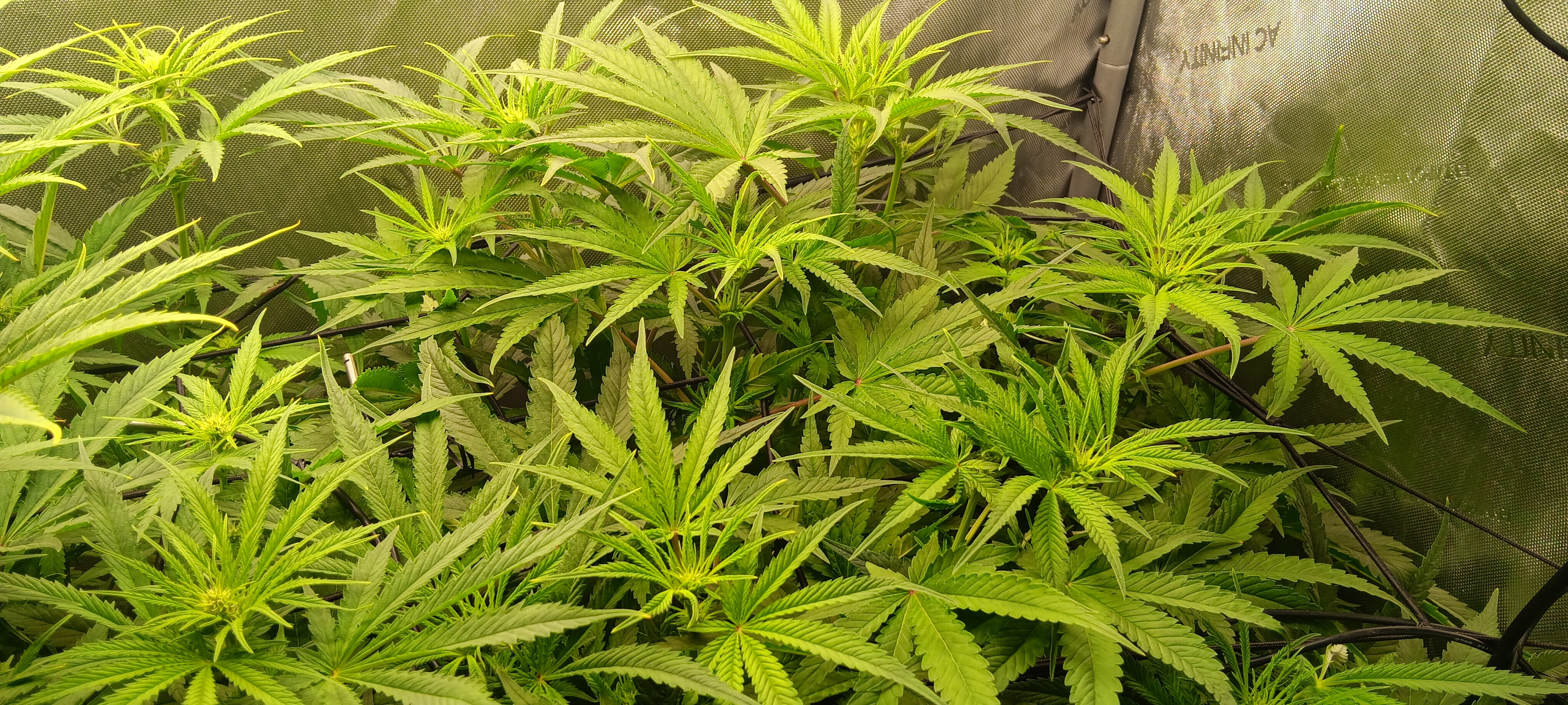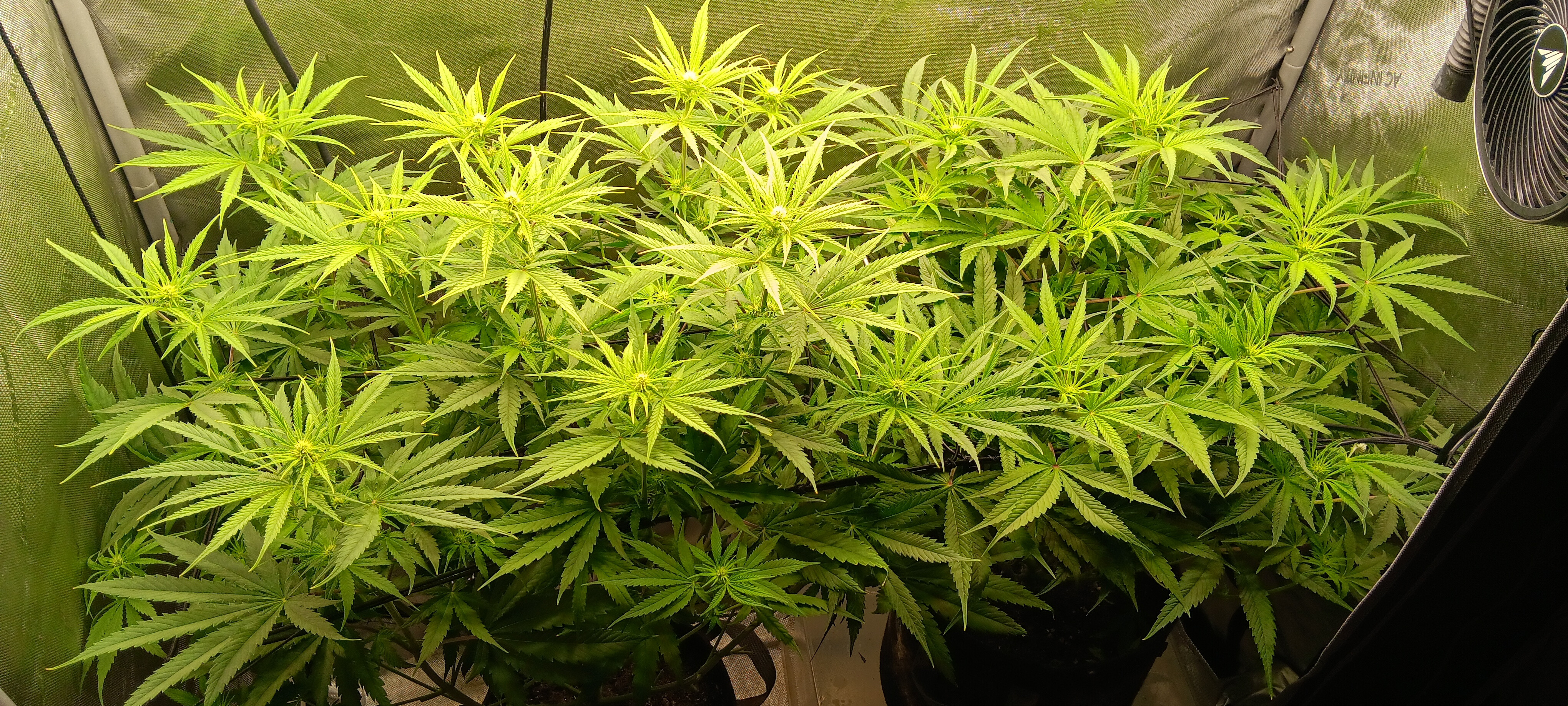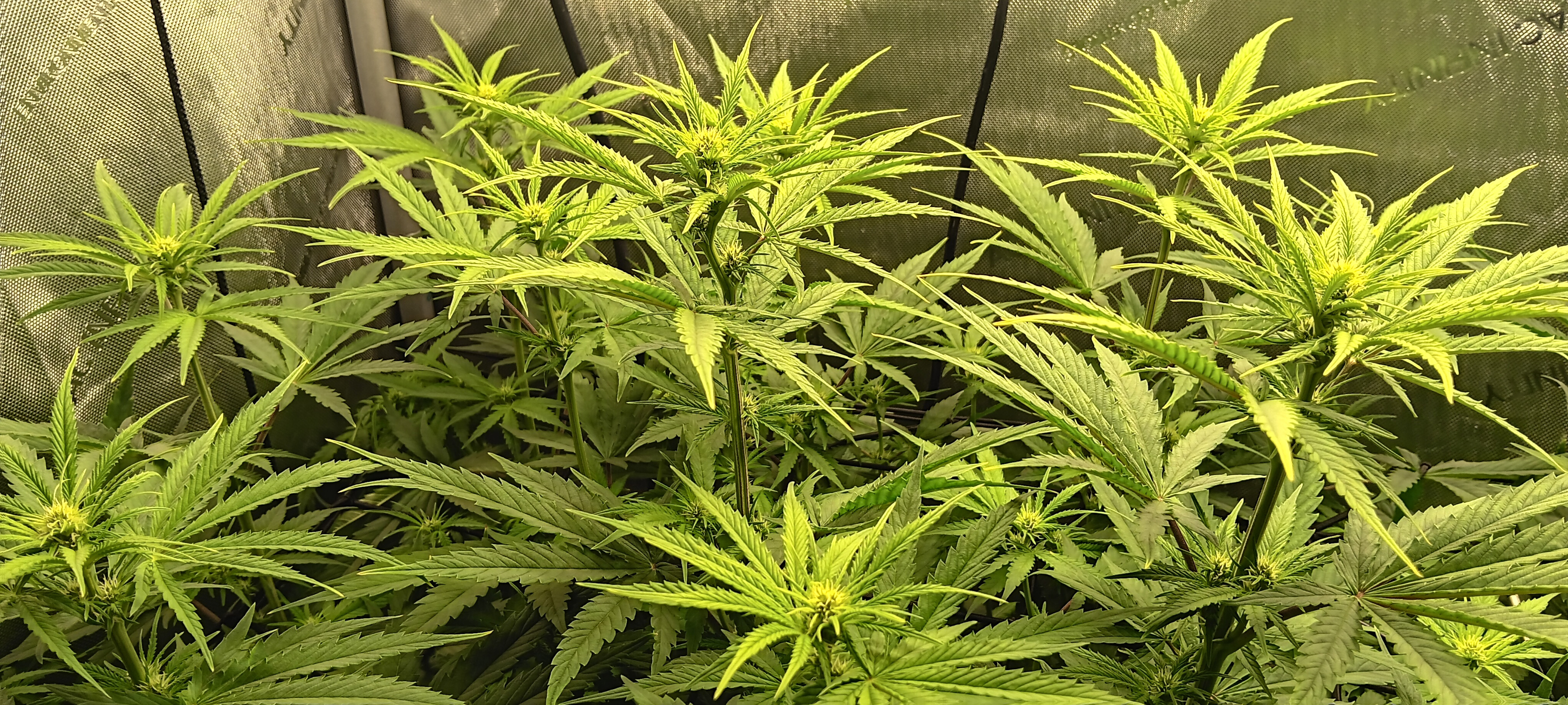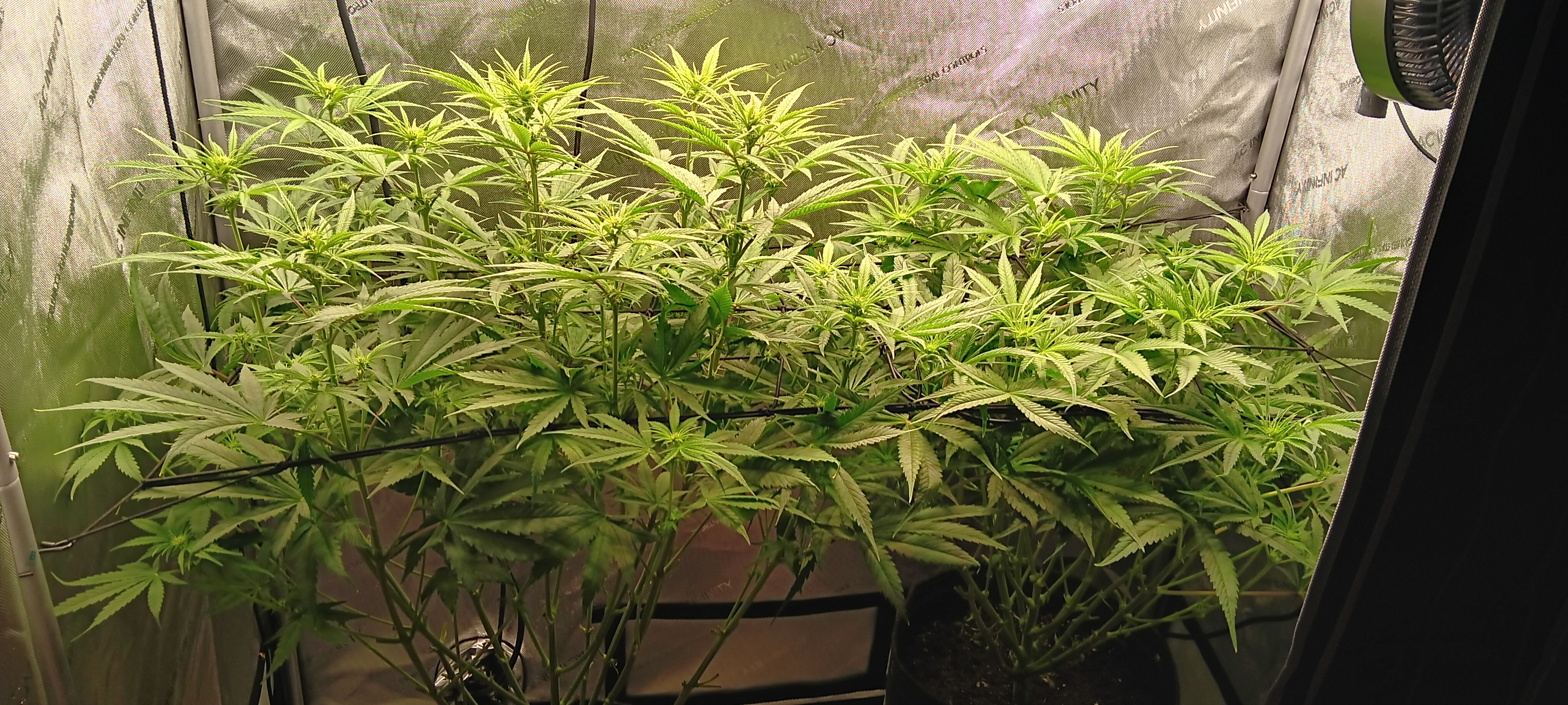 It's not a very tidy grow. 5 plants with 4 of them a 9 foot x 6 foot canopy (each plant canopy x 4 of them) makes it tough. They spent a good month too long in their veg cupboards unfortunately but I should get a decent yield from them. I've done hardly any cut back, repaired a few broken stems, the under canopy is filled with dead leaves. I'm going to lose maybe 1 main cola on each of the 4 because I couldn't get them under the lights, they have fallen outside....I've yoyo'd a few up and the one closest camera has about 6 yoyos on it stopping the main colas from collapsing.