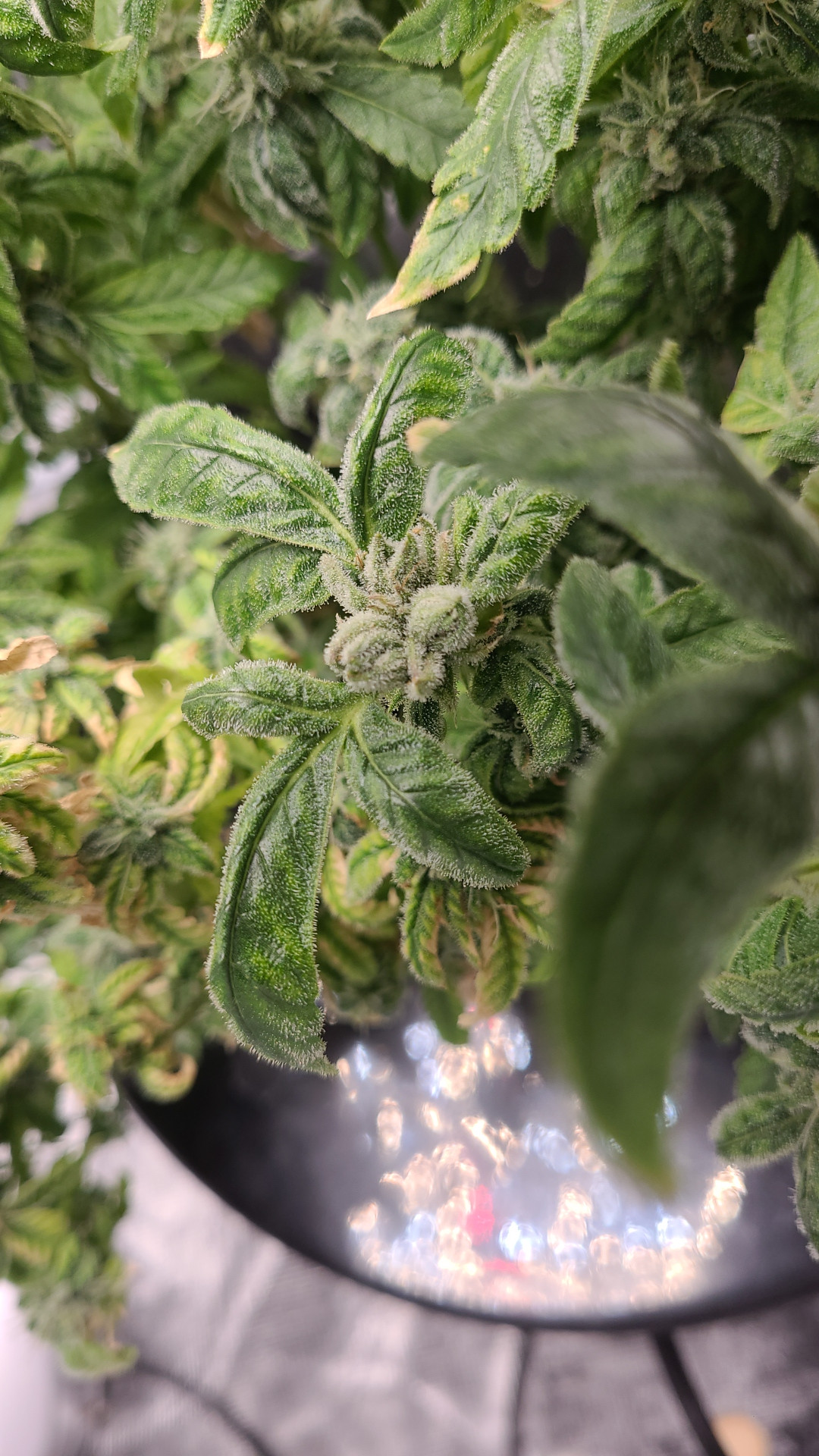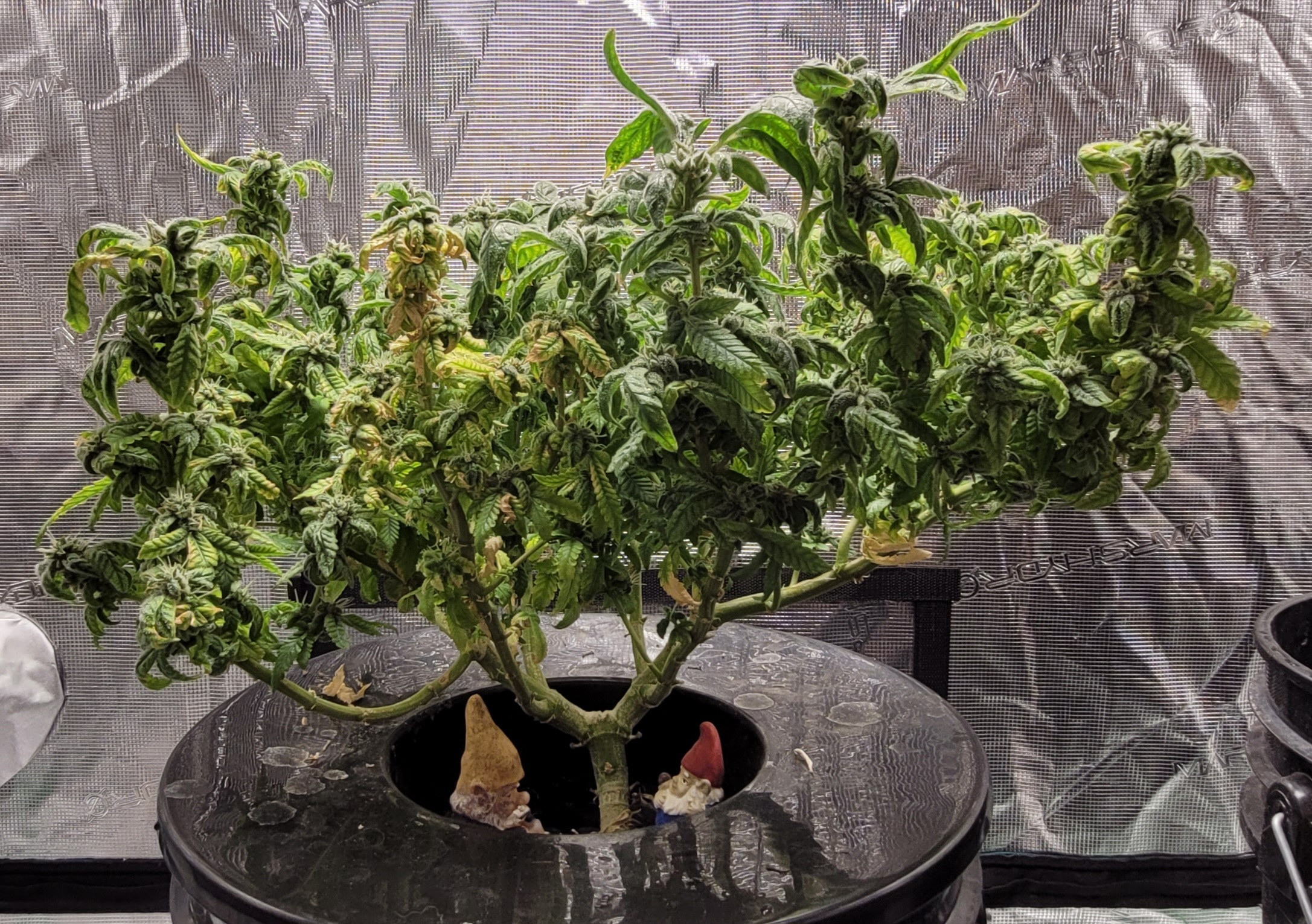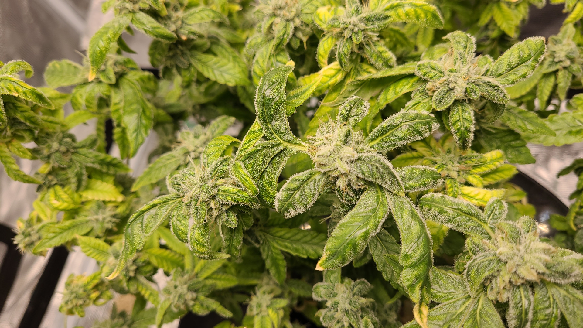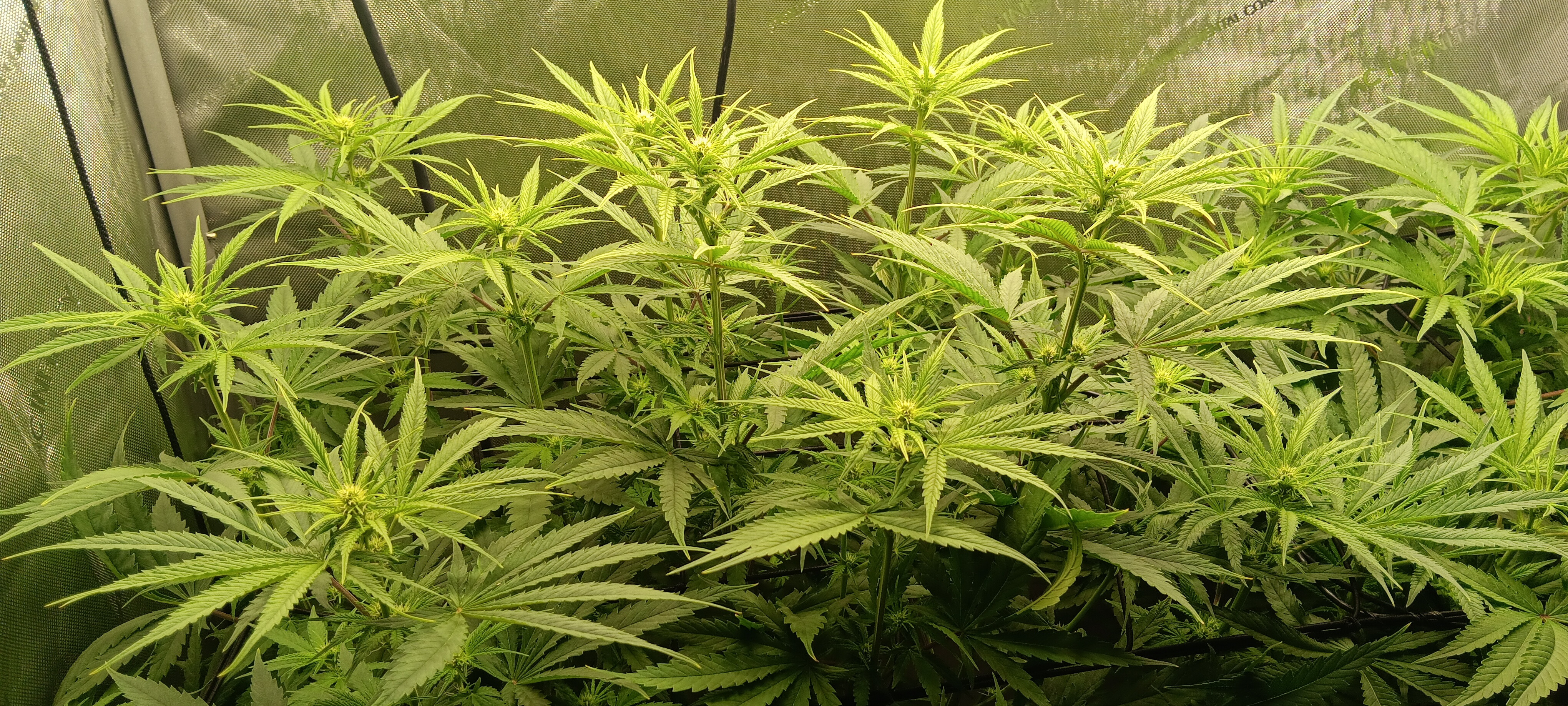 It's not a very tidy grow. 5 plants with 4 of them a 9 foot x 6 foot canopy (each plant canopy x 4 of them) makes it tough. They spent a good month too long in their veg cupboards unfortunately but I should get a decent yield from them. I've done hardly any cut back, repaired a few broken stems, the under canopy is filled with dead leaves. I'm going to lose maybe 1 main cola on each of the 4 because I couldn't get them under the lights, they have fallen outside....I've yoyo'd a few up and the one closest camera has about 6 yoyos on it stopping the main colas from collapsing.
