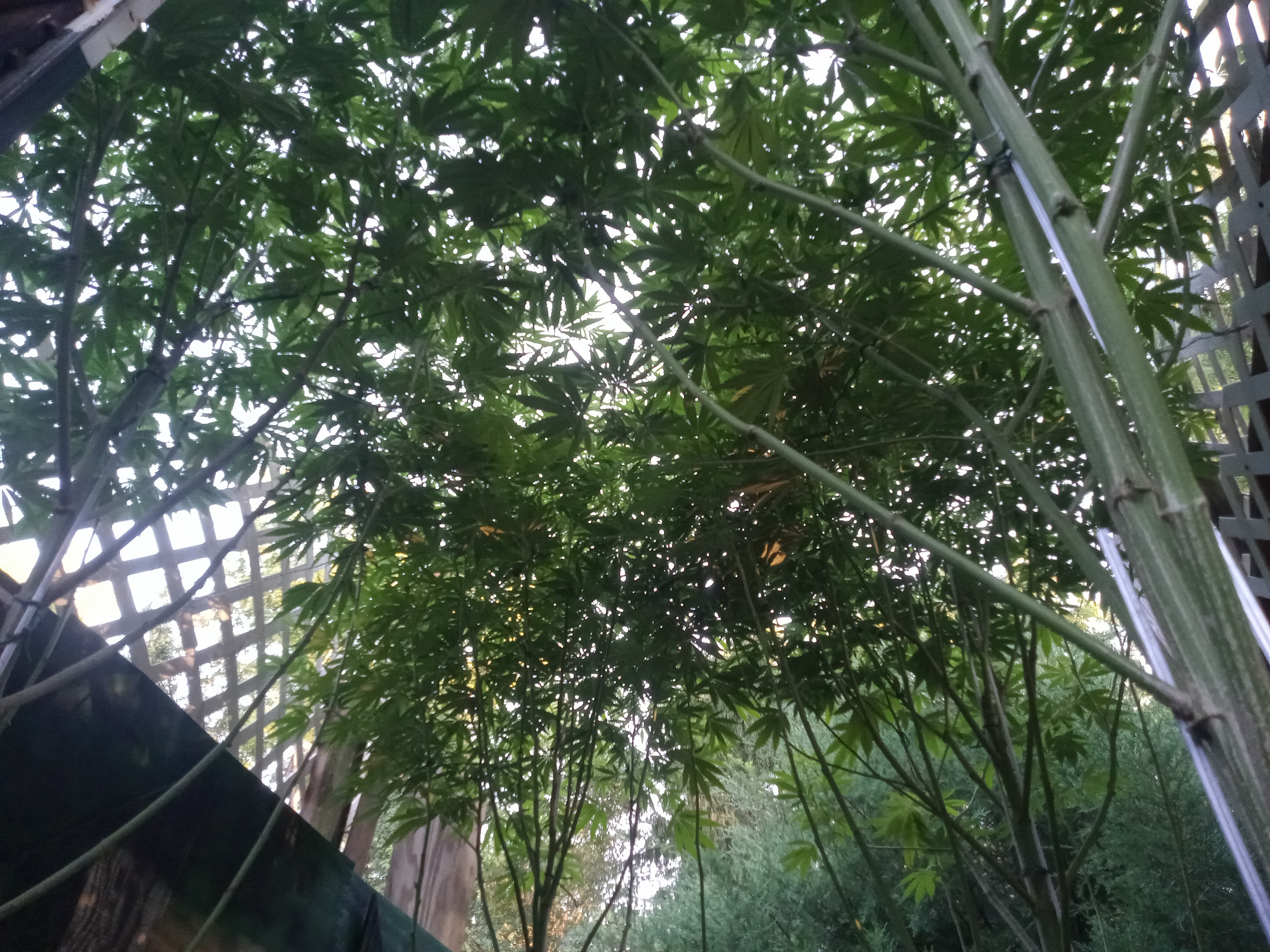 Nowhere near ready to harvest yet, but this is a pretty cool grow. In the land of giants. 8 feet tall or more. Of course, I have rigorously pruned them so really only the last two feel are producing flower, but this is certainly the most unique grow I've attempted. I used to have them on my deck, but then I had to replace the entire deck so I built this little garden for privacy.