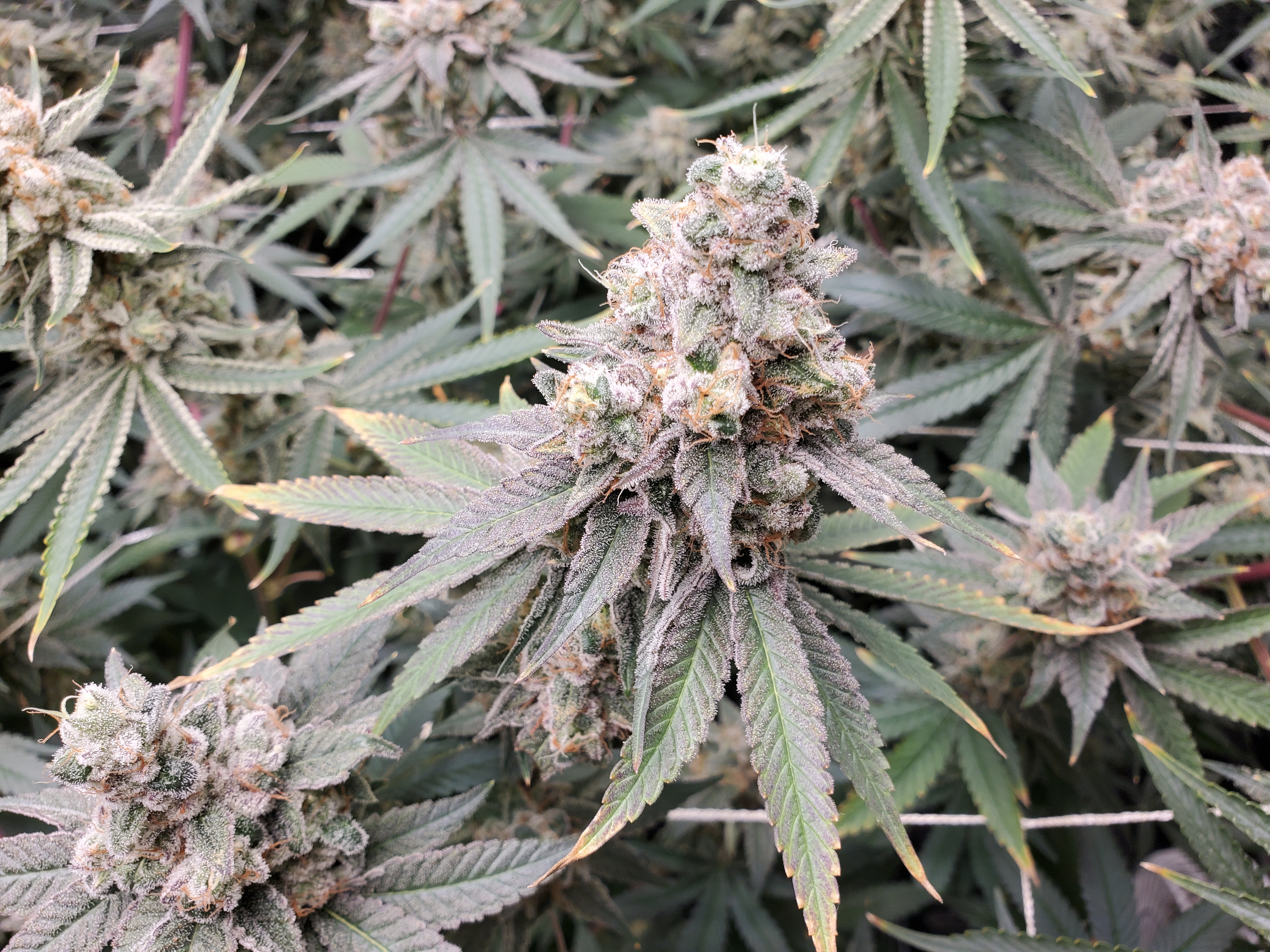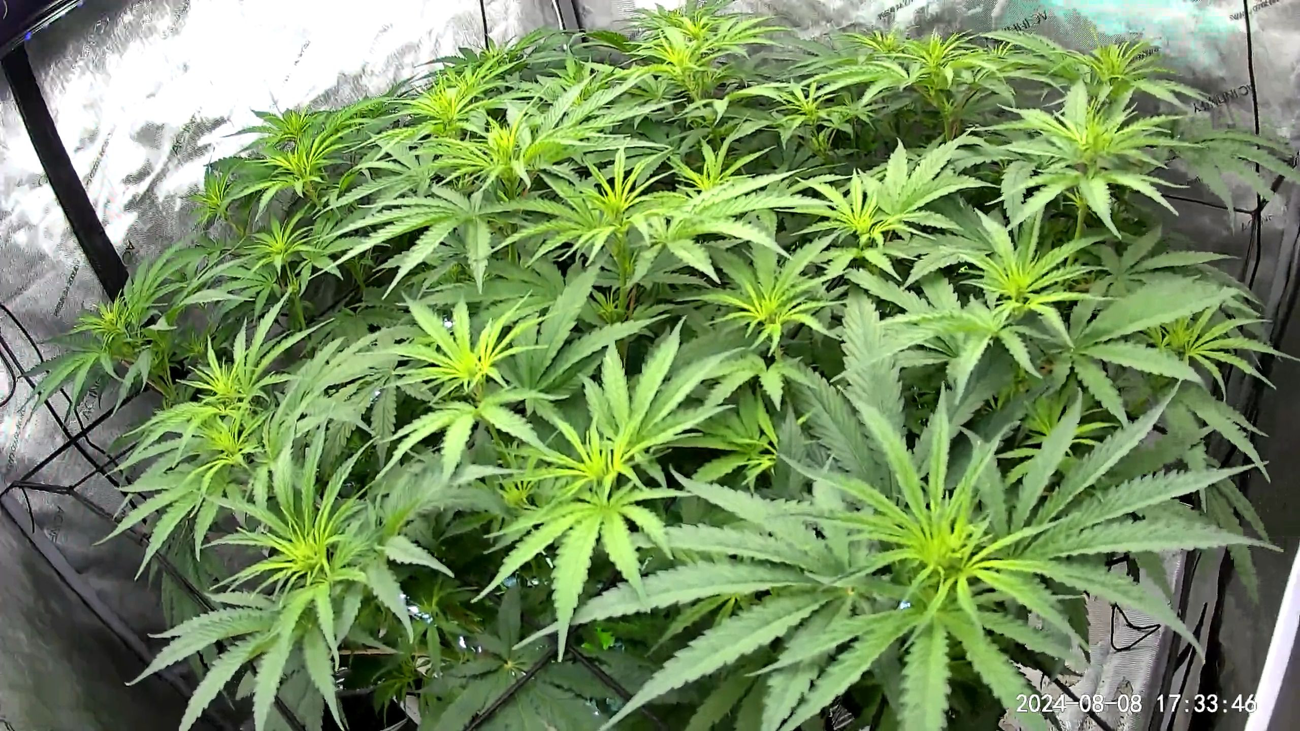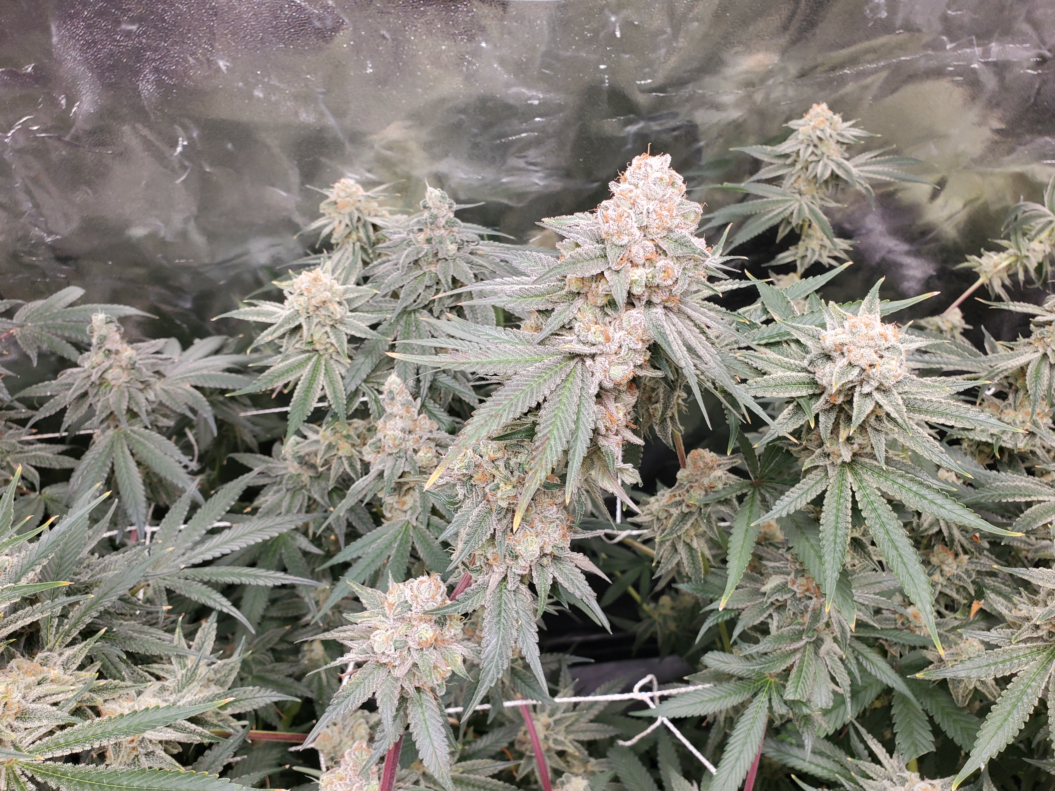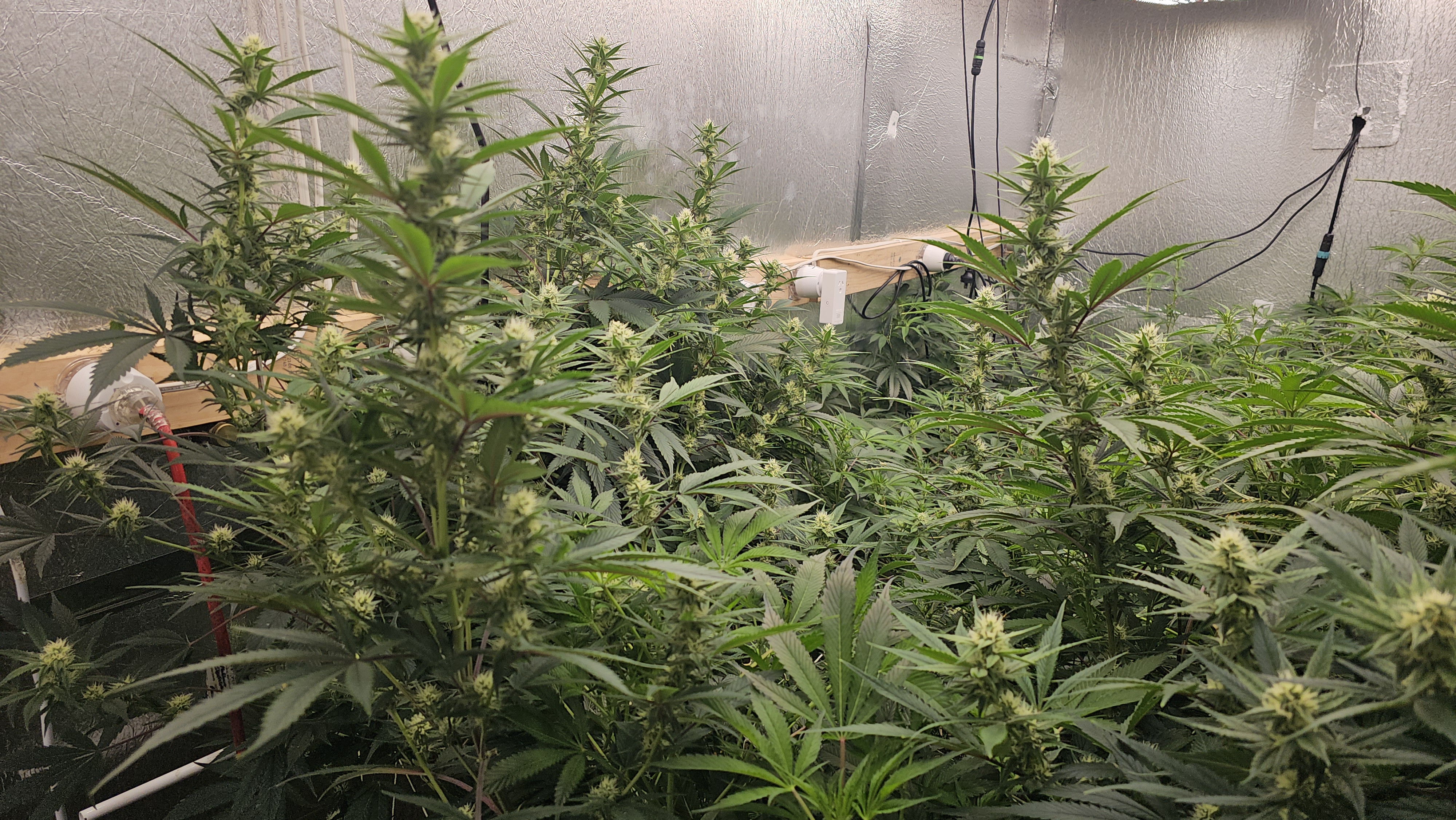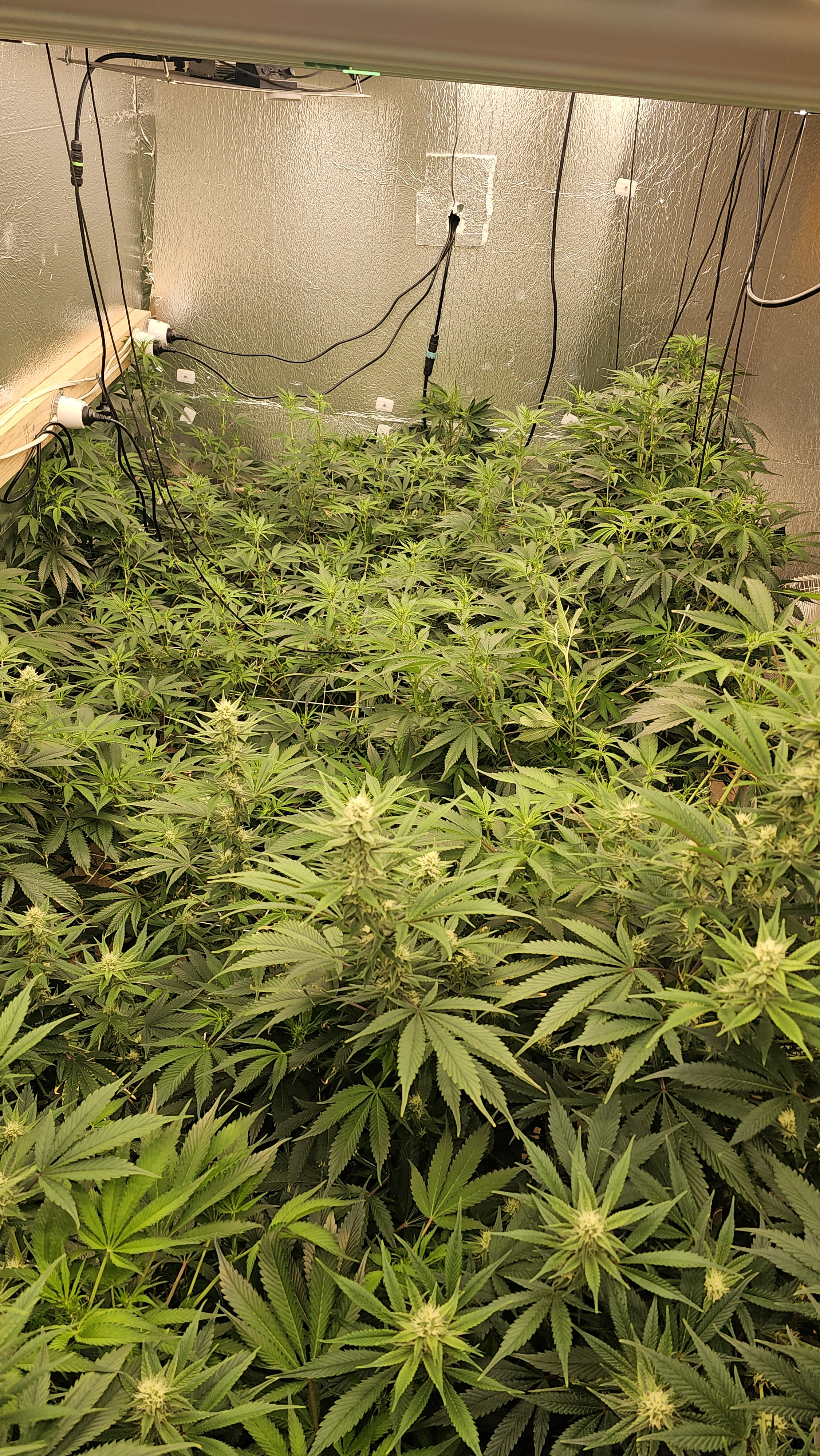 It's not a very tidy grow. 5 plants with 4 of them a 9 foot x 6 foot canopy (each plant canopy x 4 of them) makes it tough. They spent a good month too long in their veg cupboards unfortunately but I should get a decent yield from them. I've done hardly any cut back, repaired a few broken stems, the under canopy is filled with dead leaves. I'm going to lose maybe 1 main cola on each of the 4 because I couldn't get them under the lights, they have fallen outside....I've yoyo'd a few up and the one closest camera has about 6 yoyos on it stopping the main colas from collapsing.