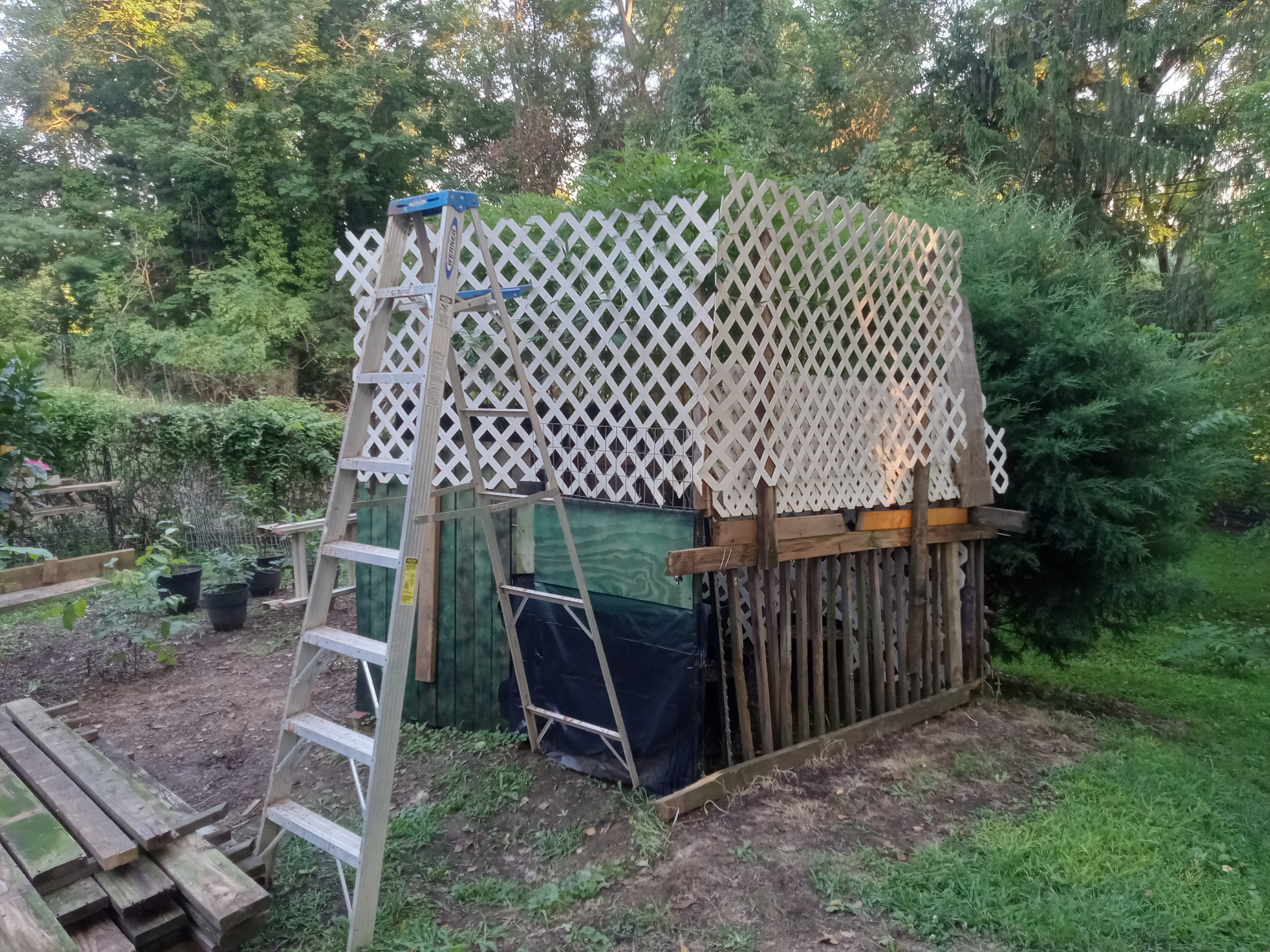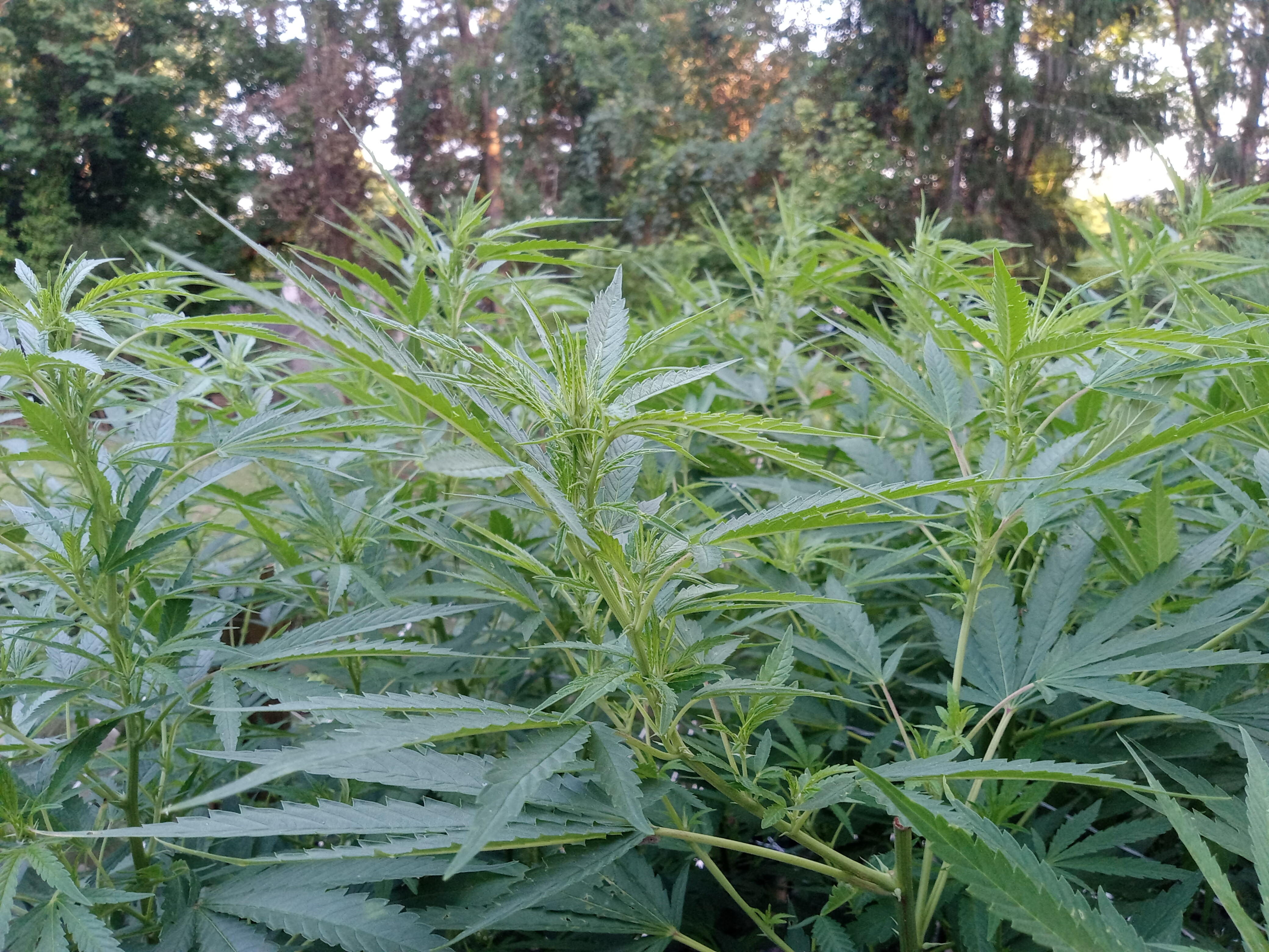 Nowhere near ready to harvest yet, but this is a pretty cool grow. In the land of giants. 8 feet tall or more. Of course, I have rigorously pruned them so really only the last two feel are producing flower, but this is certainly the most unique grow I've attempted. I used to have them on my deck, but then I had to replace the entire deck so I built this little garden for privacy.