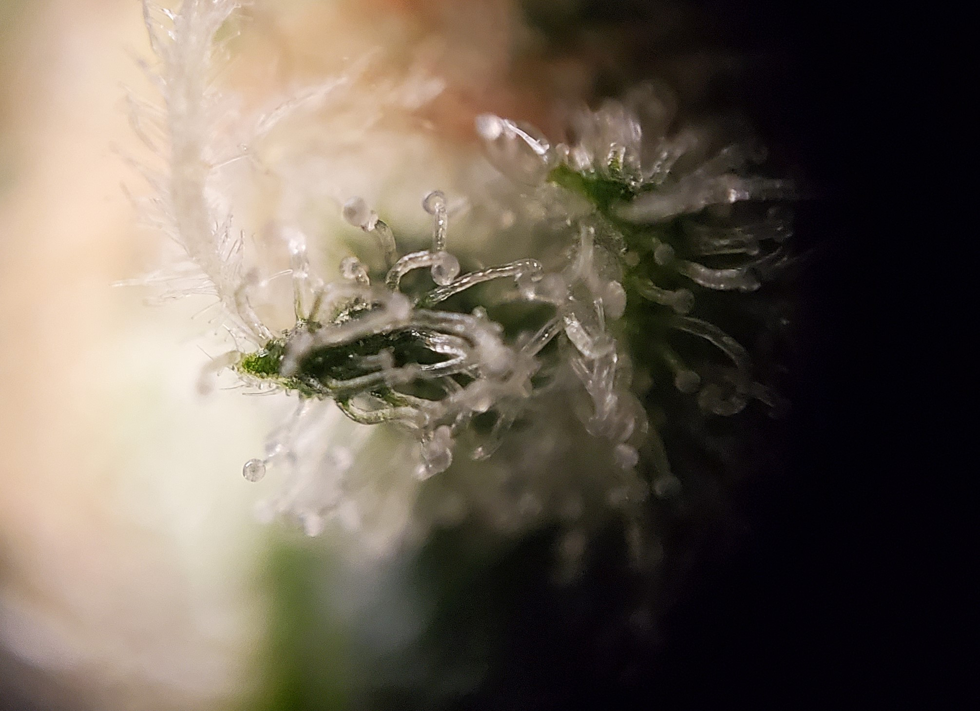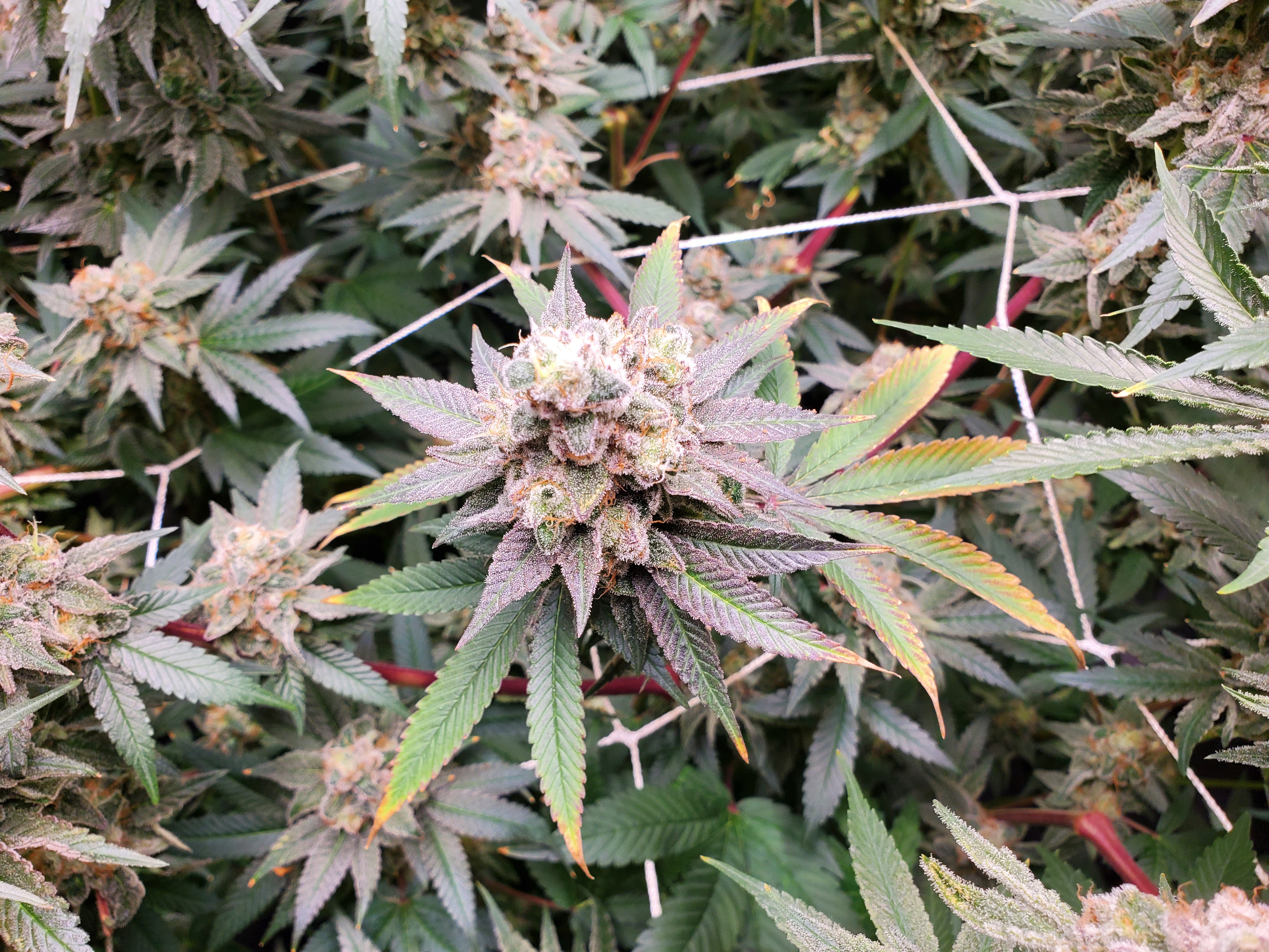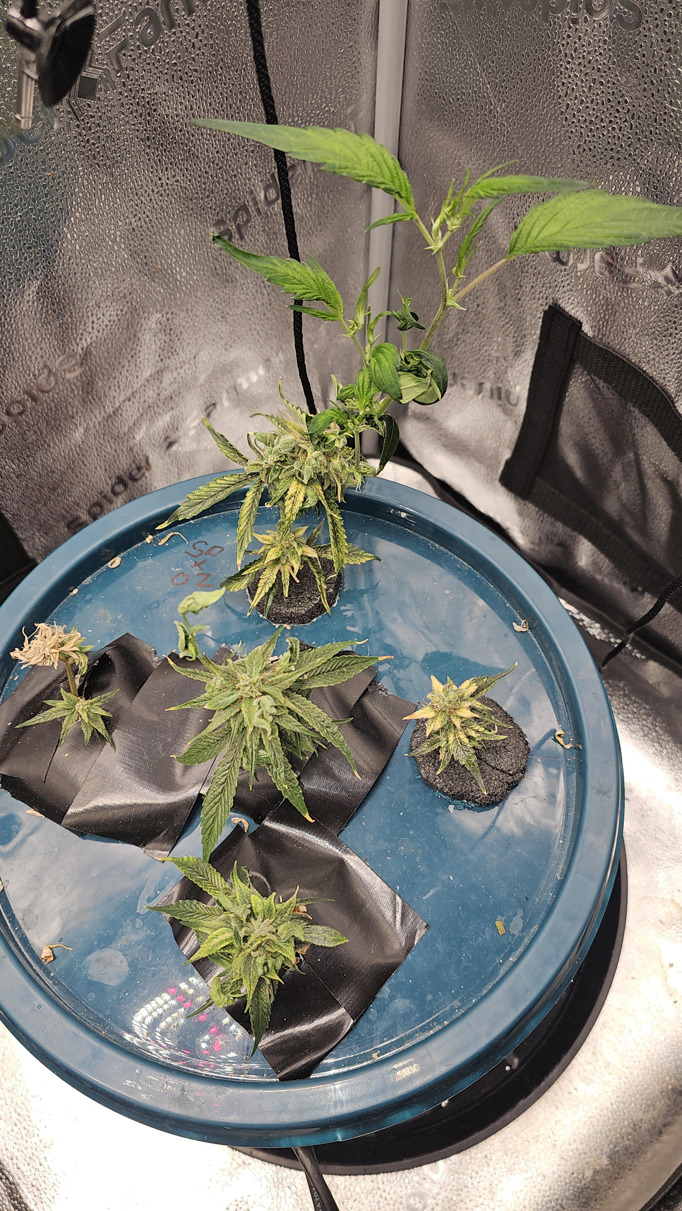 It's not a very tidy grow. 5 plants with 4 of them a 9 foot x 6 foot canopy (each plant canopy x 4 of them) makes it tough. They spent a good month too long in their veg cupboards unfortunately but I should get a decent yield from them. I've done hardly any cut back, repaired a few broken stems, the under canopy is filled with dead leaves. I'm going to lose maybe 1 main cola on each of the 4 because I couldn't get them under the lights, they have fallen outside....I've yoyo'd a few up and the one closest camera has about 6 yoyos on it stopping the main colas from collapsing.