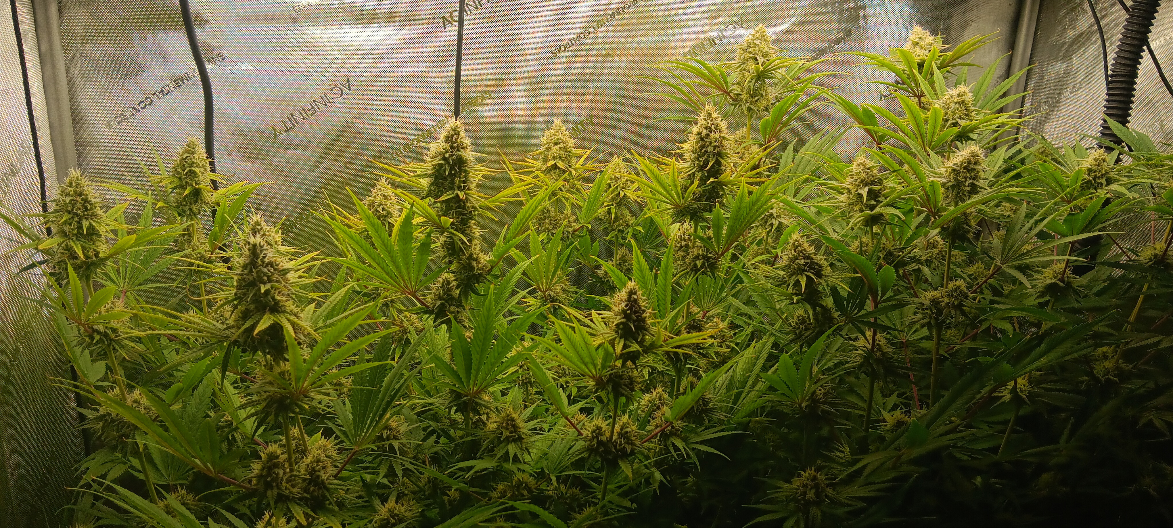 Flower Room: 11' x 7' x 7.5'H, 480w AC, 13gal/day dehumidifier, 1.5gal ultrasonic humidifier, 60gal (27gal usable) nute tank, 16" pedestal fan & 18" wall fan. Lighting and climate automated. Hand watering.