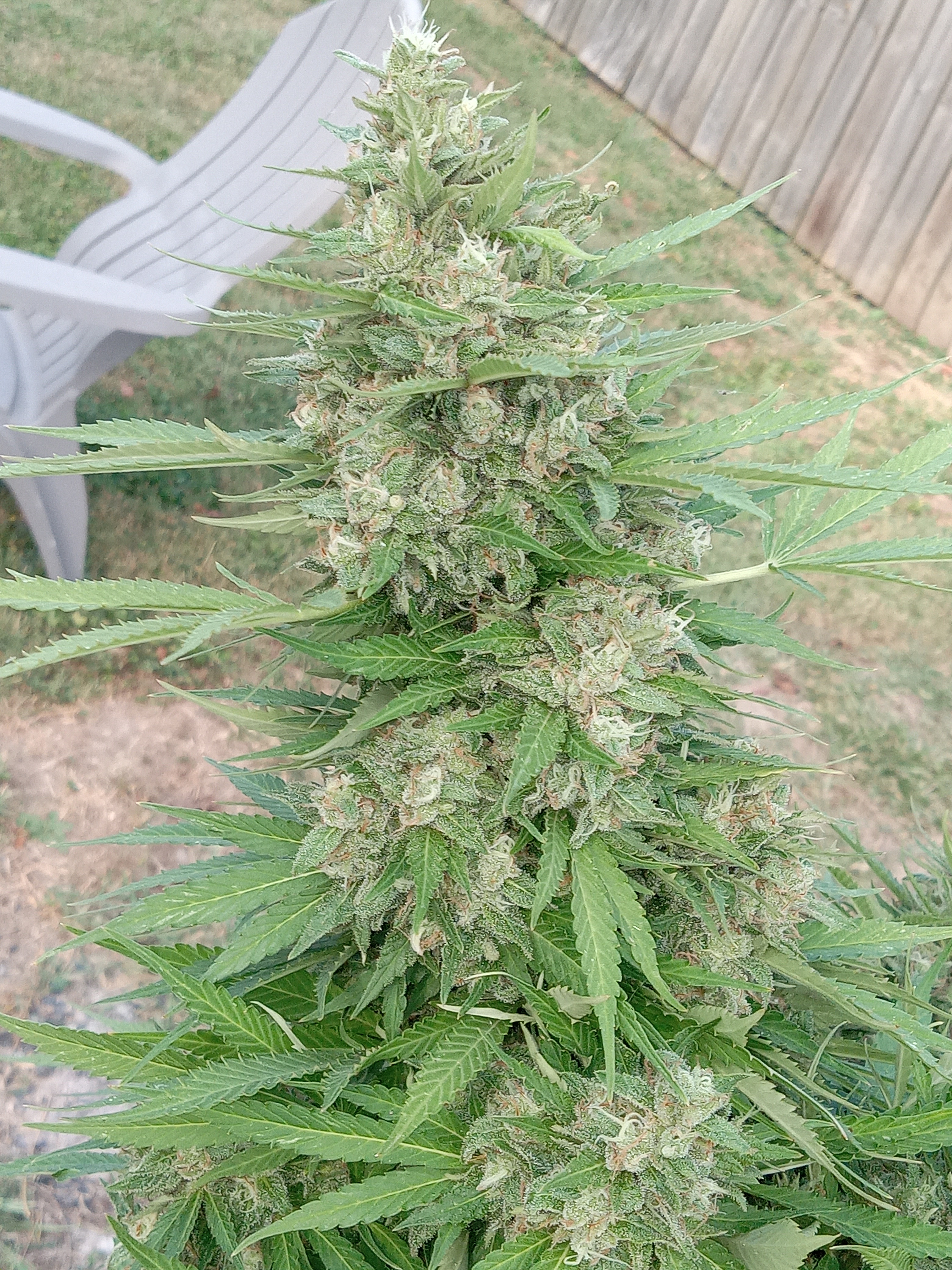 It’s time to chop my first outdoor plant. She’s a bushy fast flowering girl, and we’re fighting the dreaded bud rot. We already lost the top cola sadly, but she’s close , so cutting our loses and down she comes. Fingers crossed for what’s left of her buds.