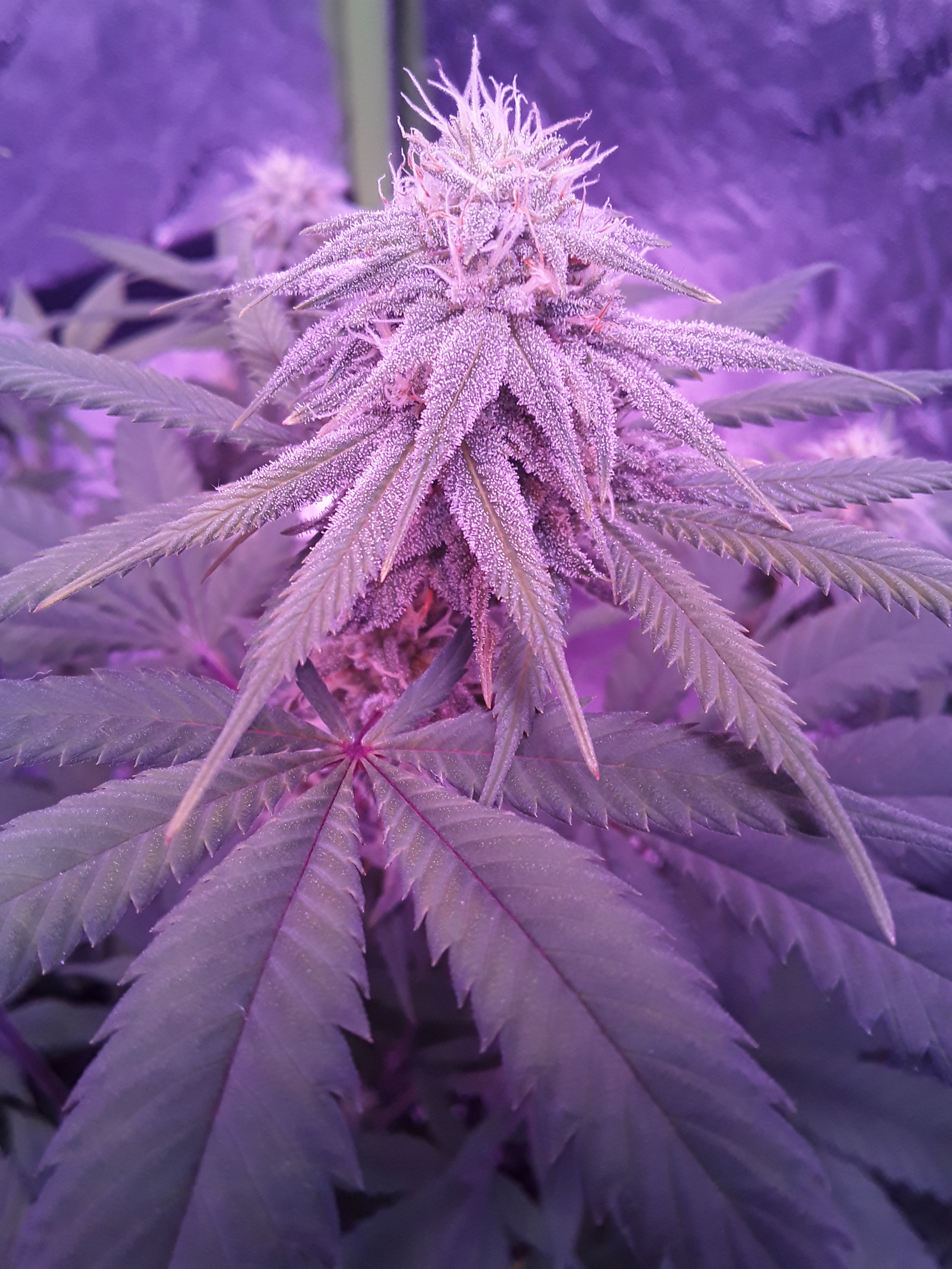 it's really purple color almost black never had that in the first black cherry punch and the other pic came from the same pkg. It's got really bright orange hairs and stayed shorter. Tall one is about 25" other 18" The 2 450vipras are now 20" from the tallest, I took it off it's riser. The shorter one I think I defoliated way to much early on but it was like a cauliflower bunched of leaves in the center so it stayed short? At this point we just want to harvest the gals they are getting last flush/drink today of unsulfurated molasses 1/2 gal ea. Then next weekend i'm going to harvest