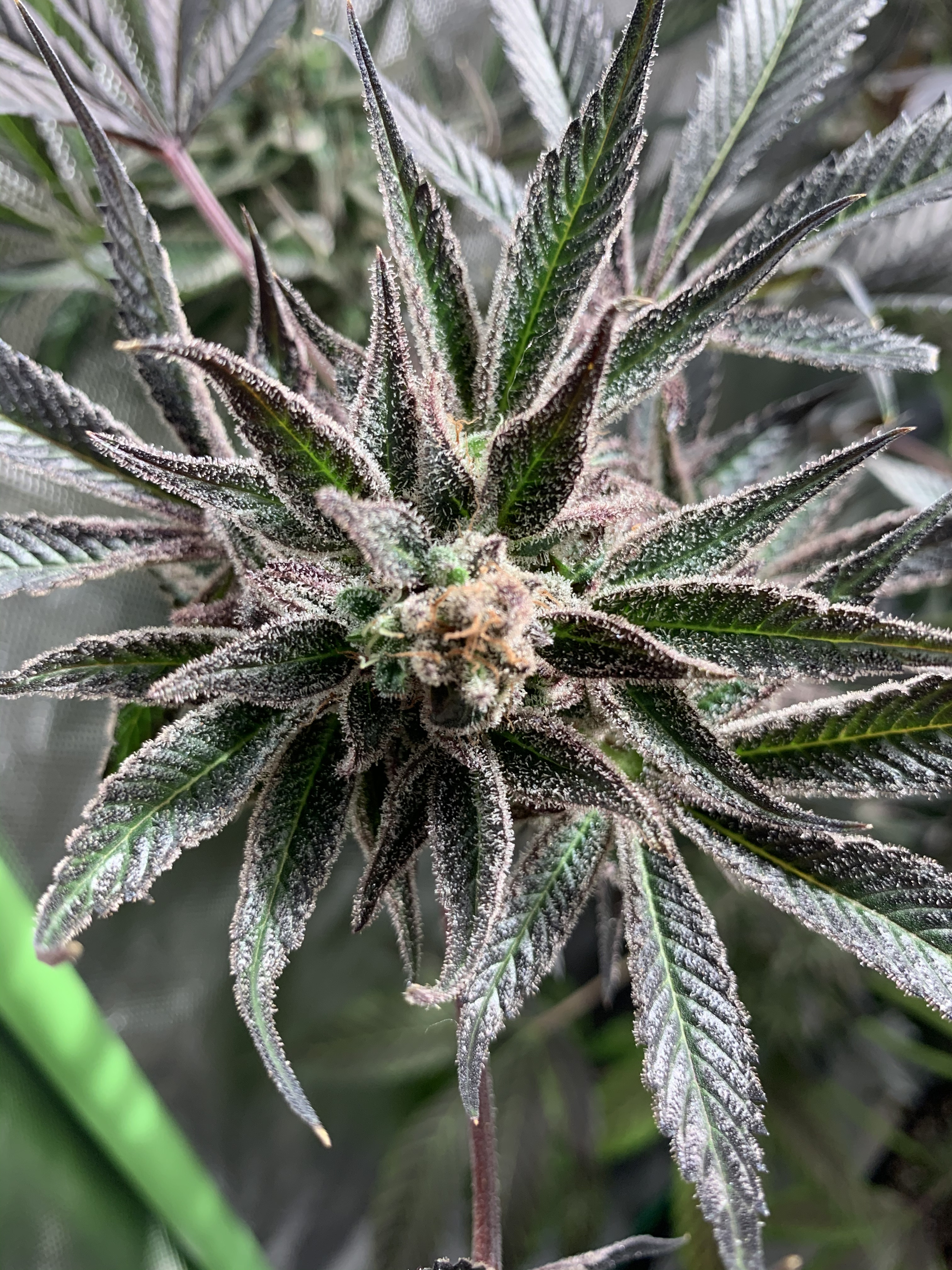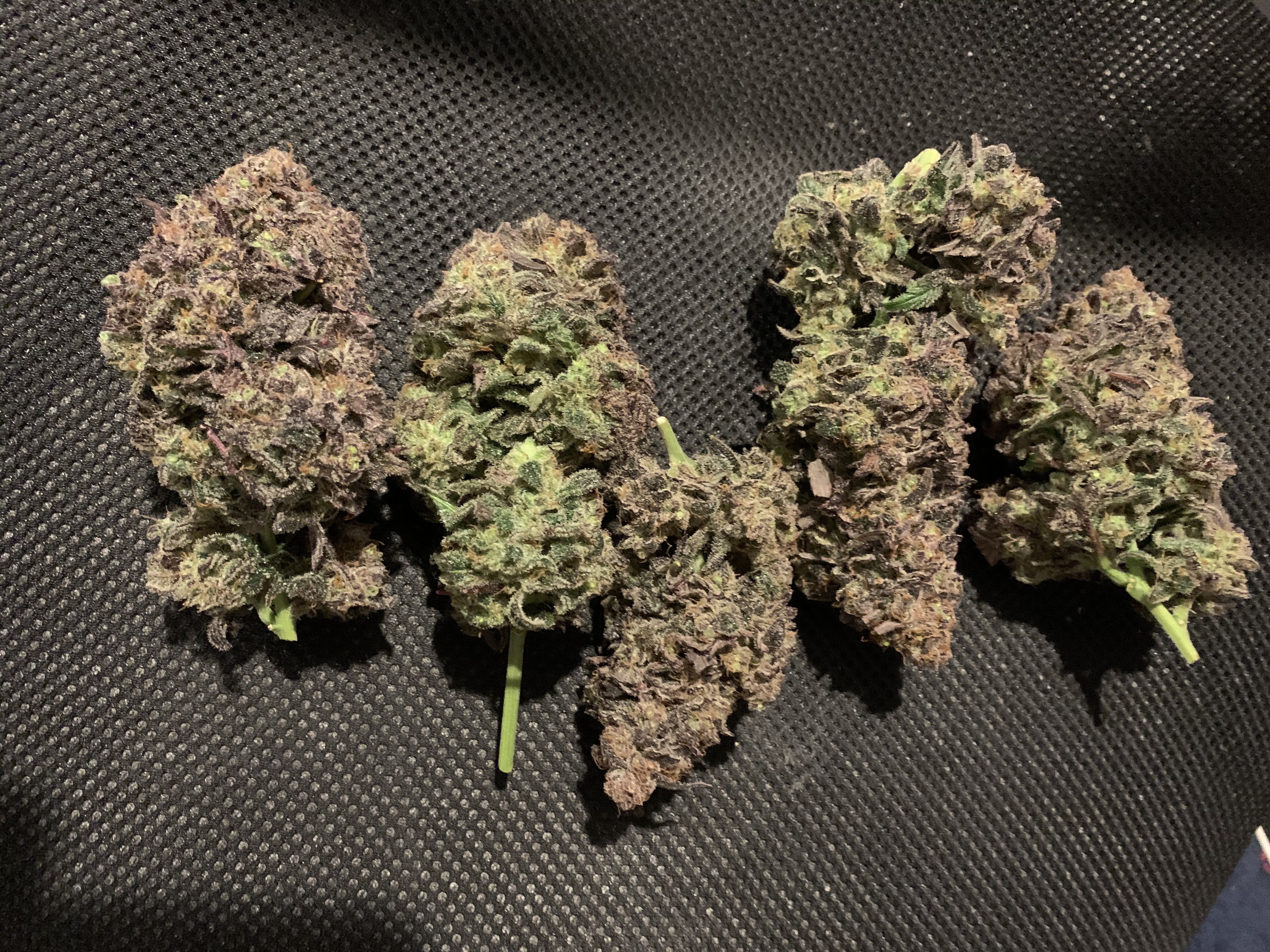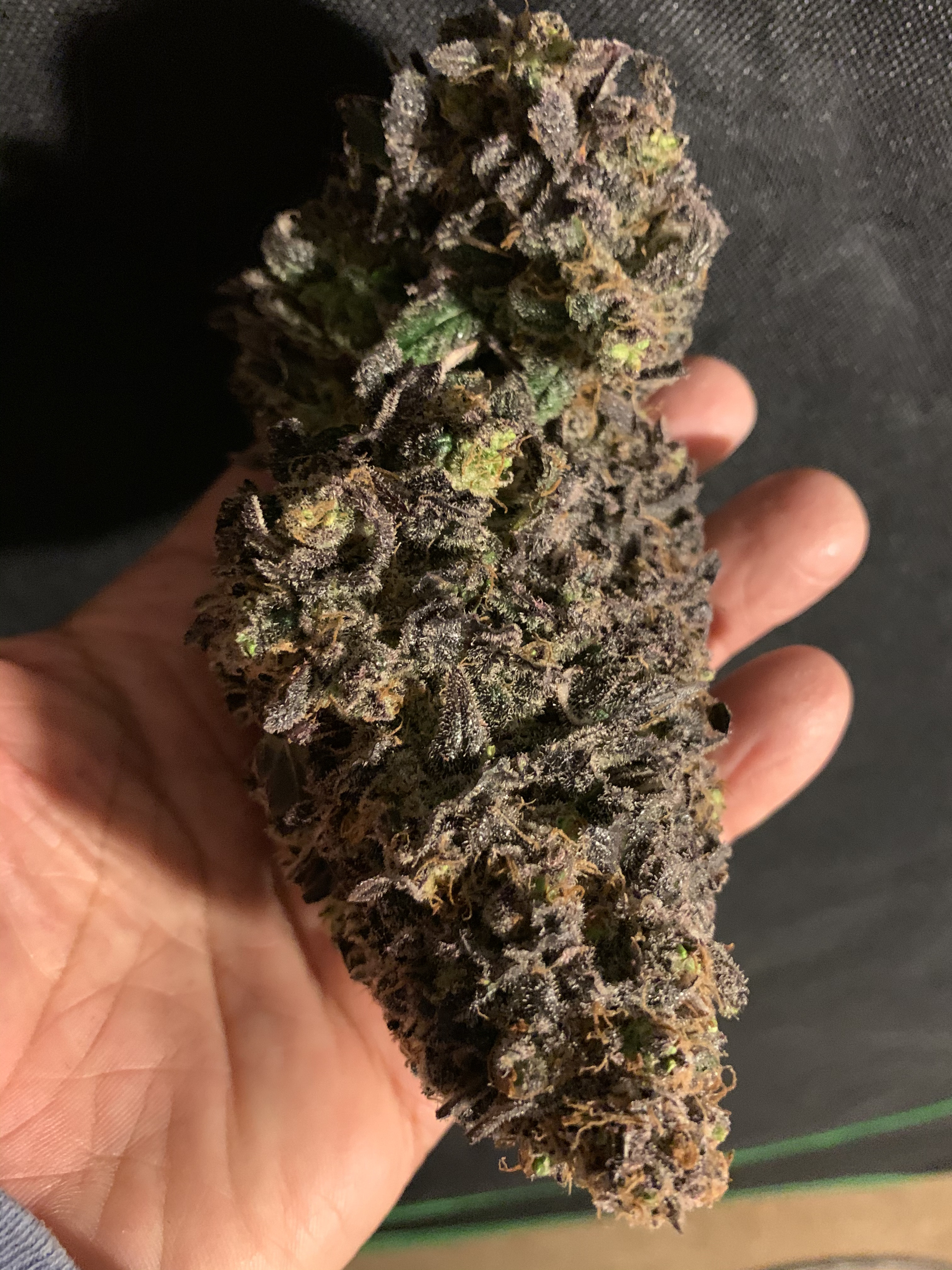 YYCannabis I topped and spread and tied down till about a month ago then I released the tie downs and it did that it's really purple color almost black never had that in the first black cherry punch and the other pic came from the same pkg. It's got really bright orange hairs and stayed shorter. Tall one is about 25" other 18" The 2 450vipras are now 20" from the tallest, I took it off it's riser. The shorter one I think I defoliated way to much early on but it was like a cauliflower bunched of leaves in the center so it stayed short? At this point we just want to harvest the gals they are getting last flush/drink today of unsulfurated molasses 1/2 gal ea. Then next weekend i'm going to harvest