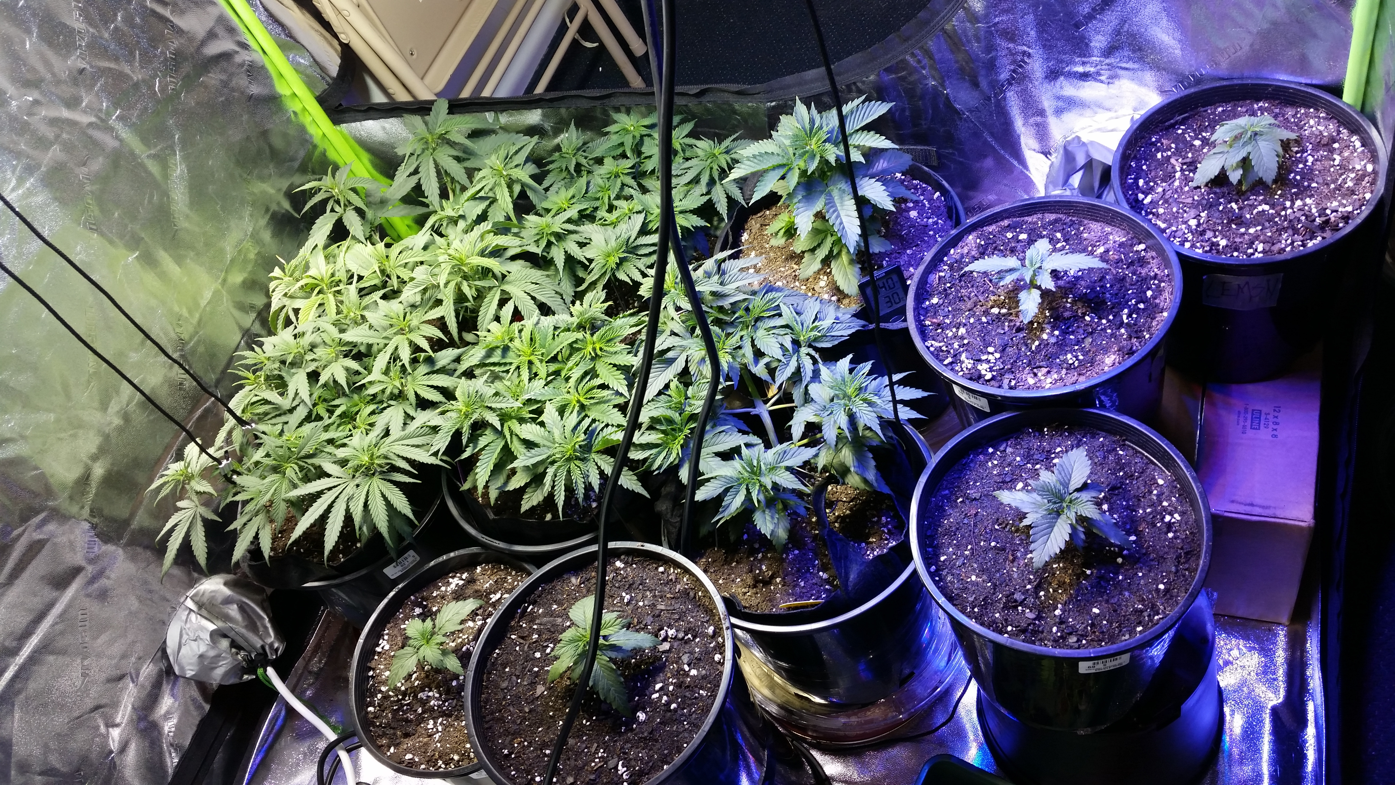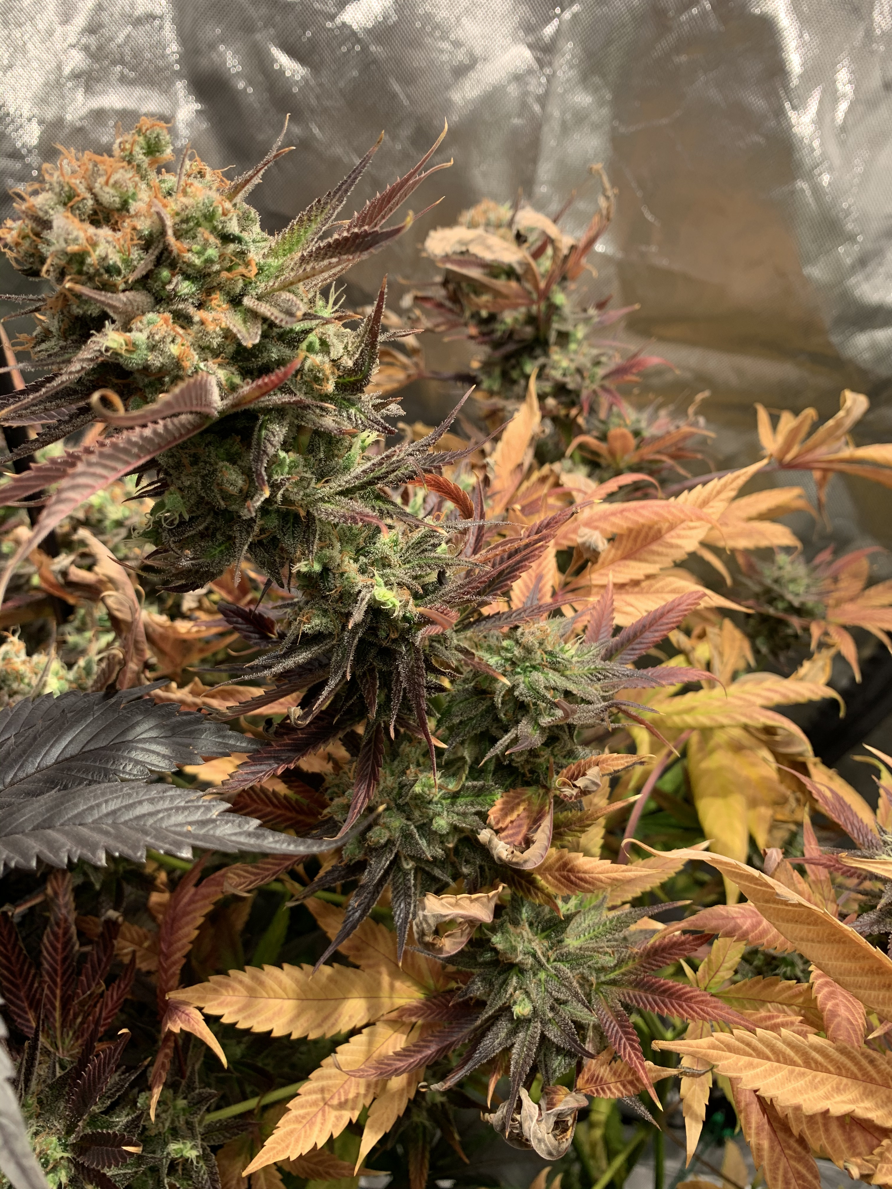 it's really purple color almost black never had that in the first black cherry punch and the other pic came from the same pkg. It's got really bright orange hairs and stayed shorter. Tall one is about 25" other 18" The 2 450vipras are now 20" from the tallest, I took it off it's riser. The shorter one I think I defoliated way to much early on but it was like a cauliflower bunched of leaves in the center so it stayed short? At this point we just want to harvest the gals they are getting last flush/drink today of unsulfurated molasses 1/2 gal ea. Then next weekend i'm going to harvest