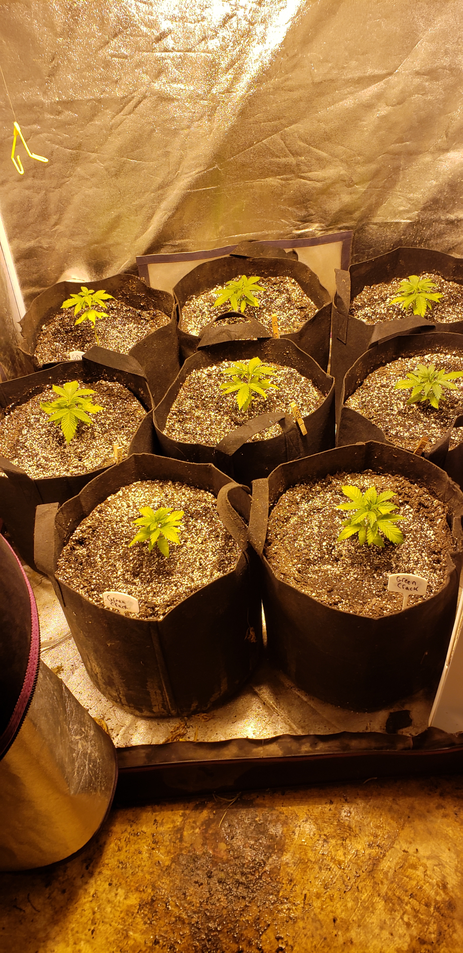 Here is my current grow. There are 2 Original Glue from Nirvana seeds, 2 Granddaddy purp from MSNL, 2 green crack from MSNL, and 2 Space Needle from Calyx. All in 15 gallon fabric pots. They were just repotted friday I think.