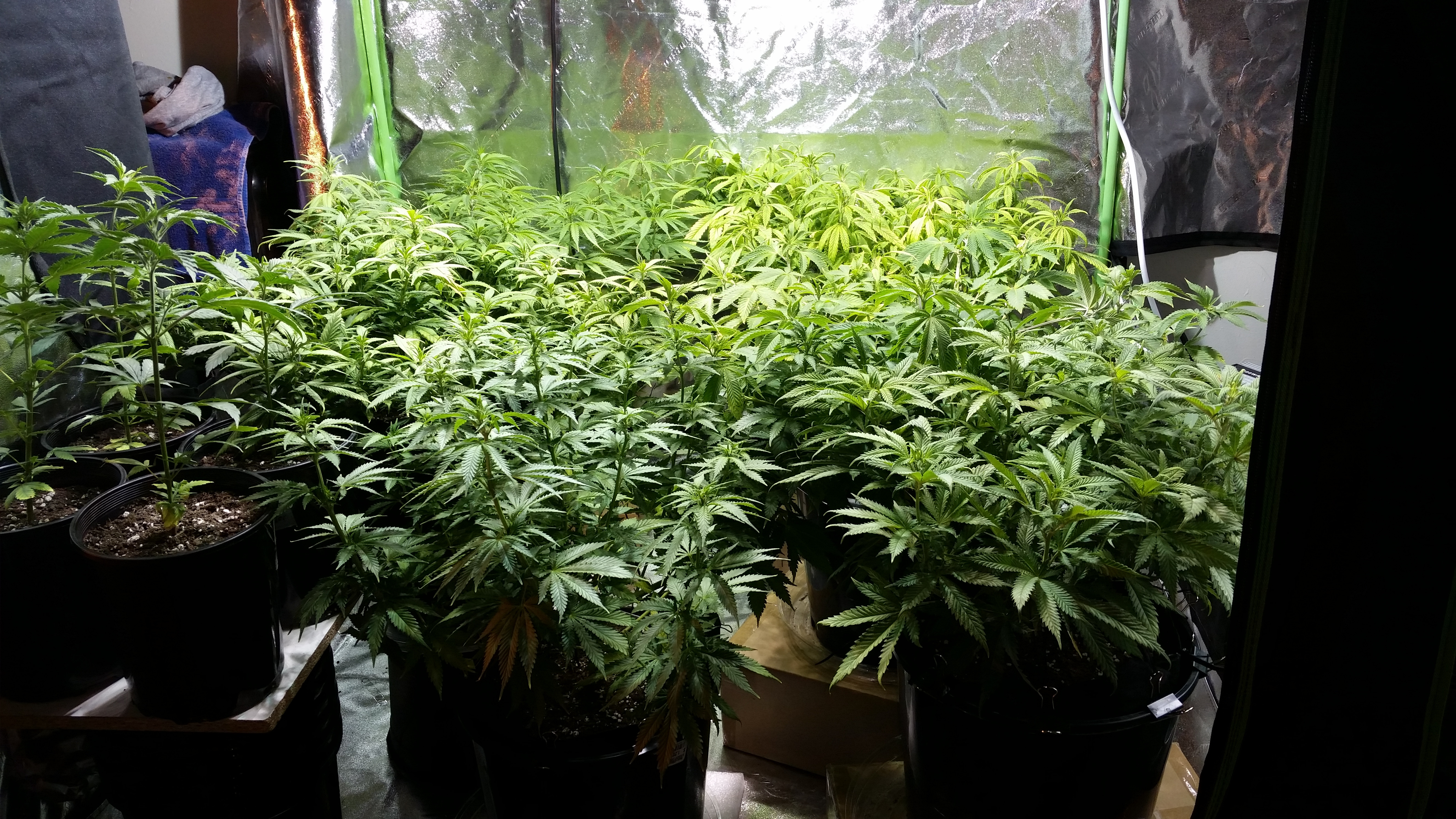 The tent is still a mess and the plants had a hard month being cramped and going longer than expected in small pots not to mention trying to learn what 8 different strains like as far as light, training, defoliating, nutrients, etc. It does look a bit better though and now I can give them a bit of individual TLC so I can flip them this weekend.