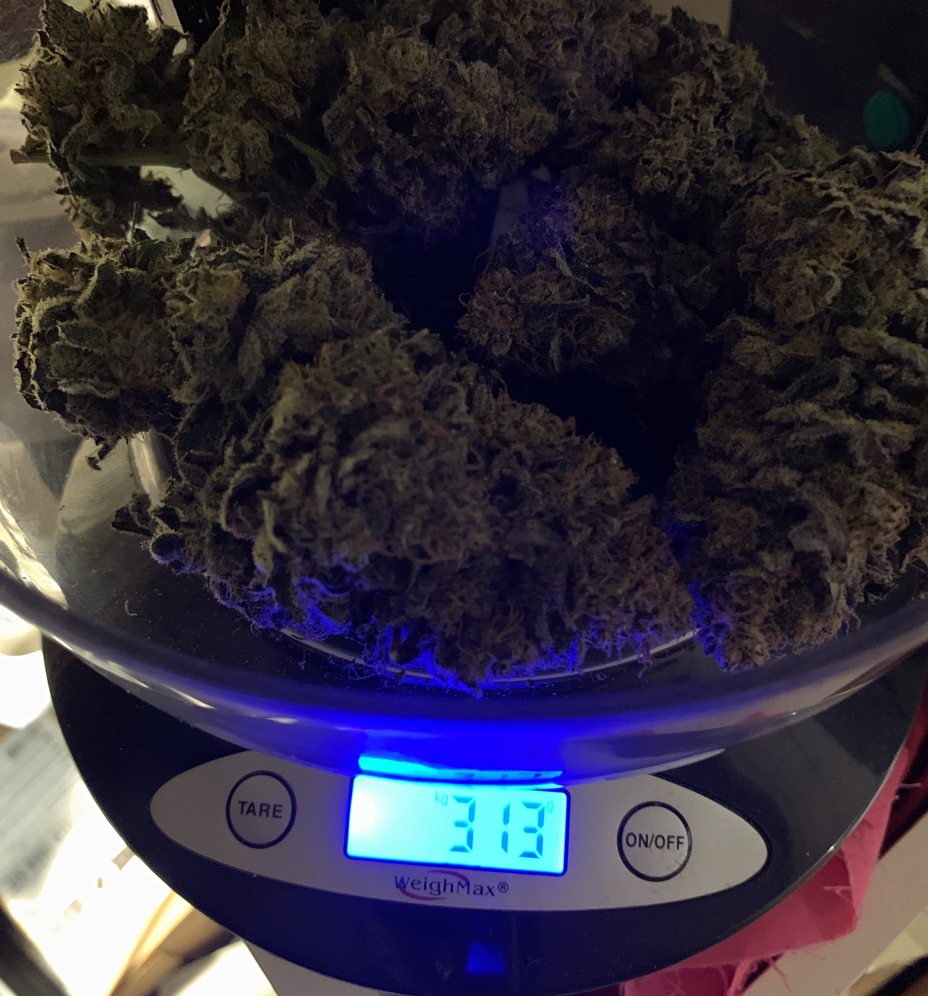 5 days ago these 5 buds weighed in at 590g wet. They’ve been hanging in the dark and are now are 313g. Probably still need to dry a touch more but they’ve only lost about 45% of their original weight. Click image for larger version