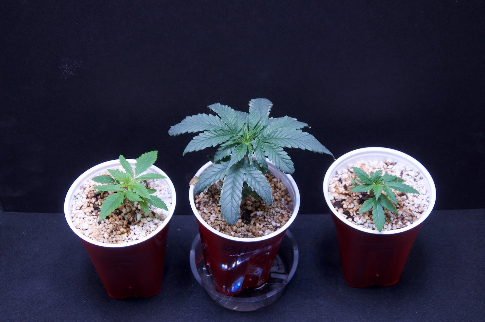 At 3 and 5 weeks I have the grow cup challenge going. Left to right is the Big Bud feminized plant I originally wanted as my main contender, but seeds arrived two weeks late; in the middle is the only seed I had available on Jan 1, an unsexed White Widow Extreme (AMS). Hoping for a girl. On the right an Amnesia Trance Feminized (AMS) I planted at the first of the year, but had a cap problem as a seedling, so it is a weirdo. Also a photo of them in their nursery.