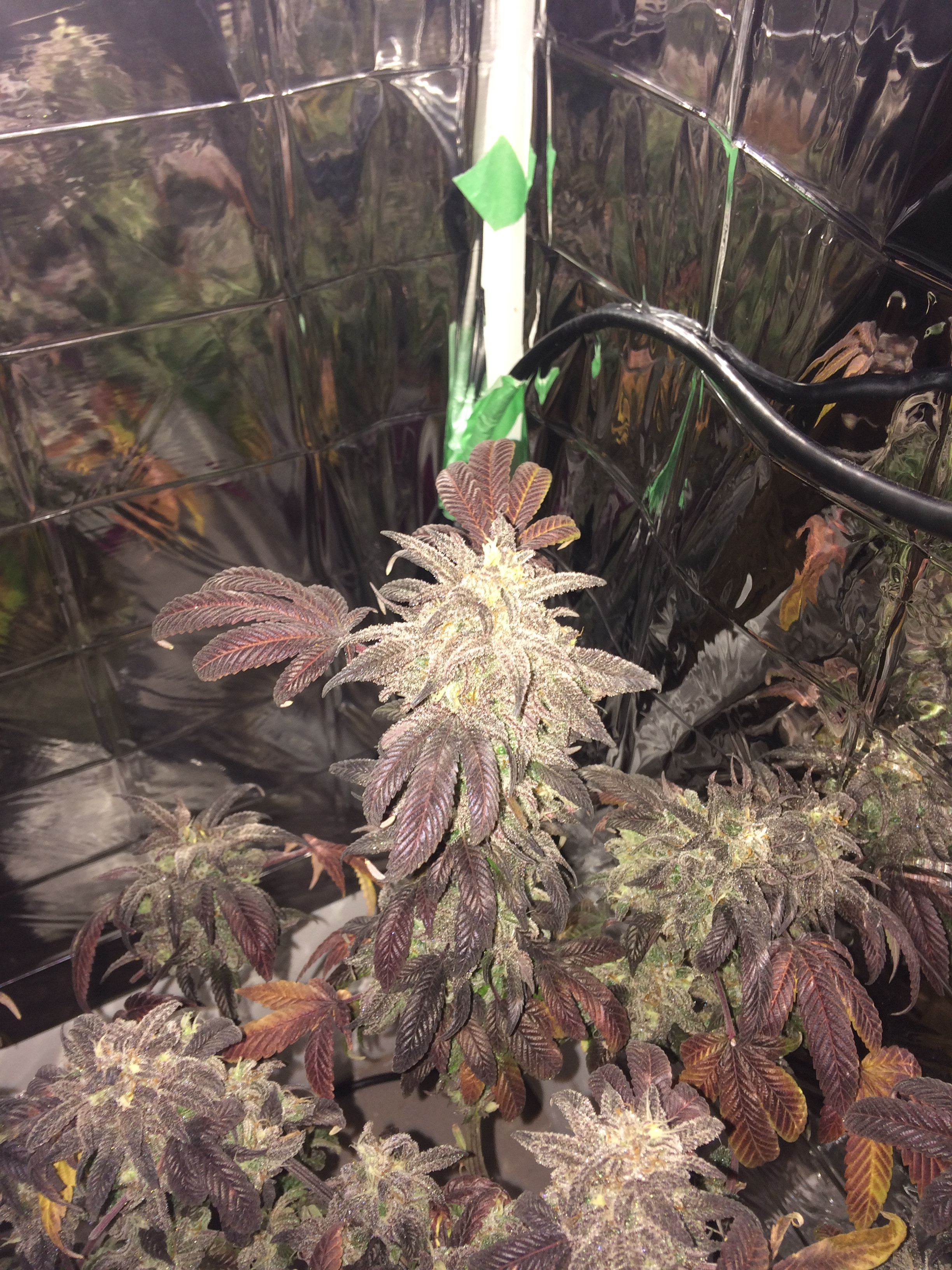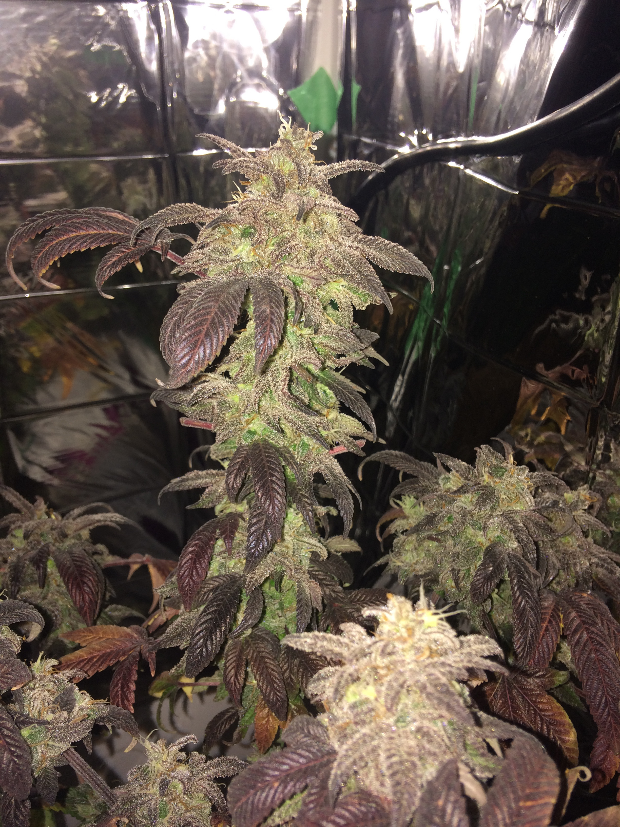 these are pictures of my two sativa zamerelda I have 3, one is a runt ,the plant in the first 3 pics is one I broke one of the stems off so its a 3 way manifold ,I left some inner branches and am in the process of training them into the open space4 Photosnew grow room built summer of 2017 ,argo max tent for veging ,big kahuna reflector, 1000hps with added leds for the full spectrum . 15th indoor grow ,5 years outside gorilla grows(stealth is the key),veg under t5s growing autos under 300w leds