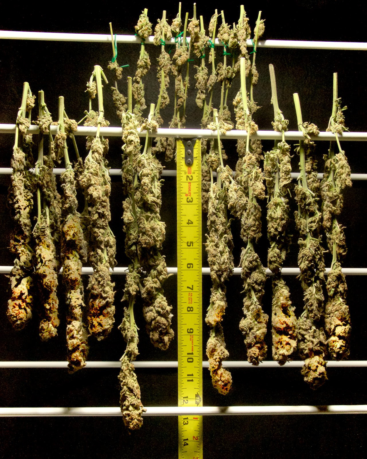 This 12-week old White Widow Extreme has been hanging out in the vegetation cabinet, and will to the double-wide 12/12 tomorrow. I've just freed them from their training wires so the tops appear a bit uneven. I'll adjust in the new location. There is one bud on the right that got too close to the Vipar 450 Dimmable LEDs. It was at 6" below the lights. The other branches an inch or two shorter are unaffected. I'm getting familiar with the limits of this light. So, I'm happy.