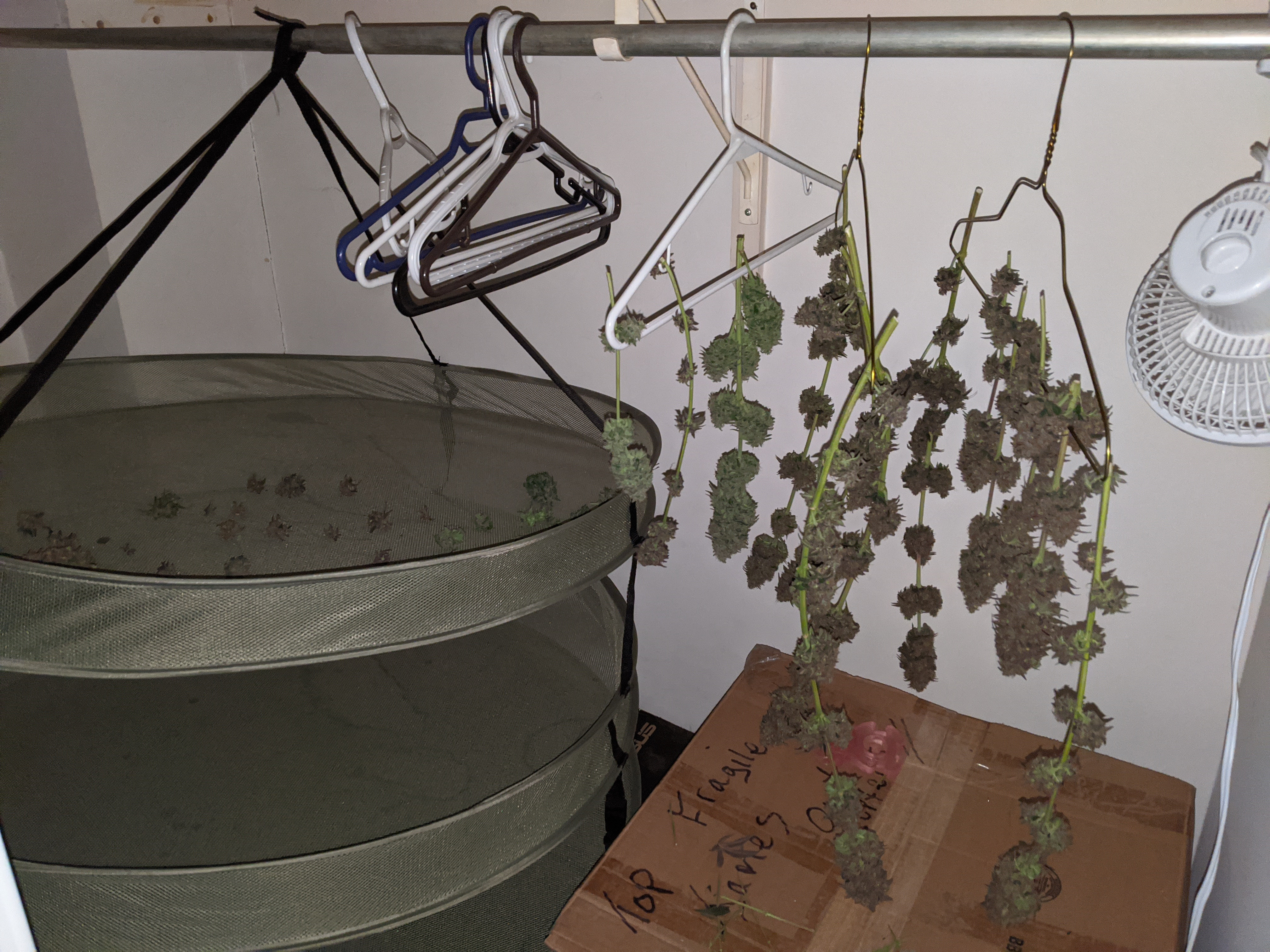 And finally -- so sad -- I cut and hung my good 17-week old Amnesia Trance (AMS) friend like Ed Gein treated his neighbors. I'm at about 370 grams after 5 days of drying. Once fully dried down and cured to what? 100-130 gram range. I think Il have a pretty decent yield for my 213-watt draw Vipar in my 2'x2' cabinets. We'll see. First full grow using GWE guidance.