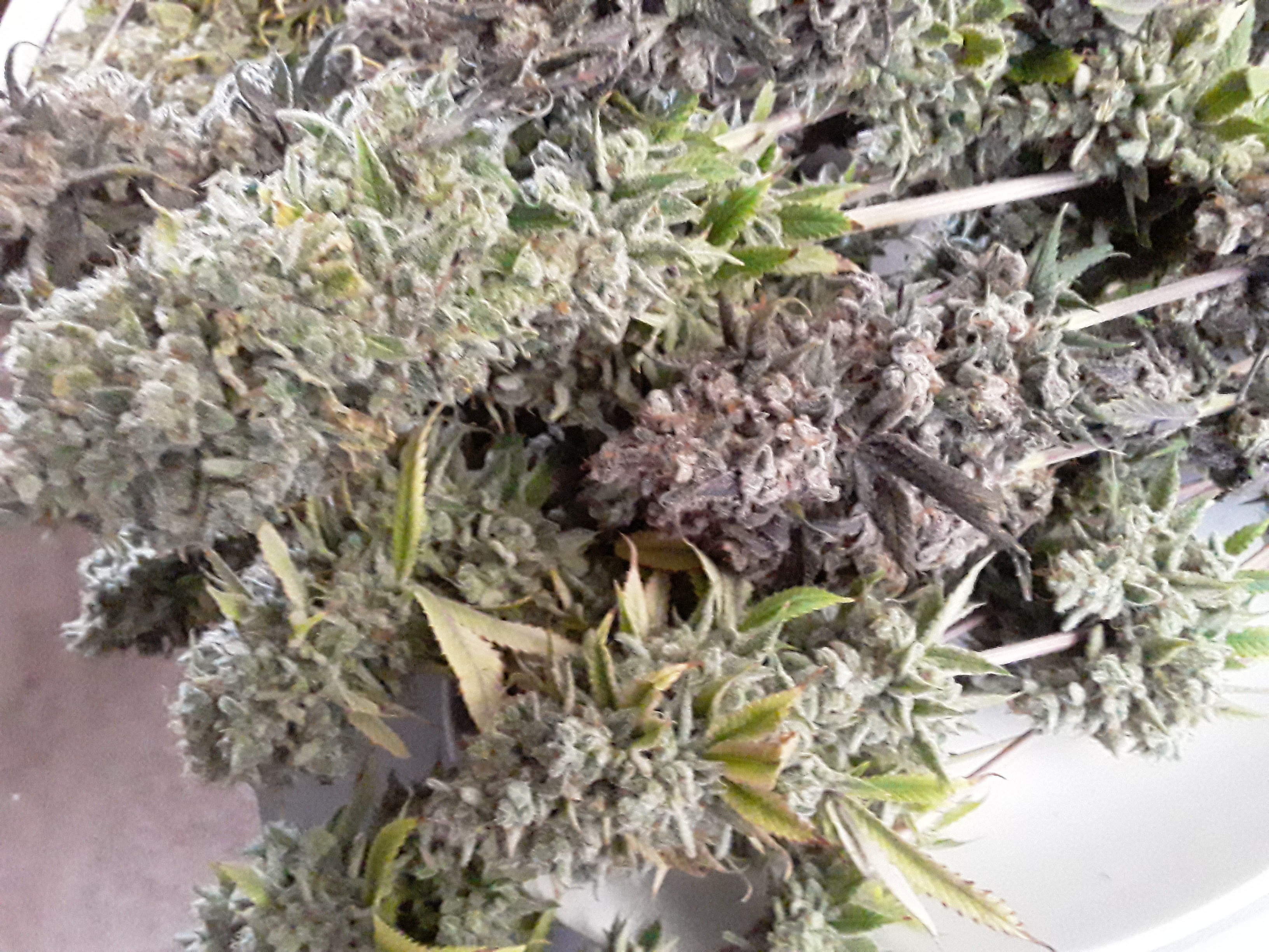 Afternoon just wanted to show how my auto flower Durban poison looked pre and post harvest. That tent pic sure brought out the yellow sorry if the pics are blurry on the above head shot but she was very sticky to trim first auto I have done that was mostly a success so i'm happy with her I may of got 2oz not sure but heck of a lot better than the 4-5 prior. I tried to turn the center pic right but another fail