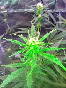 Blue Dreams on the right and an unknown strain on the left...day 14 since switching to 12/12...Coco/perlite in 3 gallon fabric pots...3x3x6' Vivosun tent... TerraBloom 390cfm fan...2x154 watt and 2x45 watt LED lights...using a variety of nutrients mostly from Advanced Nutes (gotta love the pH perfect)... topped and supercropped early in veg. Only light defoliation since then.