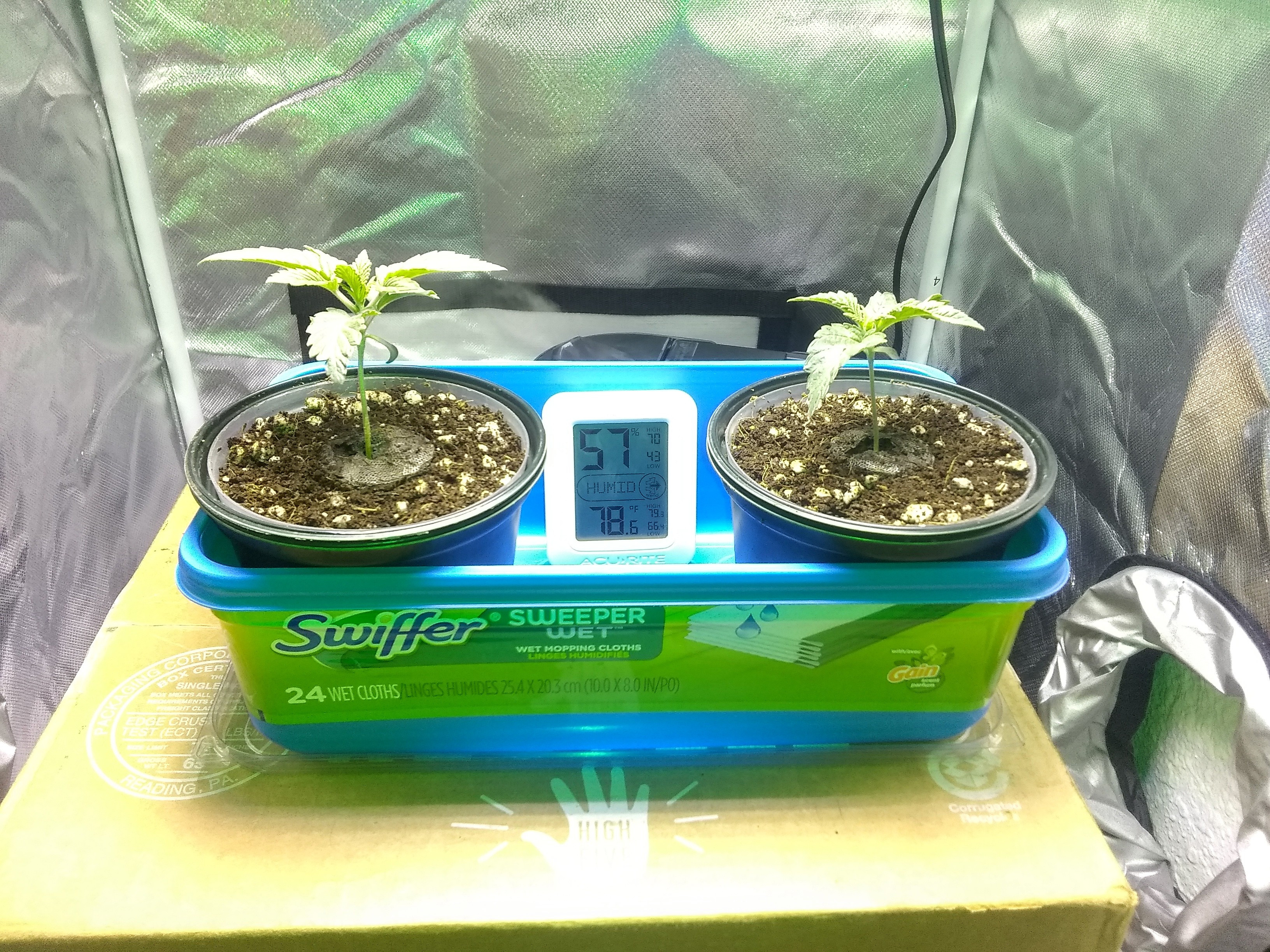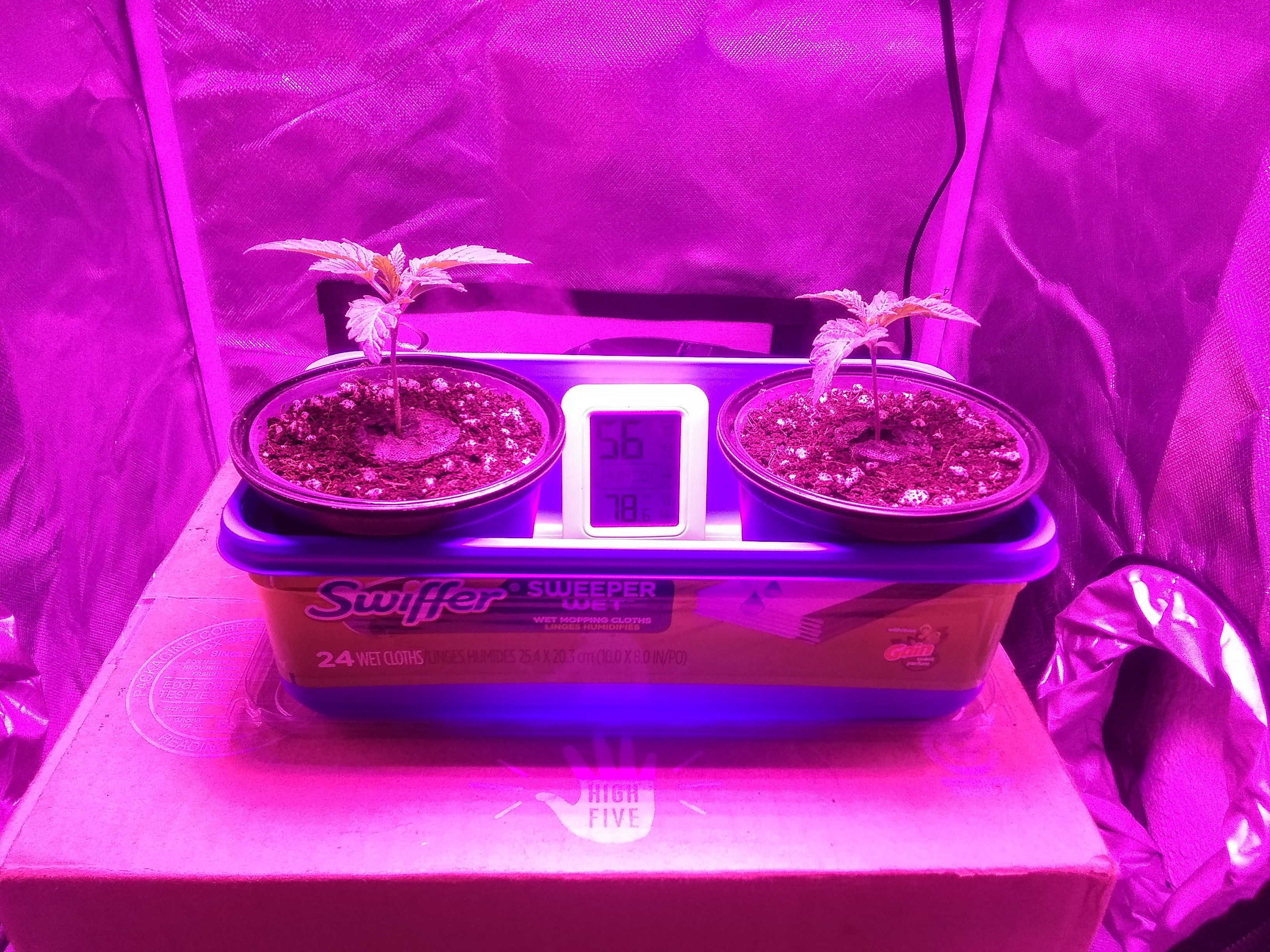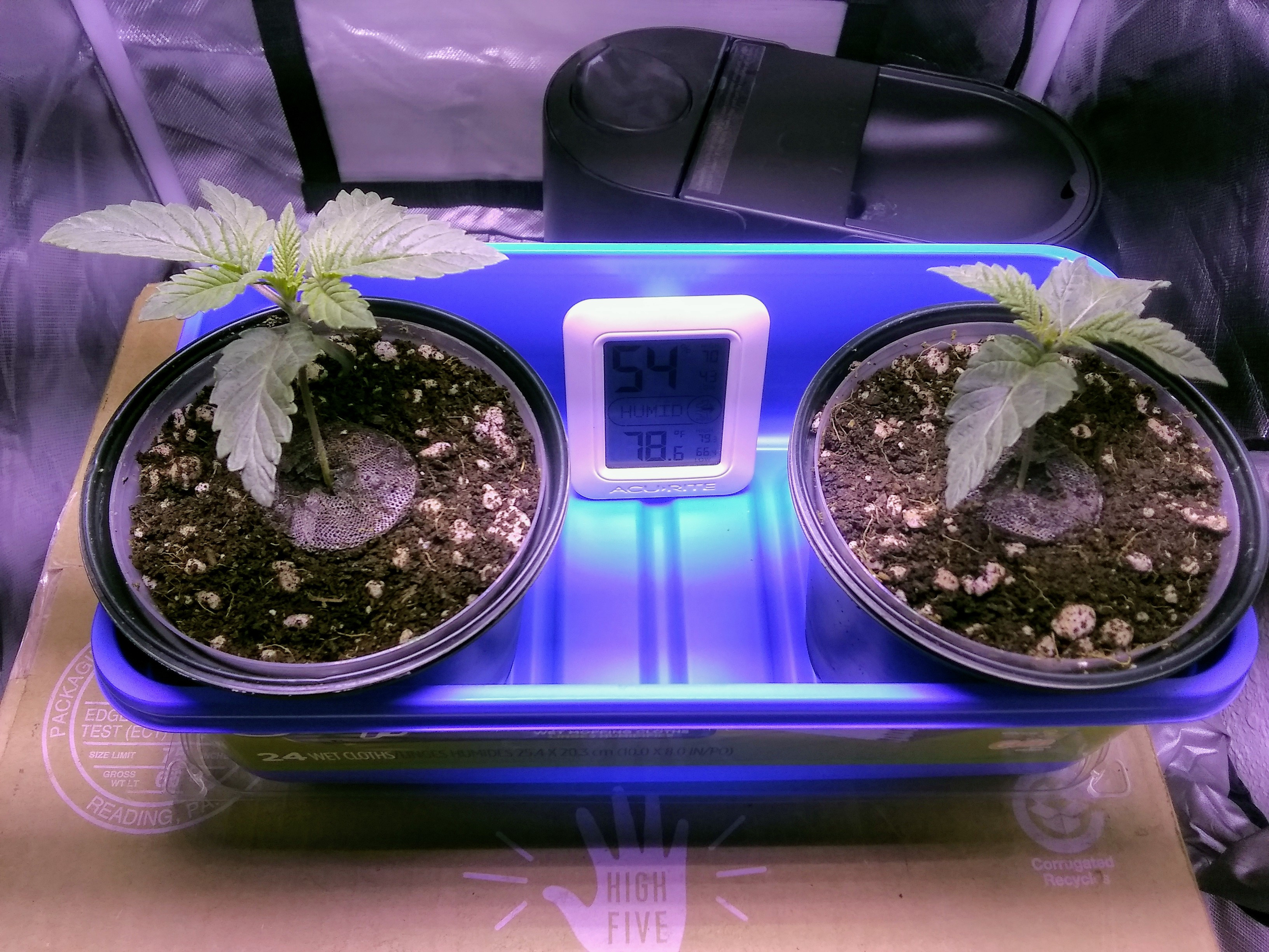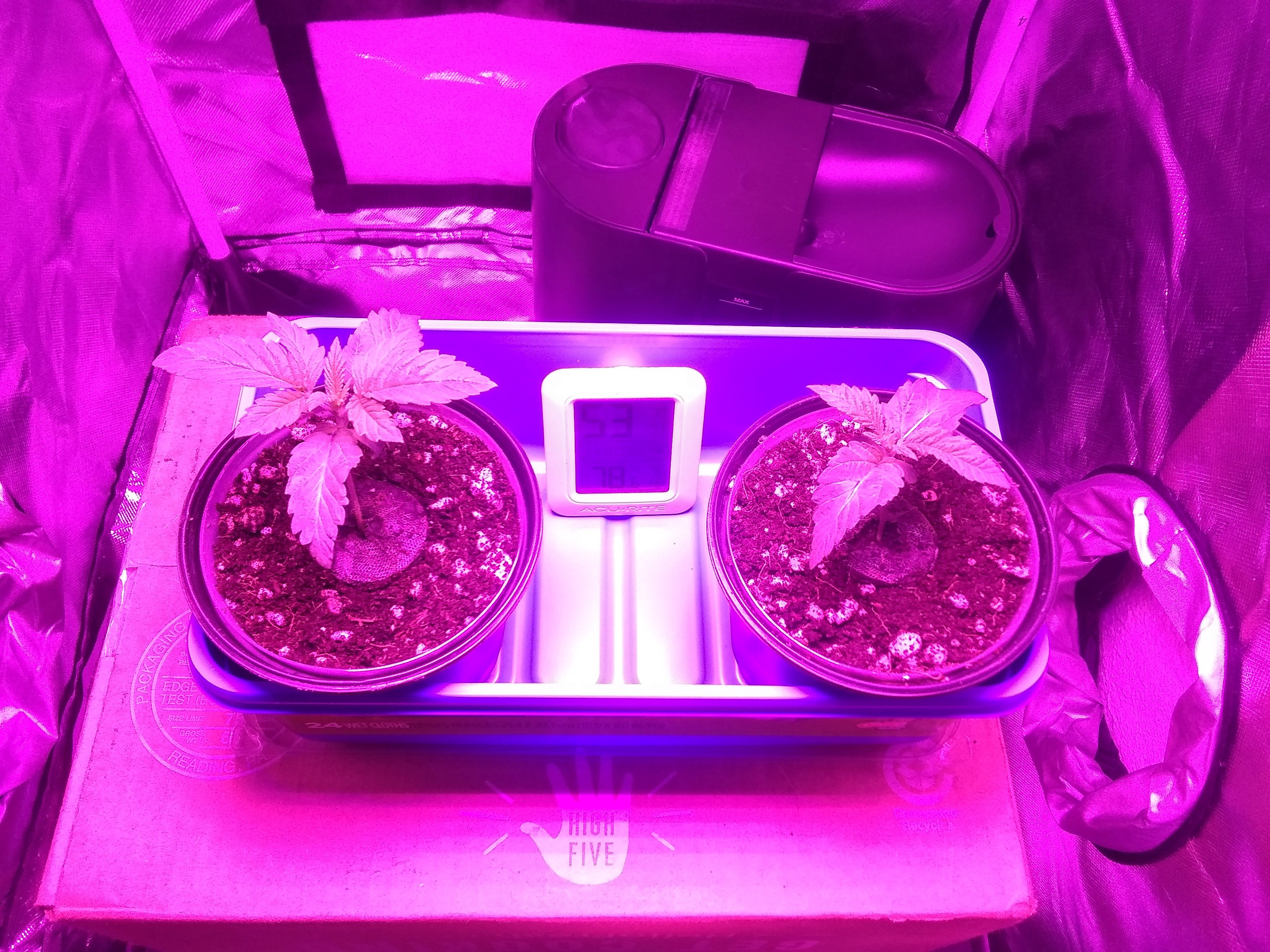 GG4 x 2... eight days from germination today. Popped in paper towels, then dropped in peat moss plugs for a couple days. Just got their first feeding...1ml/litre each of Fox Farms Kangaroots, Cal Mag and Advanced Nutrients Sensi-Grow two part. Tent is 2x2x4' Vivosun and the light is a Roleadro "600" LED, actual draw is 165 watts.