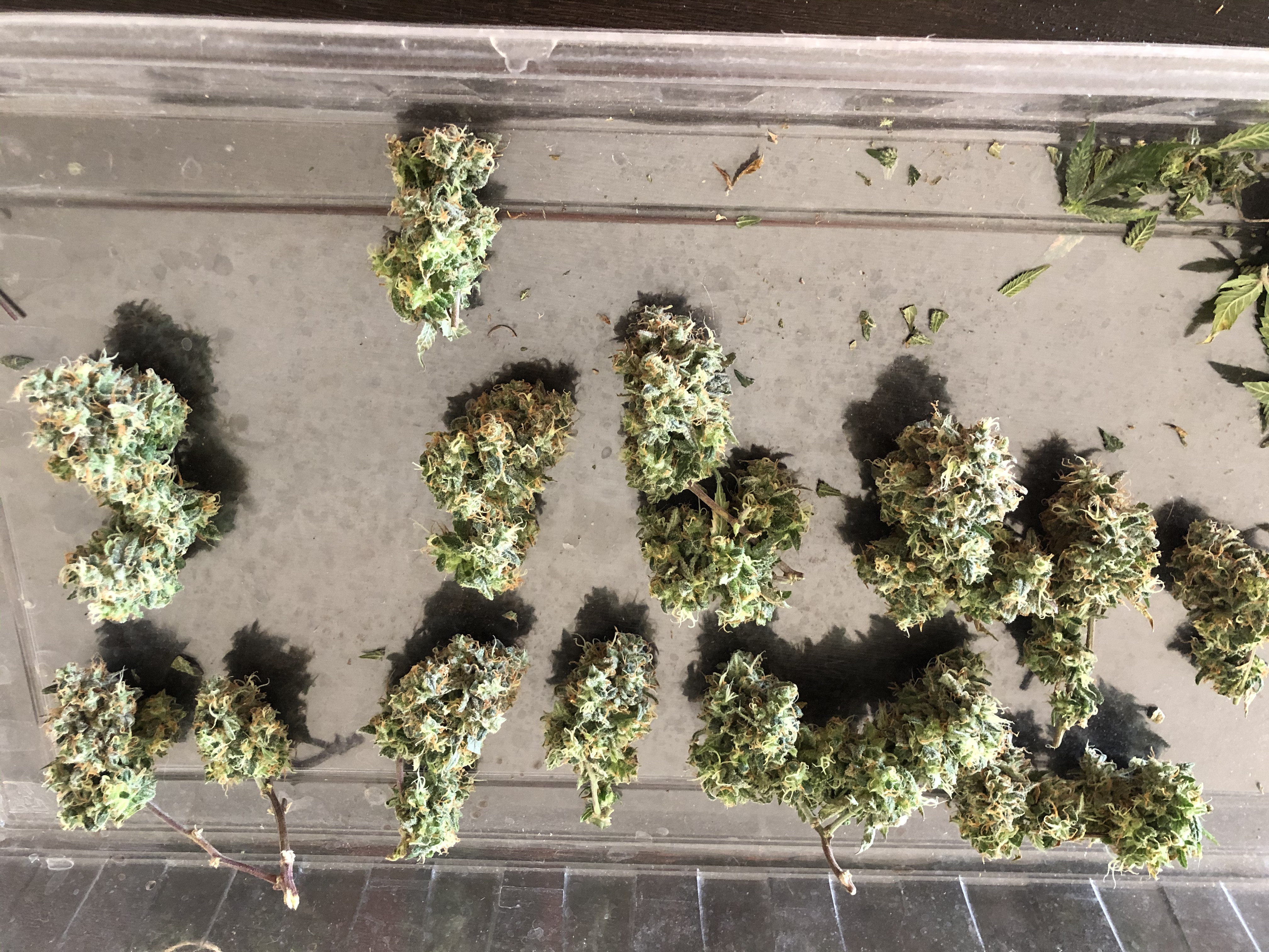 It's getting too hot to continue so I called it quits on the photo tent. Here's Darth Vader and Sour Tangie hanging after a quick trim the get the big fans off. White Widow already came down a few days ago and is jarred up. Alaskan Purple, Blue Dream and White Caramel Cookie left to go for the photos and have a couple auto Lemon Skunks that will come down any day as well.
