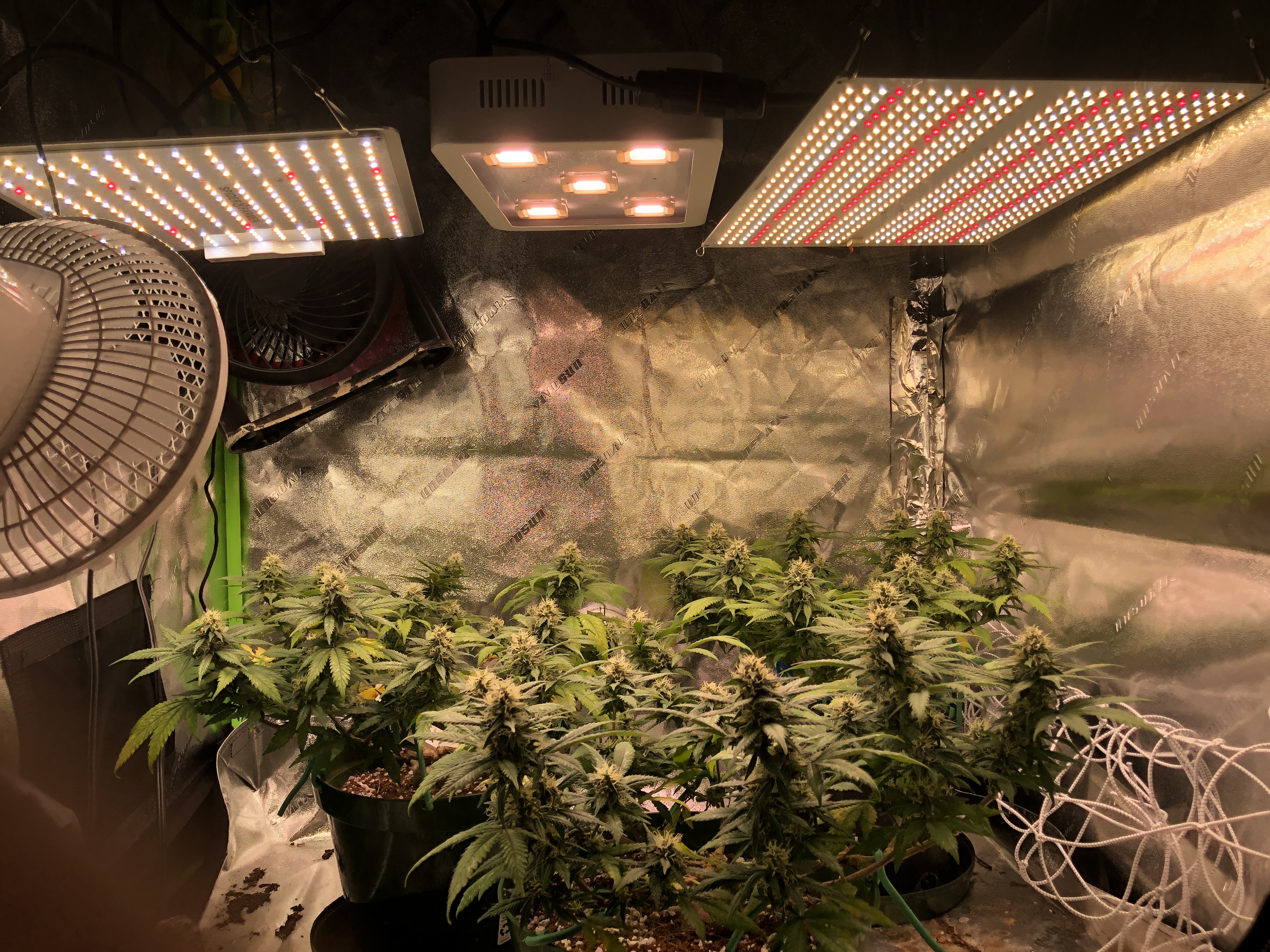 Got a couple black sugar girls 2 are mainlined ones just been pruned into a manifold, 5th week flower Tuesday 1 250 w Cobb centre spider farmer sf1000 left lenofocus quantum board on the right all in a 3x3, 4”intake and outtake couple fans inside to for good circulation. Coco and pearlite... also a pic of a recent black sugar harvest. Love thee look of these budss