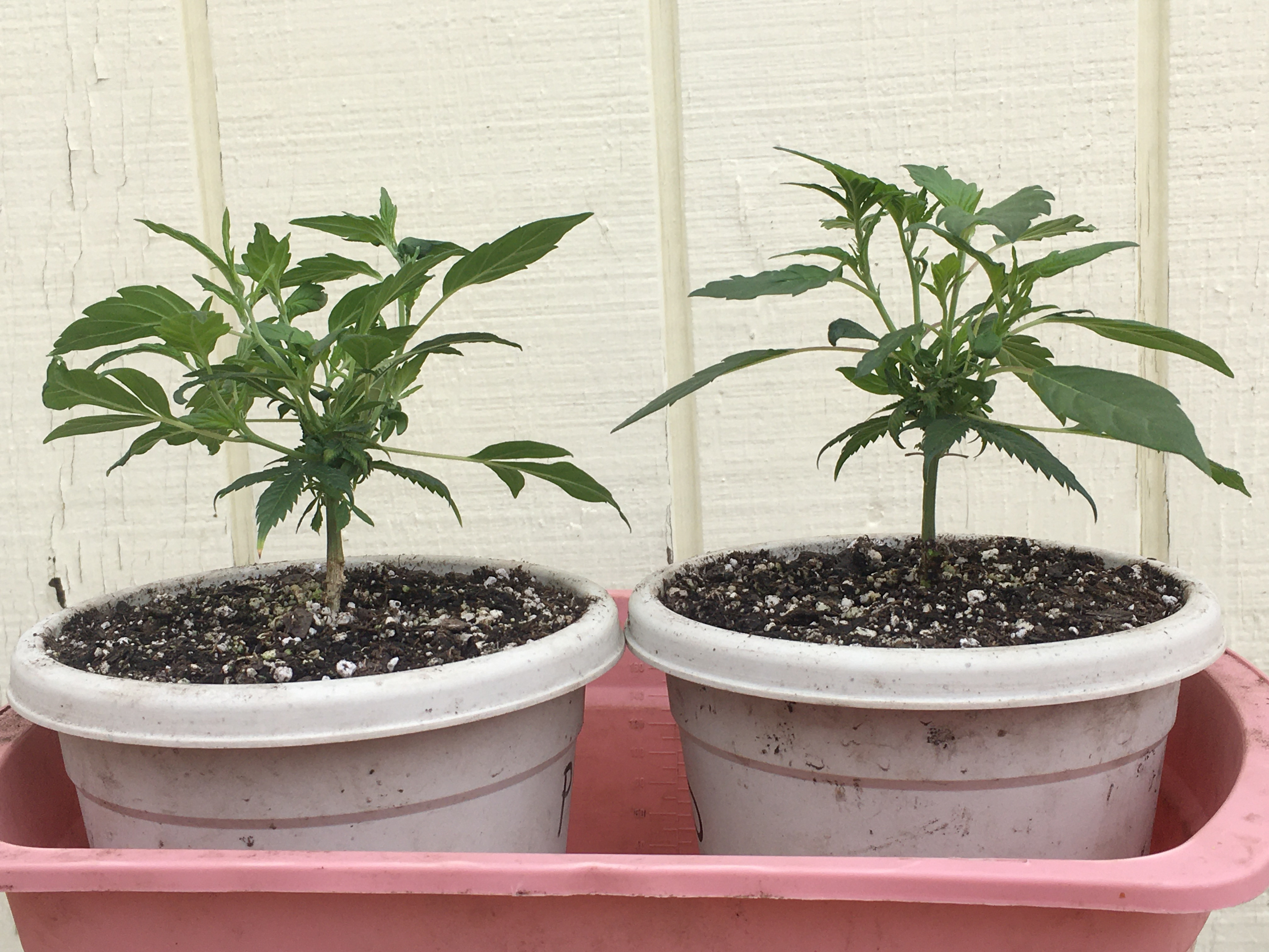 The two little bushes are Caramelicious feminized. Three weeks old. Real dark green leaves except for the bottom remaining 3 finger. It might have been a nute/pH issue because my neighbors Clear Blue Easy home pregnancy and pH meter is wonky. Perfect 6.5, one day. 8.5, the next. I have pH strips somewhere in the shipping ether.