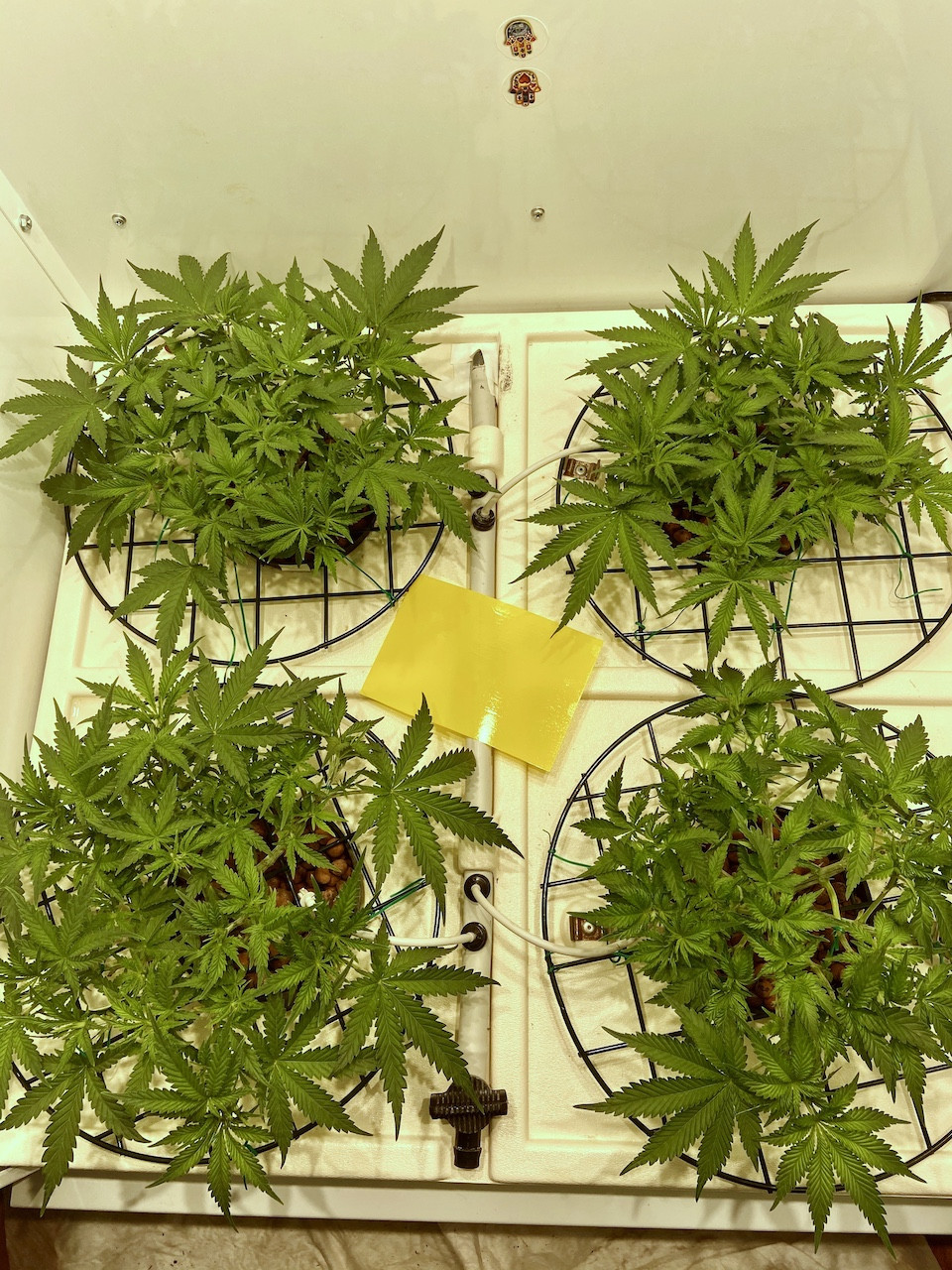 The two little bushes are Caramelicious feminized. Three weeks old. Real dark green leaves except for the bottom remaining 3 finger. It might have been a nute/pH issue because my neighbors Clear Blue Easy home pregnancy and pH meter is wonky. Perfect 6.5, one day. 8.5, the next. I have pH strips somewhere in the shipping ether.