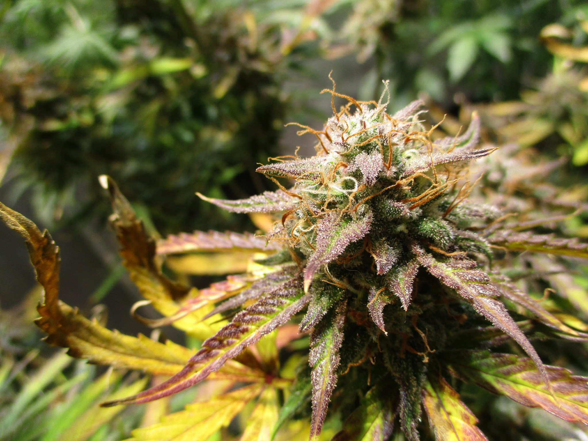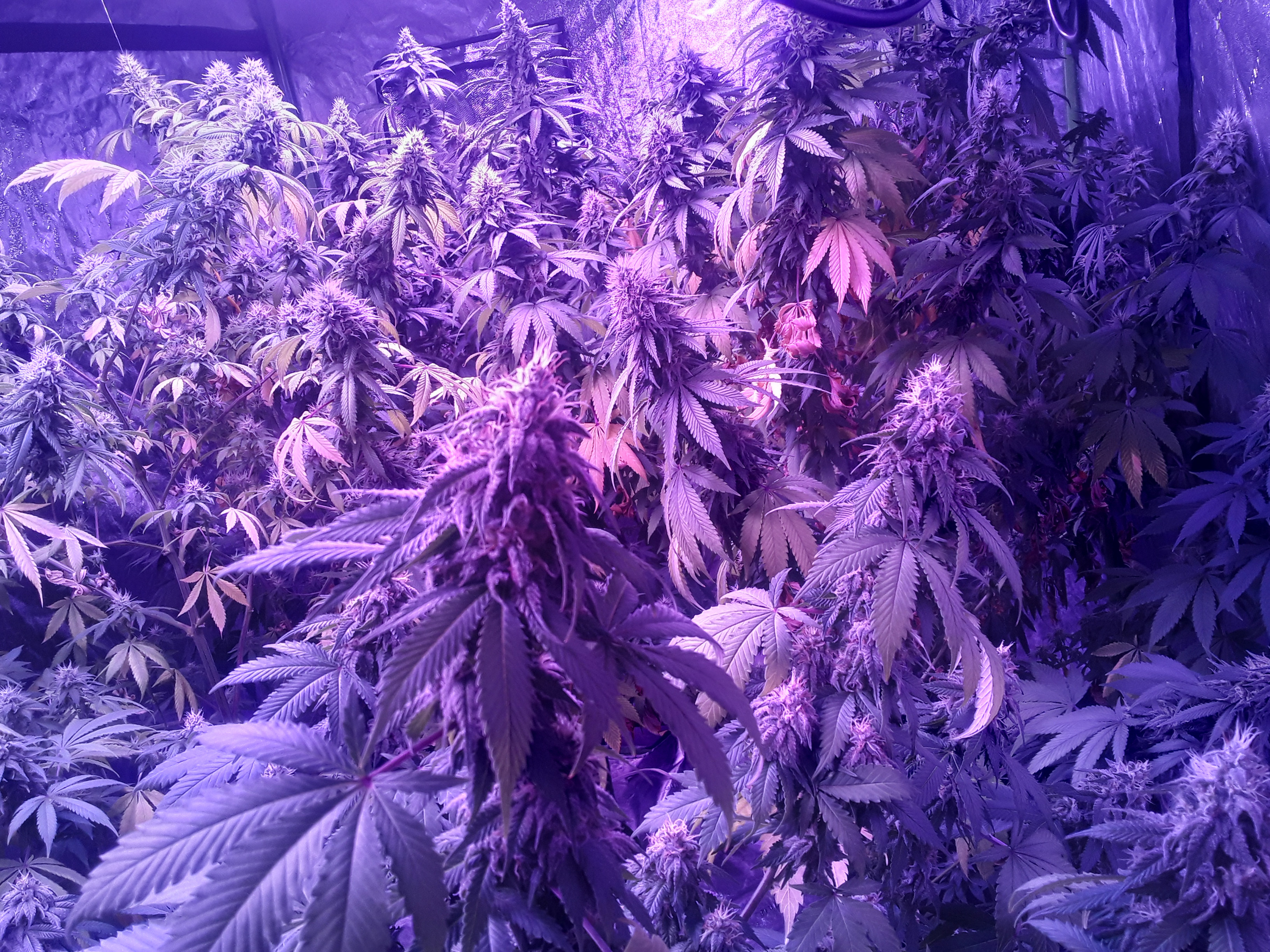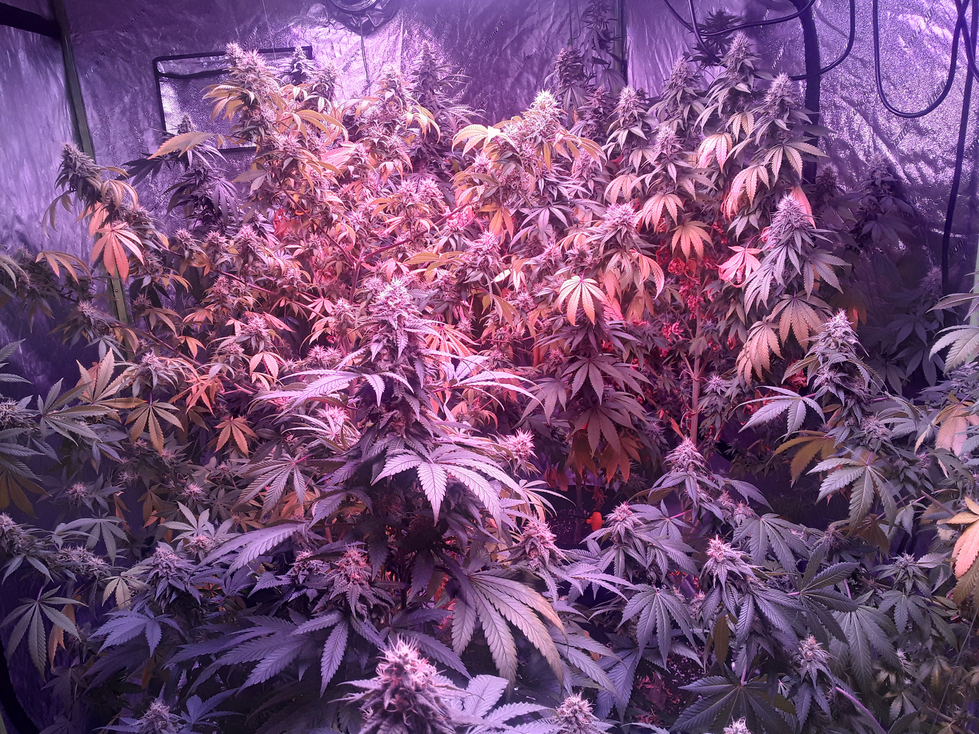 Day 37 of flower. A little more nitrogen deficiency than I would like but it should be fine. The girls have dropped a few more leaves than I would like to see at this point. Good thing i didn't heavily defoliate. Gonna be over 2 lbs from 6 plants. All of em between 5 and 6 feet tall and dense except for the lowest branches. Almost no larf. I'm pleased. Canuk cookies and zskittles glue from canuck seeds. Sorry about the blurple. They're too big to move for photos, also about a dozen yo-yos.