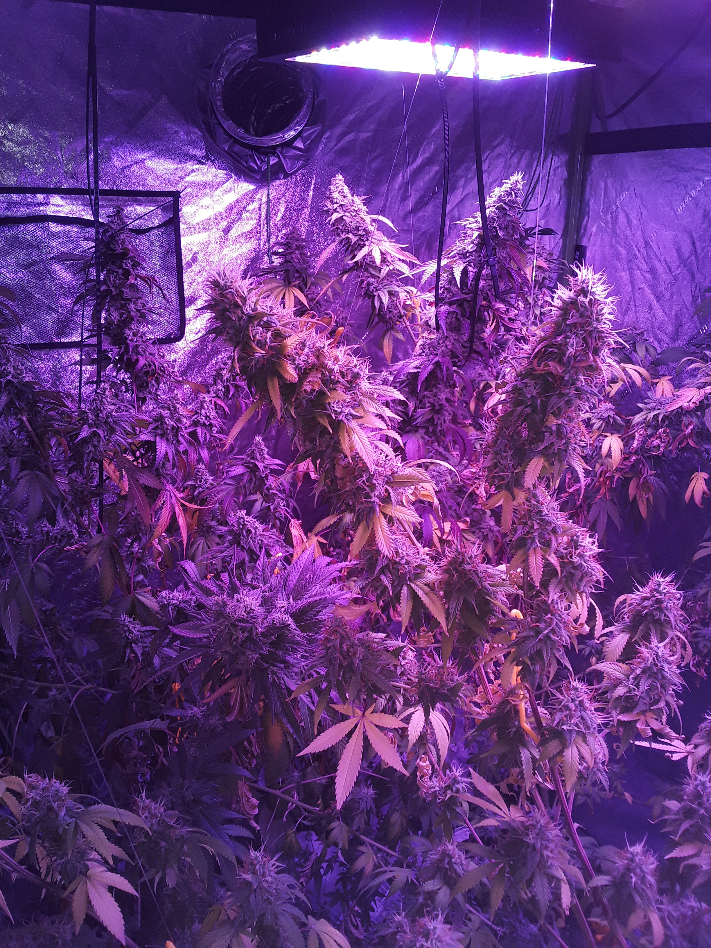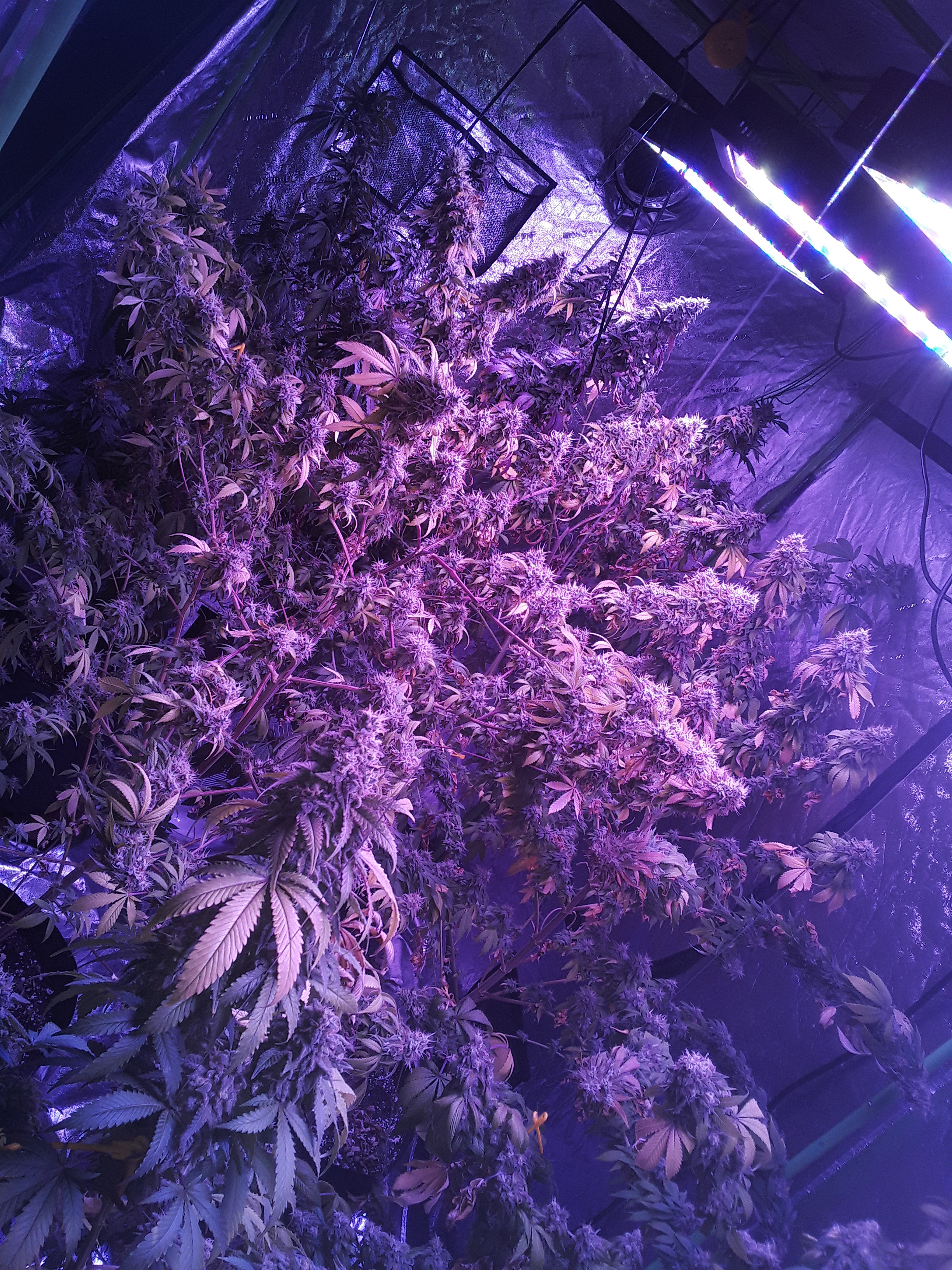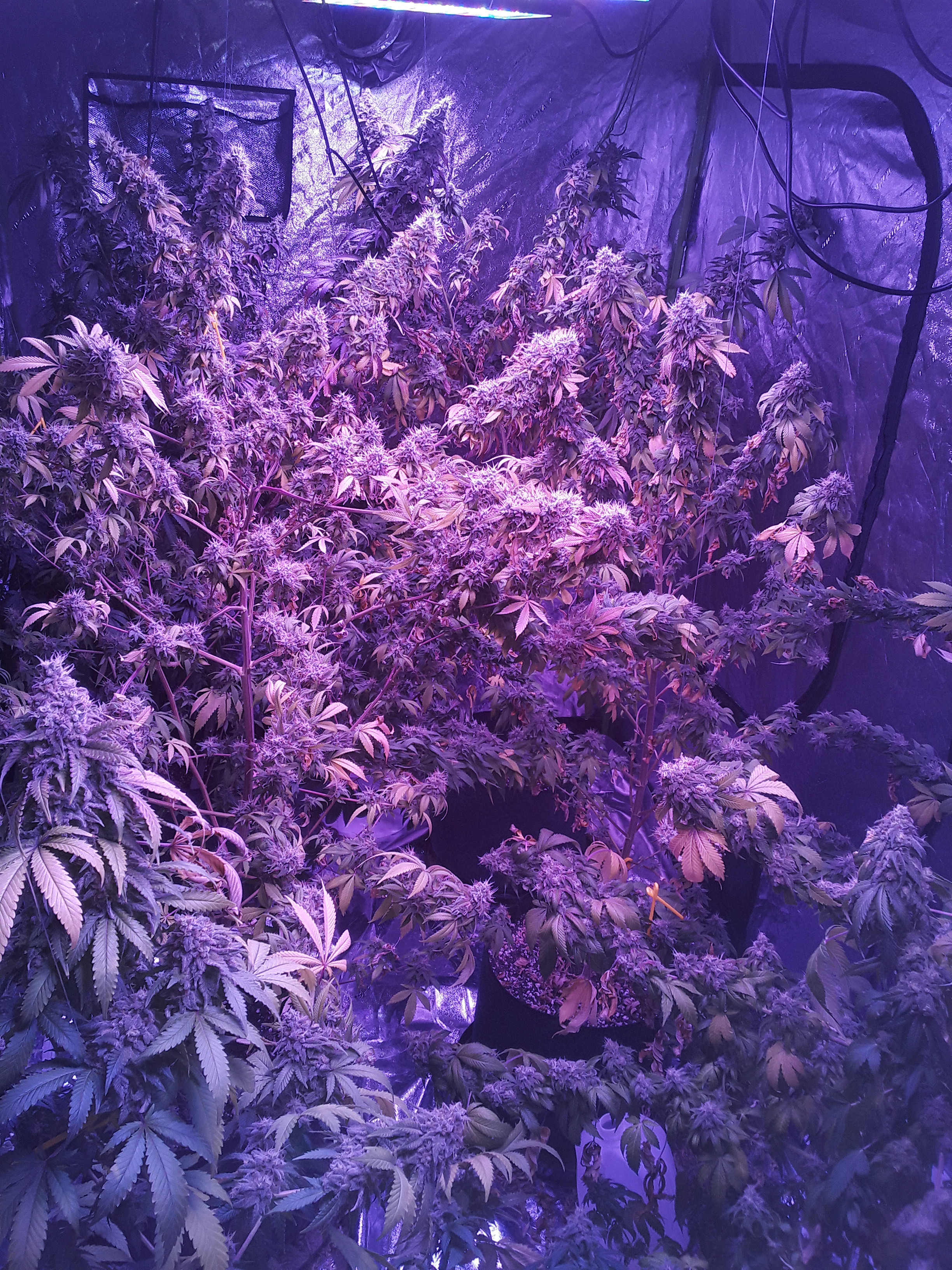 Well, heres my lazy ass grow. 2nd indoor grow, 7 weeks into flower, about a week from harvest, there are 2 canuk cookies and 2 zskittles glue, both from canuk seeds, both with 8 week flower periods, also two bagseeds, one of which is a purple overdose punch from some weed I got in Oregon, the other is unknown from my stash of random stress seeds from bags. Those two seem to be the same maturity and are looking to finish up at least a week later than my canuk seeds. A total of 6 plants in a 5×10×7 I let the plants go wild. Get too big before flipping, and didn't really train them like I should have, I topped and super cropped when they were about 3 feet tall, at least 10 nodes high. Whoops. Initially I thought over 2 lbs but my eyes were big, each plant is a quarter pounder for sure but I'm expecting to come in at under 2 lbs. Also I under fed AGAIN, 2 plants were hit worst with the nitrogen deficiency, the other 4 are right on track with the leaf drops maybe a little early but not much. The 2 bad ones still have a lot of white hairs and almost no fan leaves left and some of the sugar leaves are starting to turn. Live and learn I guess. Click image for larger version