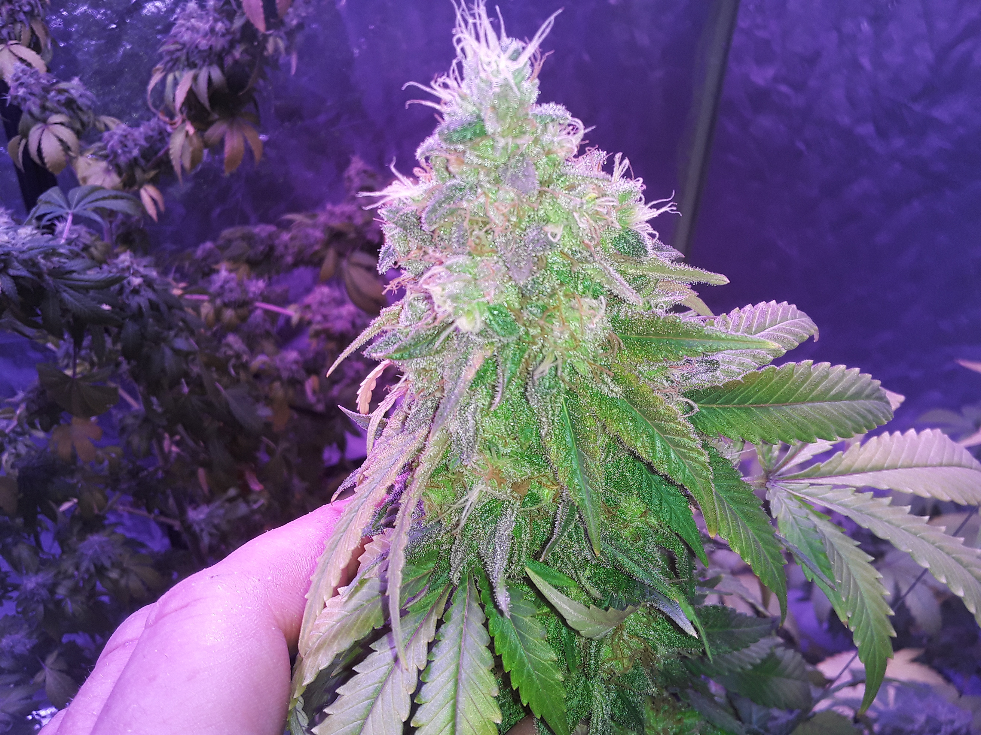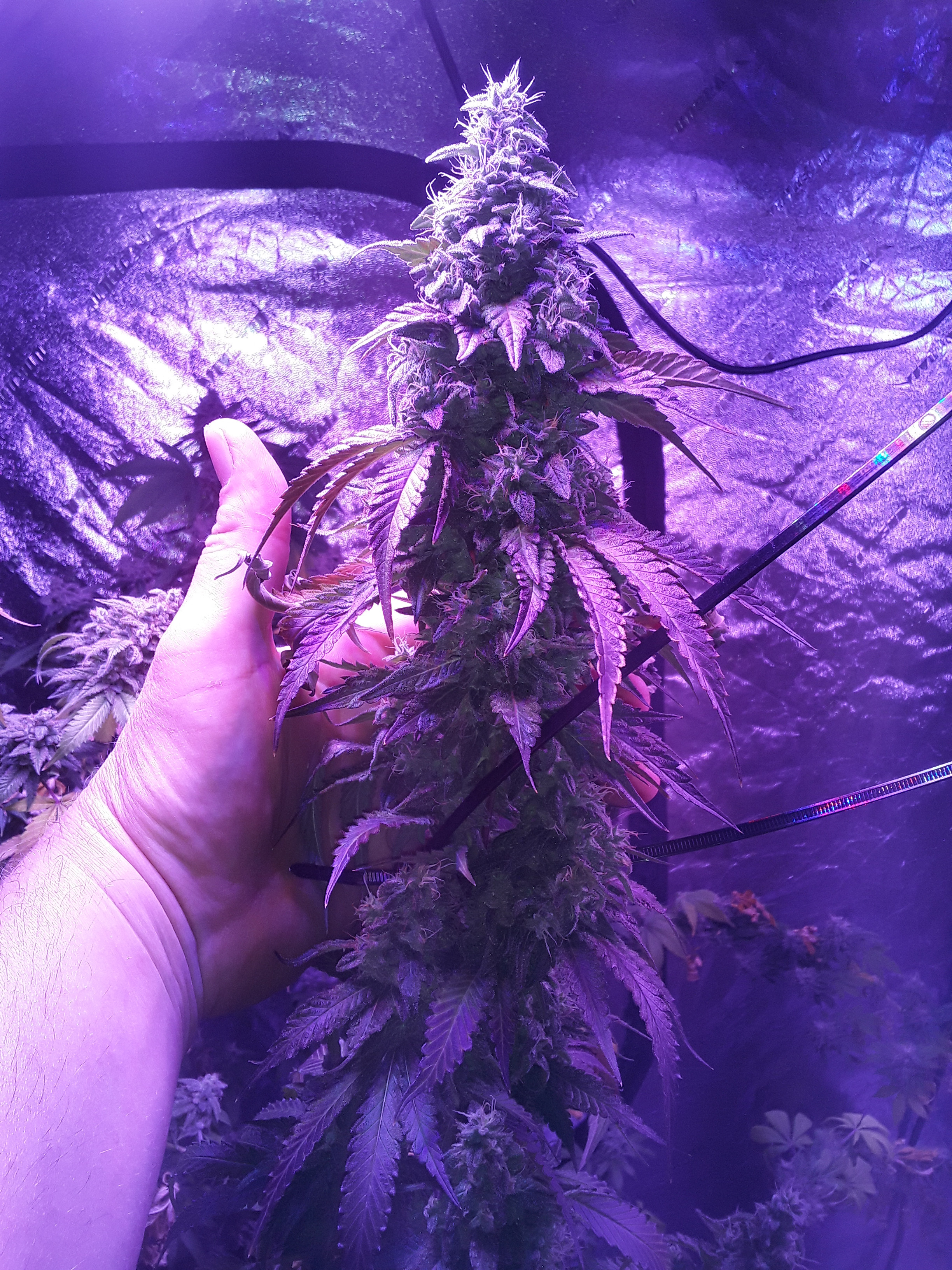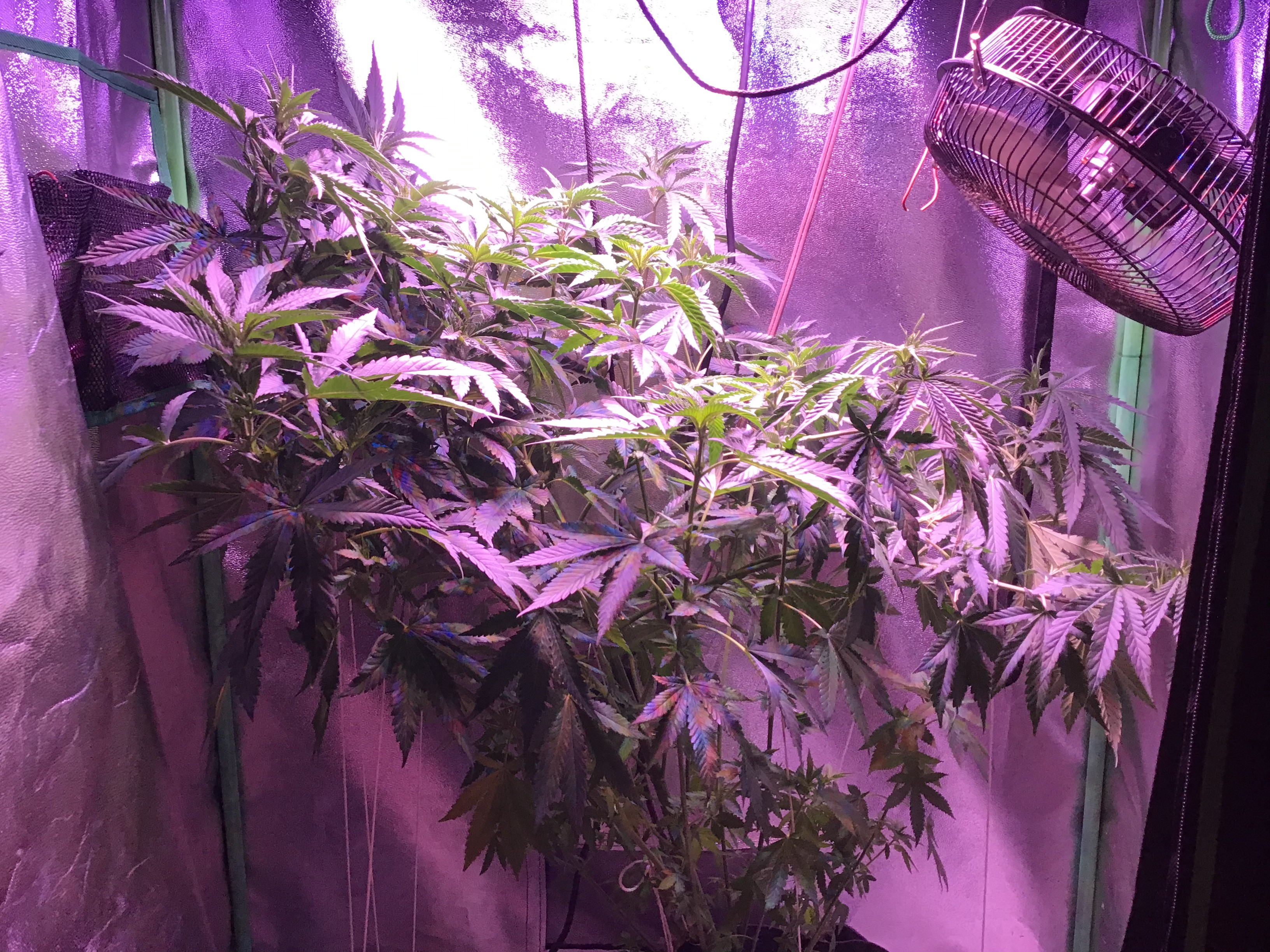 Well, heres my lazy ass grow. 2nd indoor grow, 7 weeks into flower, about a week from harvest, there are 2 canuk cookies and 2 zskittles glue, both from canuk seeds, both with 8 week flower periods, also two bagseeds, one of which is a purple overdose punch from some weed I got in Oregon, the other is unknown from my stash of random stress seeds from bags. Those two seem to be the same maturity and are looking to finish up at least a week later than my canuk seeds. A total of 6 plants in a 5×10×7 I let the plants go wild. Get too big before flipping, and didn't really train them like I should have, I topped and super cropped when they were about 3 feet tall, at least 10 nodes high. Whoops. Initially I thought over 2 lbs but my eyes were big, each plant is a quarter pounder for sure but I'm expecting to come in at under 2 lbs. Also I under fed AGAIN, 2 plants were hit worst with the nitrogen deficiency, the other 4 are right on track with the leaf drops maybe a little early but not much. The 2 bad ones still have a lot of white hairs and almost no fan leaves left and some of the sugar leaves are starting to turn. Live and learn I guess. Click image for larger version