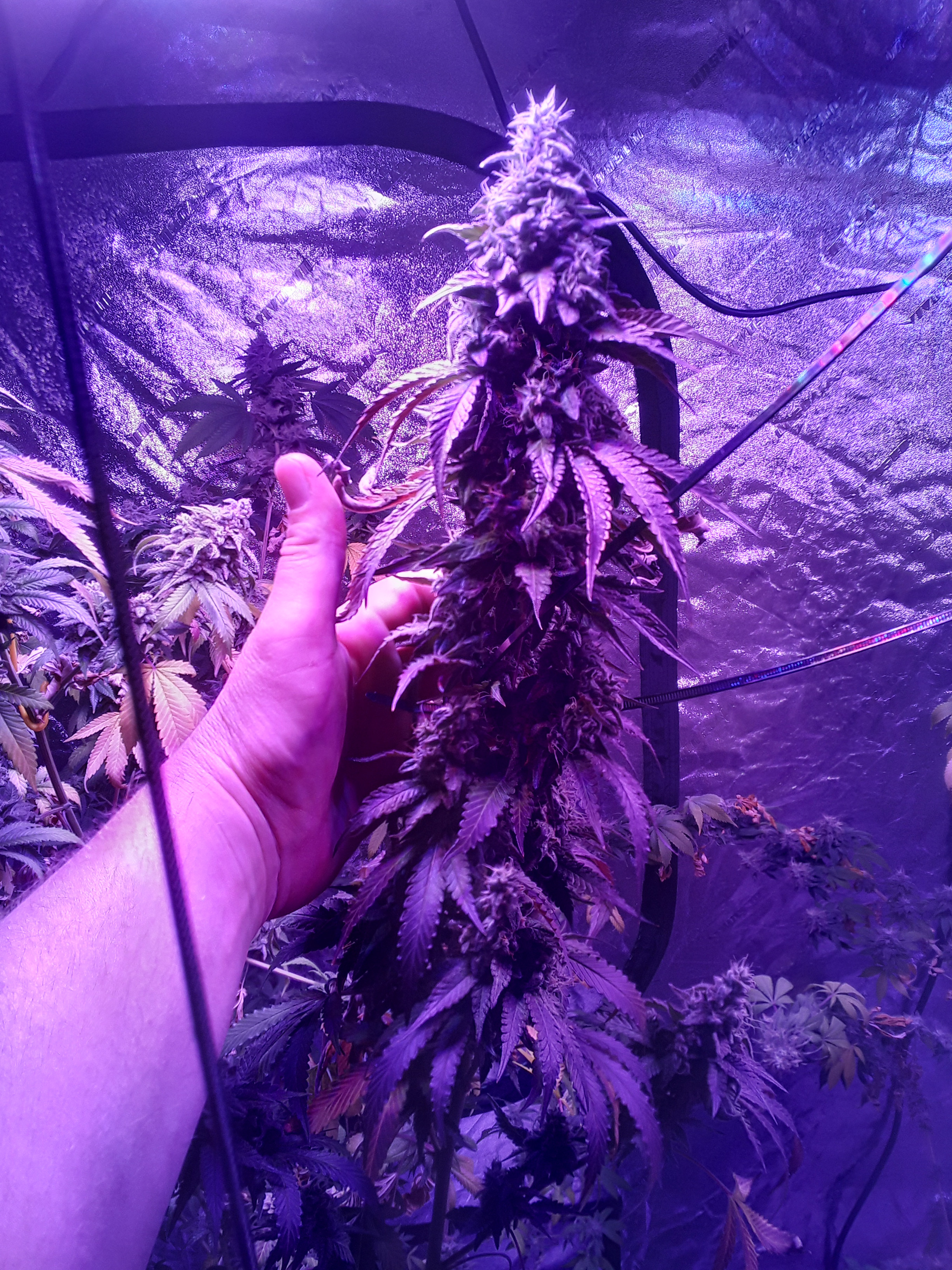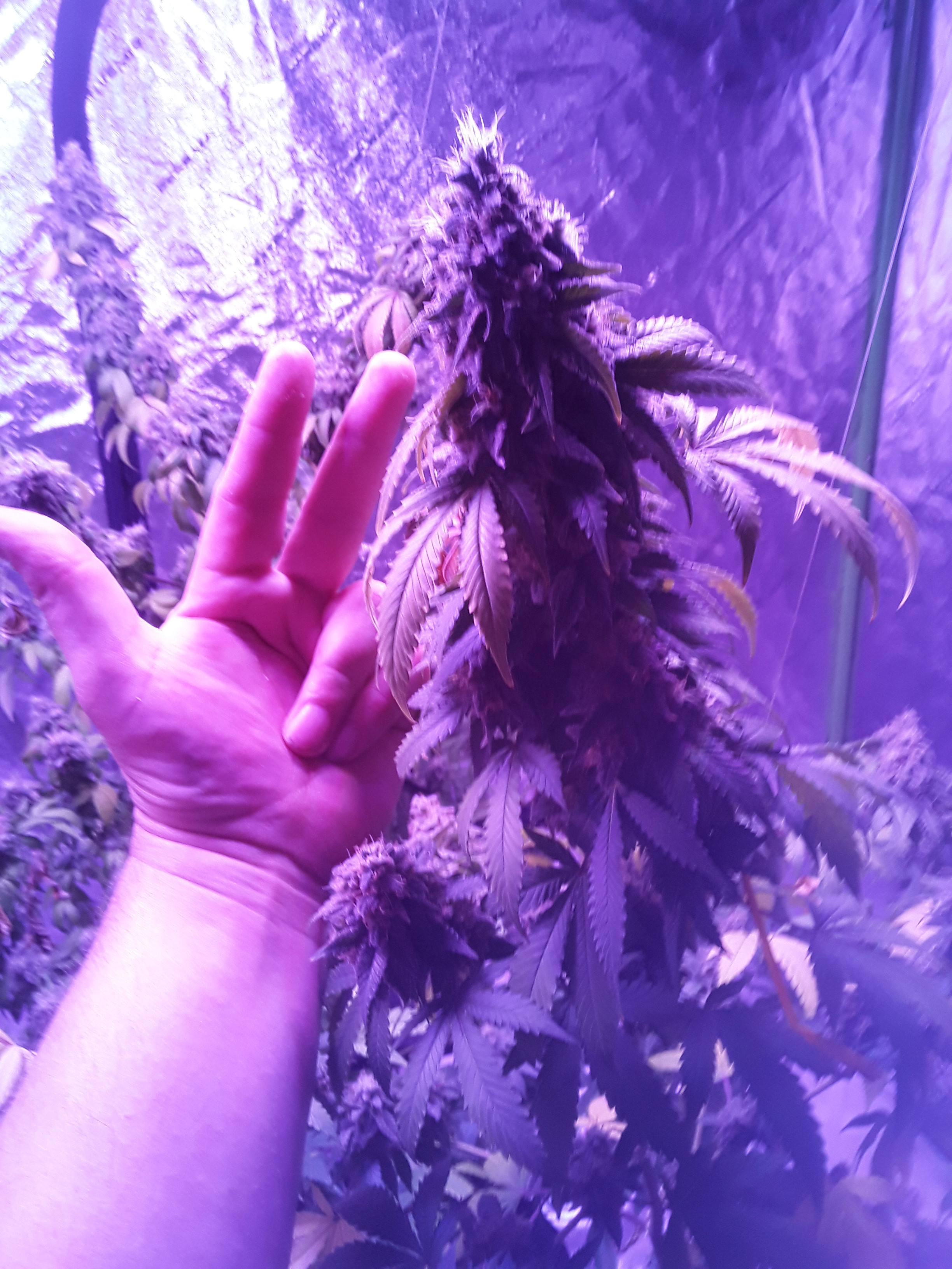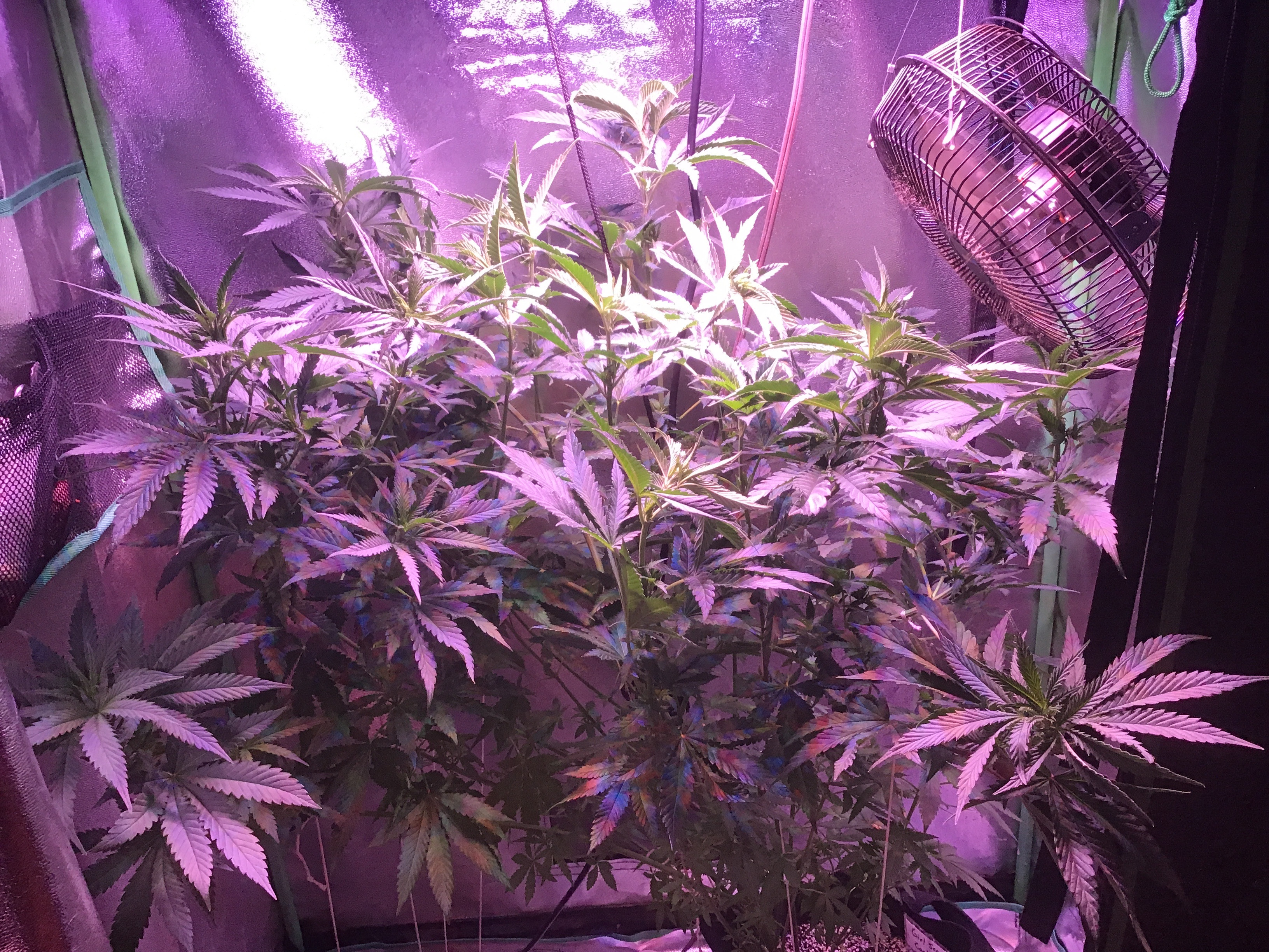 Well, heres my lazy ass grow. 2nd indoor grow, 7 weeks into flower, about a week from harvest, there are 2 canuk cookies and 2 zskittles glue, both from canuk seeds, both with 8 week flower periods, also two bagseeds, one of which is a purple overdose punch from some weed I got in Oregon, the other is unknown from my stash of random stress seeds from bags. Those two seem to be the same maturity and are looking to finish up at least a week later than my canuk seeds. A total of 6 plants in a 5×10×7 I let the plants go wild. Get too big before flipping, and didn't really train them like I should have, I topped and super cropped when they were about 3 feet tall, at least 10 nodes high. Whoops. Initially I thought over 2 lbs but my eyes were big, each plant is a quarter pounder for sure but I'm expecting to come in at under 2 lbs. Also I under fed AGAIN, 2 plants were hit worst with the nitrogen deficiency, the other 4 are right on track with the leaf drops maybe a little early but not much. The 2 bad ones still have a lot of white hairs and almost no fan leaves left and some of the sugar leaves are starting to turn. Live and learn I guess. Click image for larger version
