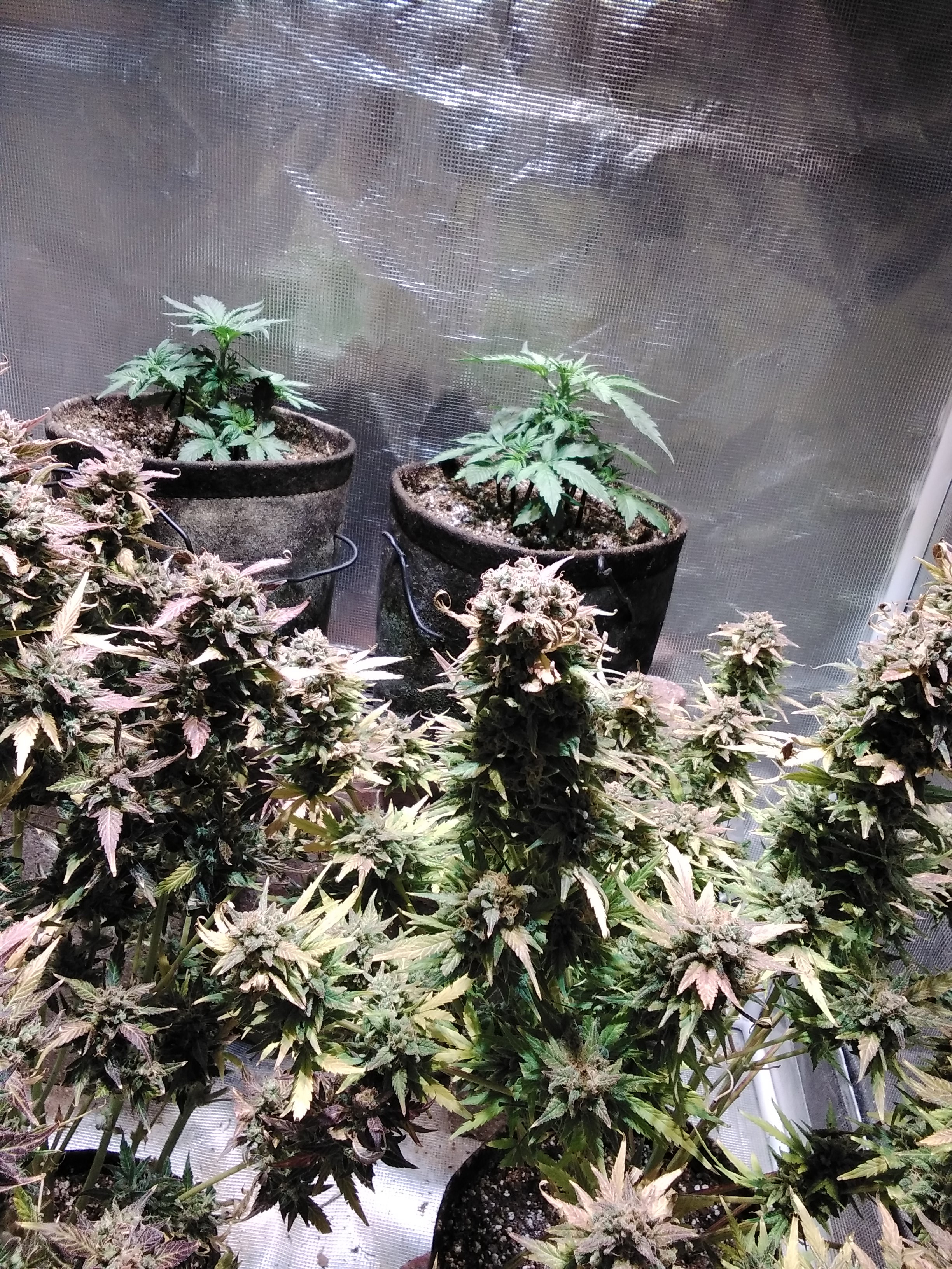 The tent ladies are 2 weeks after flip..stretching hard, but im keeping the dominant stems bent so i can maintain a decent canopy thru flower. Did a LsT yesterday and a defol tonight. Nice canopy so far and still have another foot of headroom if needed. Im enjoying the outdoor plants..lol. pretty easy..rain water and pond filter gunk.. no ph testing, no Nutes.6 PhotosShappel S3000 3.5x6x6' ice hut