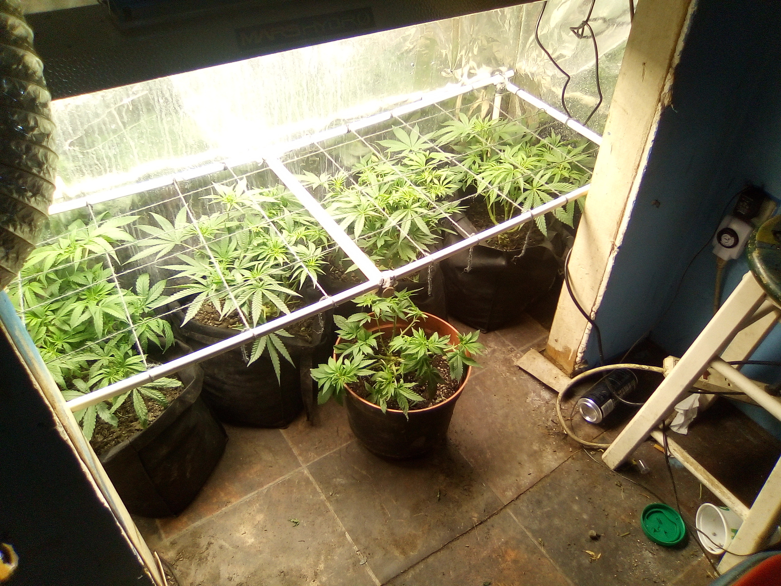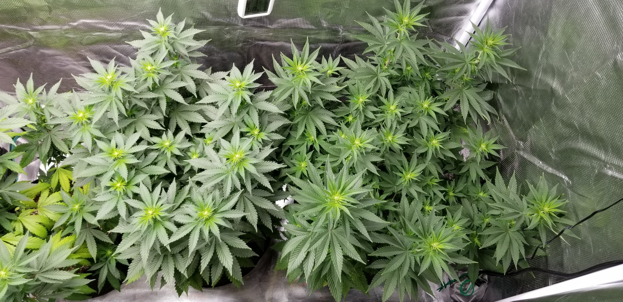 Mainline mania: I LOVE this!! It is the best method so far for my grow boxes. I'm following Nugbuckets' guide to mainlining, and it really works: all of the stems are equally strong, and the tops are mostly staying nice and flat. I trimmed underlying growth yesterday. The plants have been extremely happy all the way through; what good girls. Hulkberry, front right, has 12 colas. Don't ask me how that happened; I think I was high. Maybe one more week in this box before I will have to flip them to flower:
