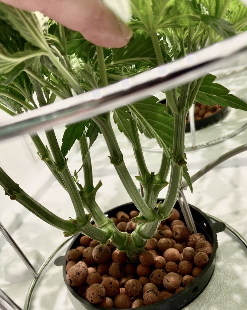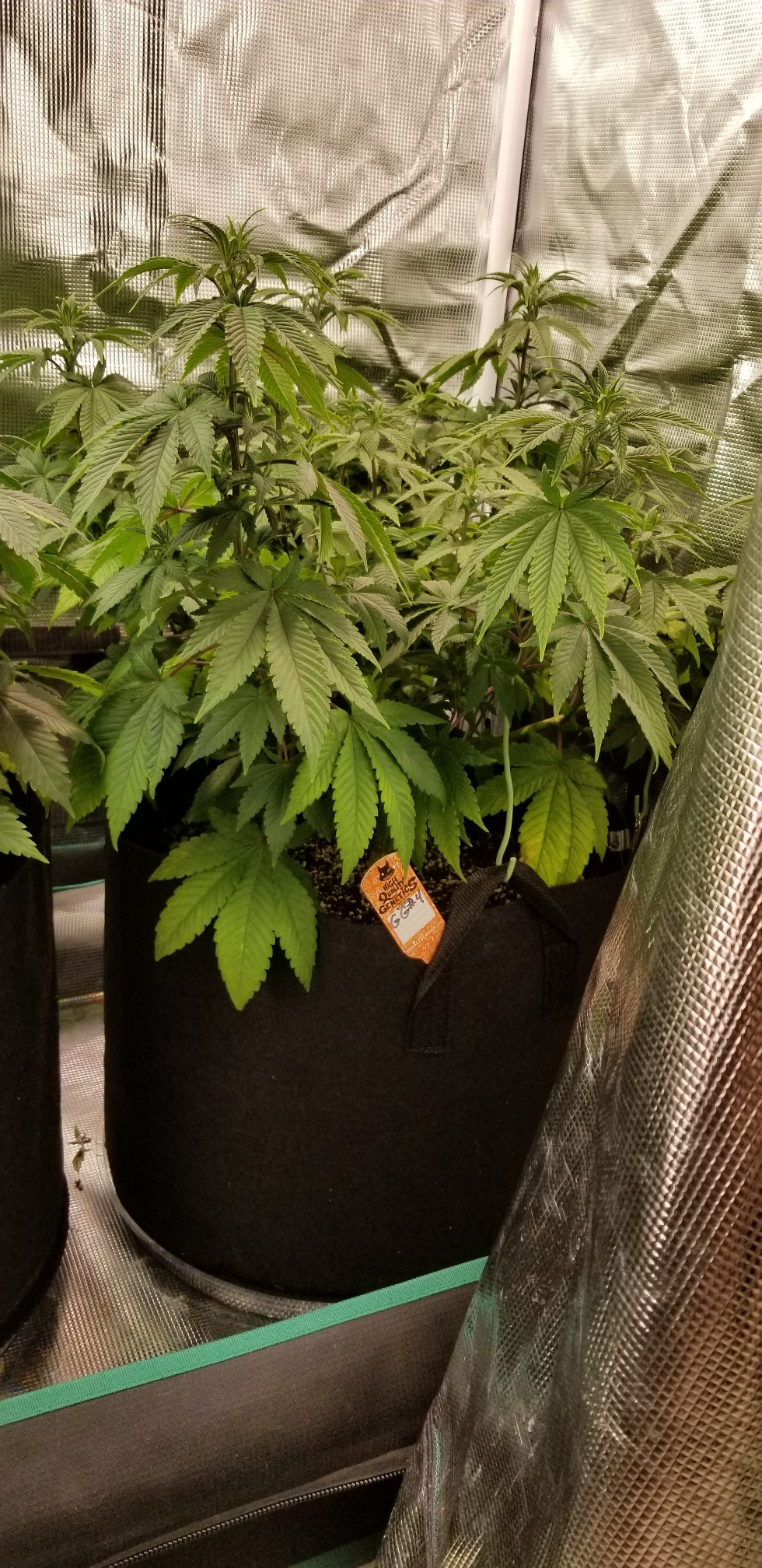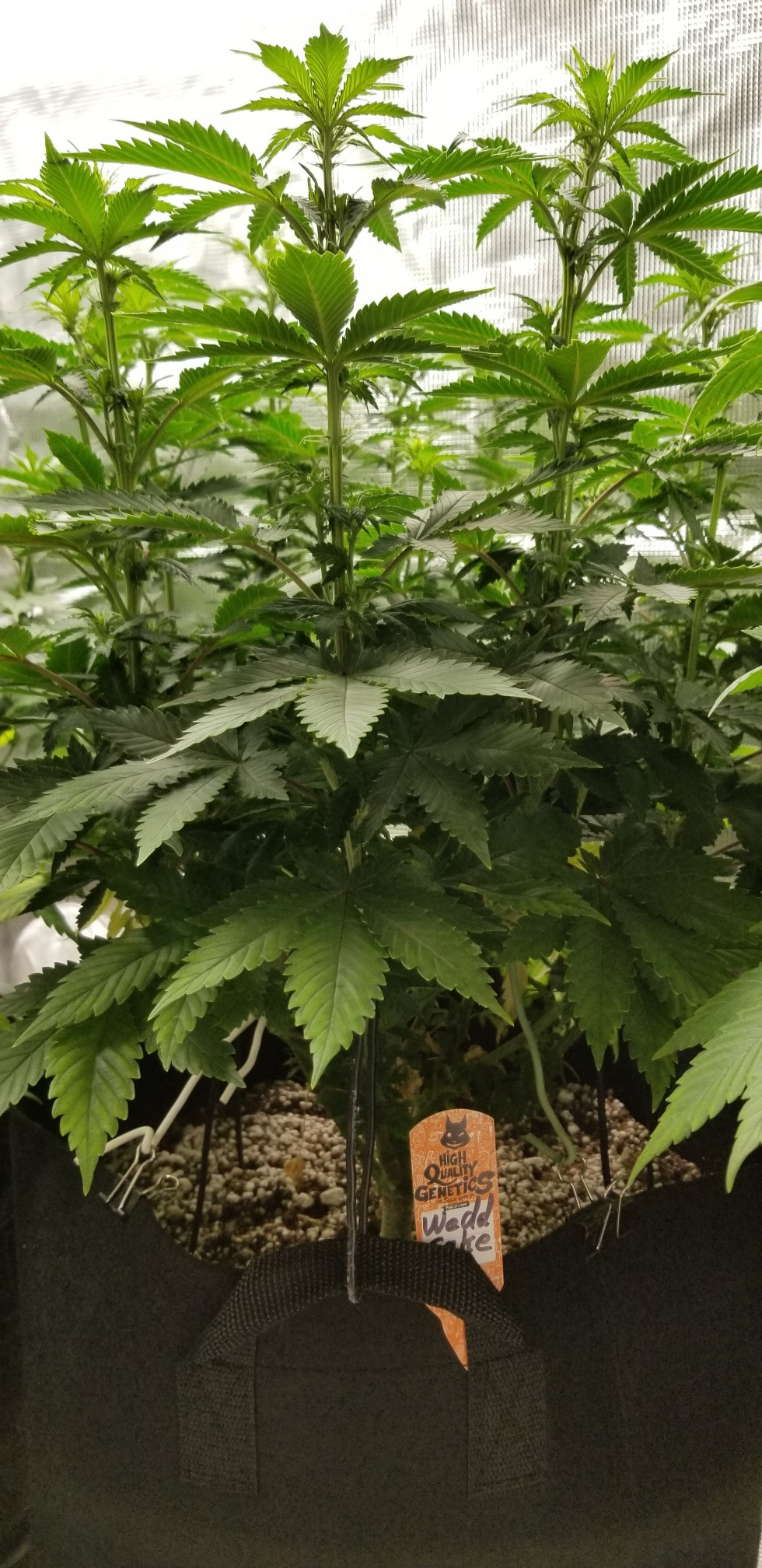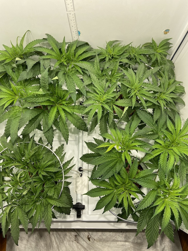 Mainline mania: I LOVE this!! It is the best method so far for my grow boxes. I'm following Nugbuckets' guide to mainlining, and it really works: all of the stems are equally strong, and the tops are mostly staying nice and flat. I trimmed underlying growth yesterday. The plants have been extremely happy all the way through; what good girls. Hulkberry, front right, has 12 colas. Don't ask me how that happened; I think I was high. Maybe one more week in this box before I will have to flip them to flower: