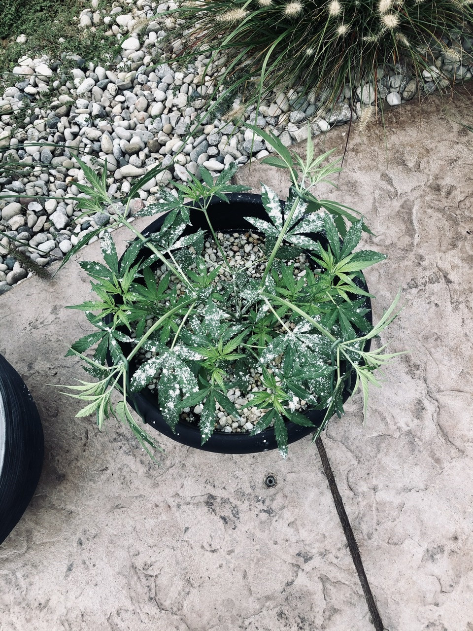 Well that was a good guess..two weeks later and im within my harvest window for 4 of my indoor photos. 1 more flush and i'll be cutting this week. Probably another 10 days for the last three. Outside plants are doing as good as can be expected.The variegated plant seems to be affected by WPM more than the other two..no idea why. I now have about 3 hours of sunlight a day in backyard, thunder showers for the next couple... might have to put them in the driveway to get any sun at all. One more thing..im not using any sweeteners (molasses or flora nectar) for this grow. Im gonna try the actual strain flavor for each. I'v tried AK-47 regular, AK-47 w/molasses(extra sweet-too much flavor)) and AK-47 with flora nectar(more sugary, more refined) sweet, but not overpowering.(i liked this better than molasses). This harvest is eau natural.