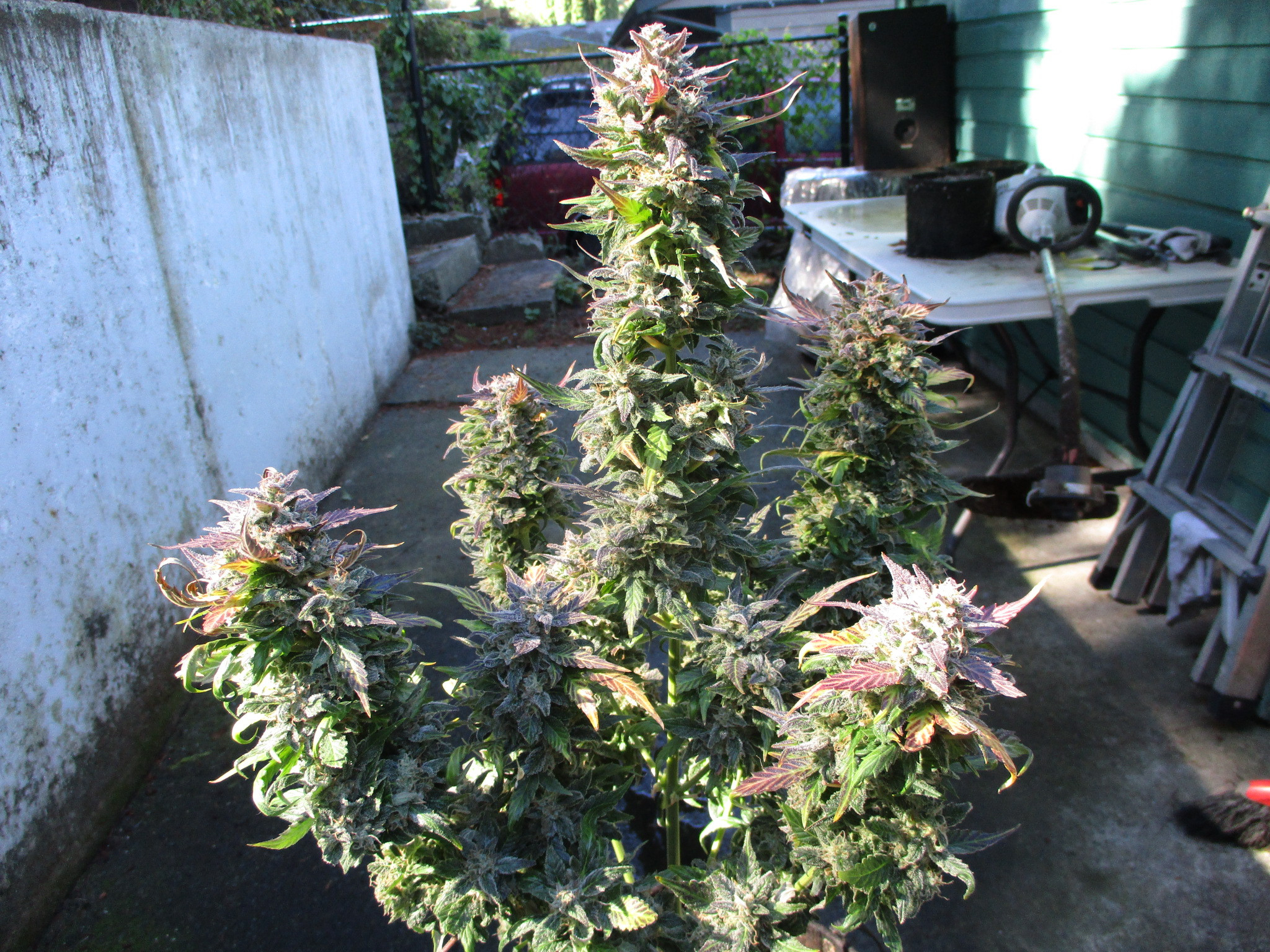 Good morning GWE hope we all are having a restful a.m. that's what it is here in Oregon USA still morning. A little foggy no smoke can't get the group shot loaded of the kids hanging out in the yard must be hung up in da fog cloud Any way here's Thai Skunk scared up but healthy i think and doing her thing getting fuller/heavy kinda bending over she was one of the " early to early preflower " from spring all that knarly brown leaf is from reveg. I've done lots of work cleaning out these plants and setting them up for a decent harvest. I won't be getting a huge amount which is never my plan it's just harvesting a healthy finished plant, all i care about anymore.