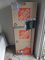 28" Big Bertha now has her darkroom. She's going to continue sunshine and be boxed up at night. The picture I'm not showing is the one where the two upper boxes are joined and sit on top of the bottom. That whole 'measure twice, cut once thing' is fine. But if you have enough duct tape you never need to take a measurement and can make cuts with your eyes closed. I've taped rags over the exhaust side of the fans to block light from coming in when they're on. 3 boxes from Home Depot: $7.14 Everything else was something I had on hand.