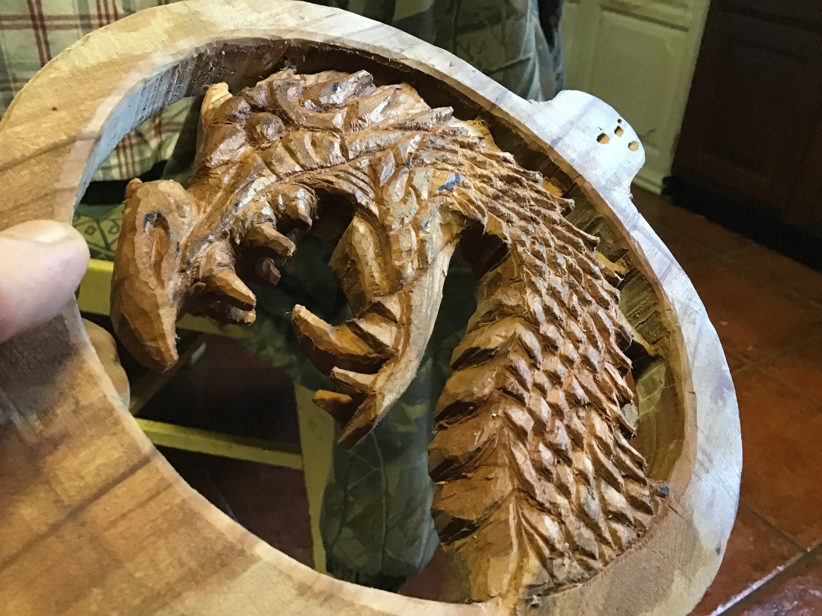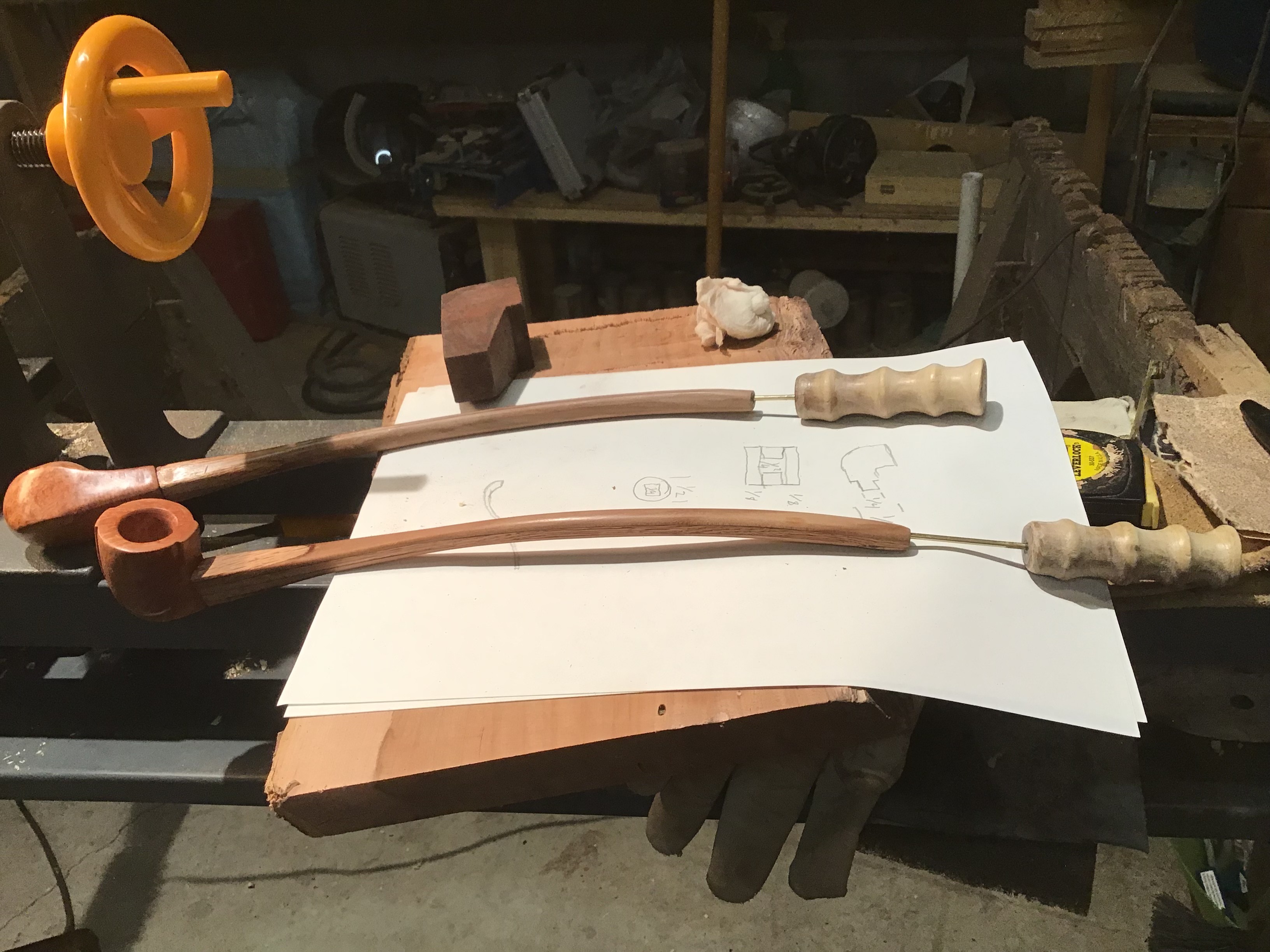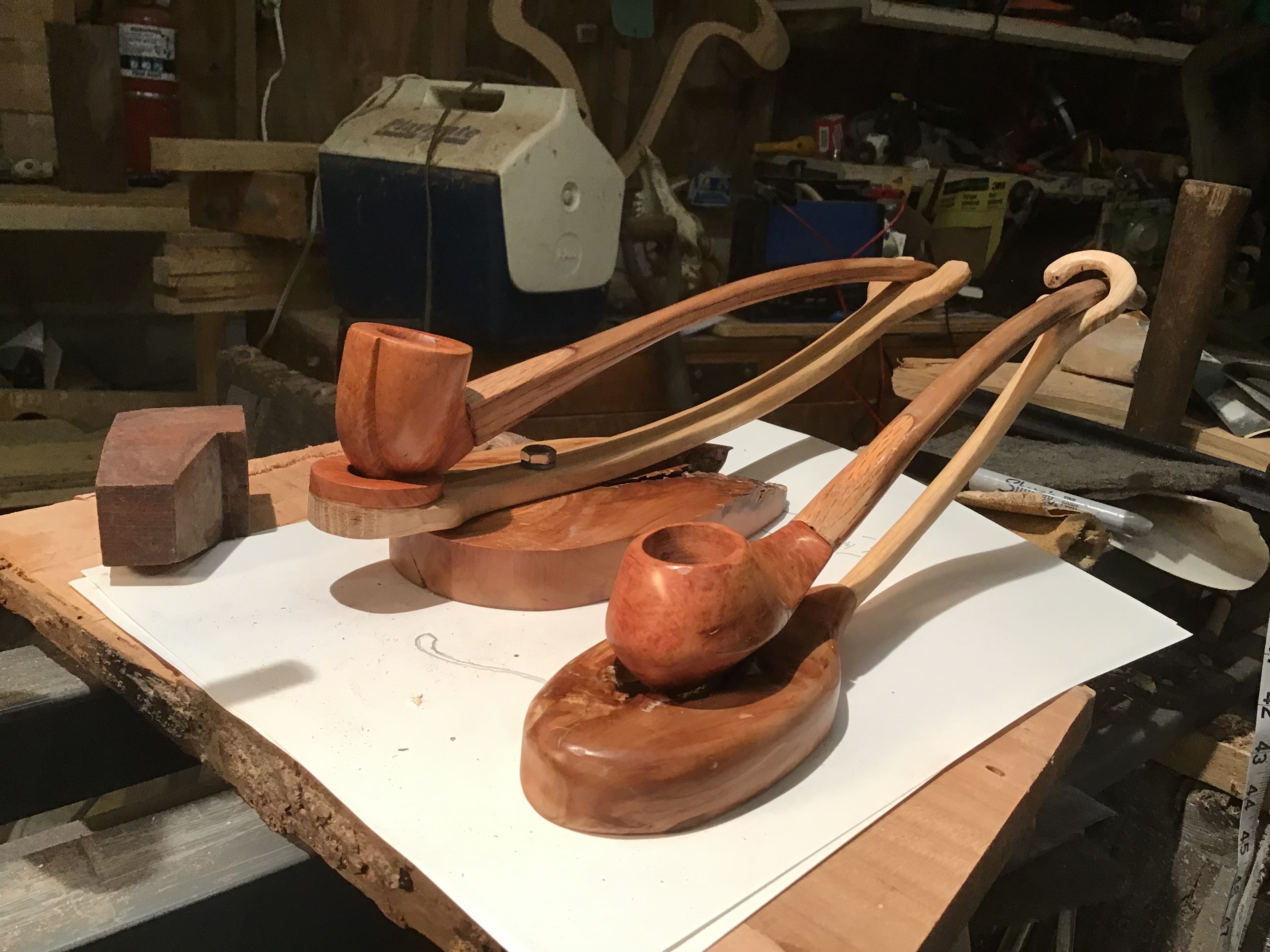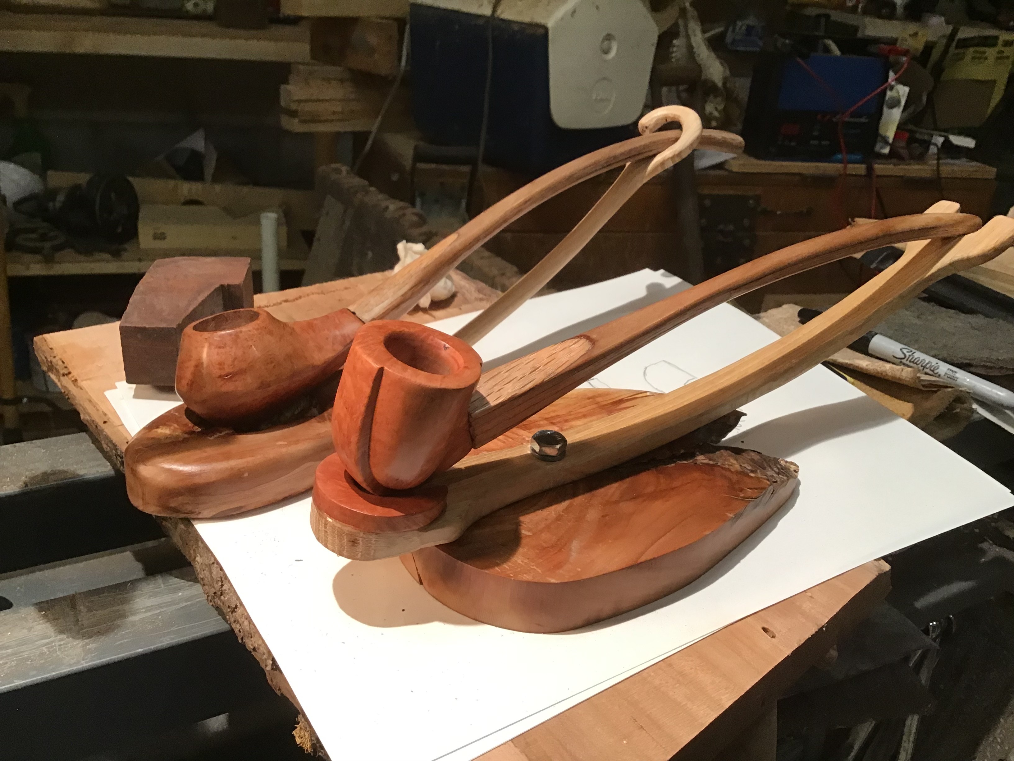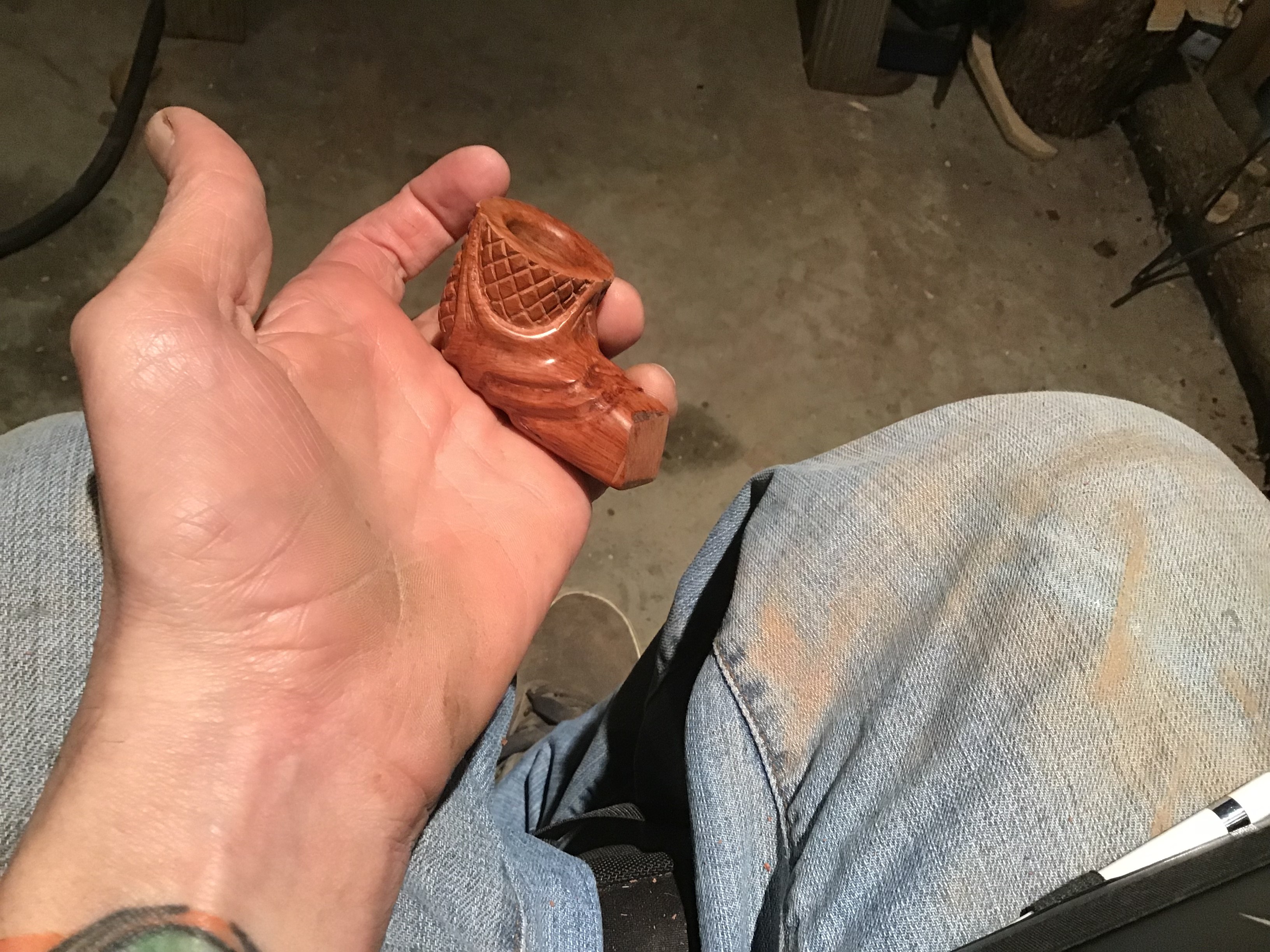 For those that like my work here’s some more pix of finished ones and ones I’m working on. The two finished ones went to paganrich and spidermite. The dragon head and bowl are all part of a stand and pipe. There’s a tail piece that goes on one end to hold the stem. I hand carve everything and the wood is from my farm, 150+ yr old chestnut like jarheads stem and 100+ yr old apple.