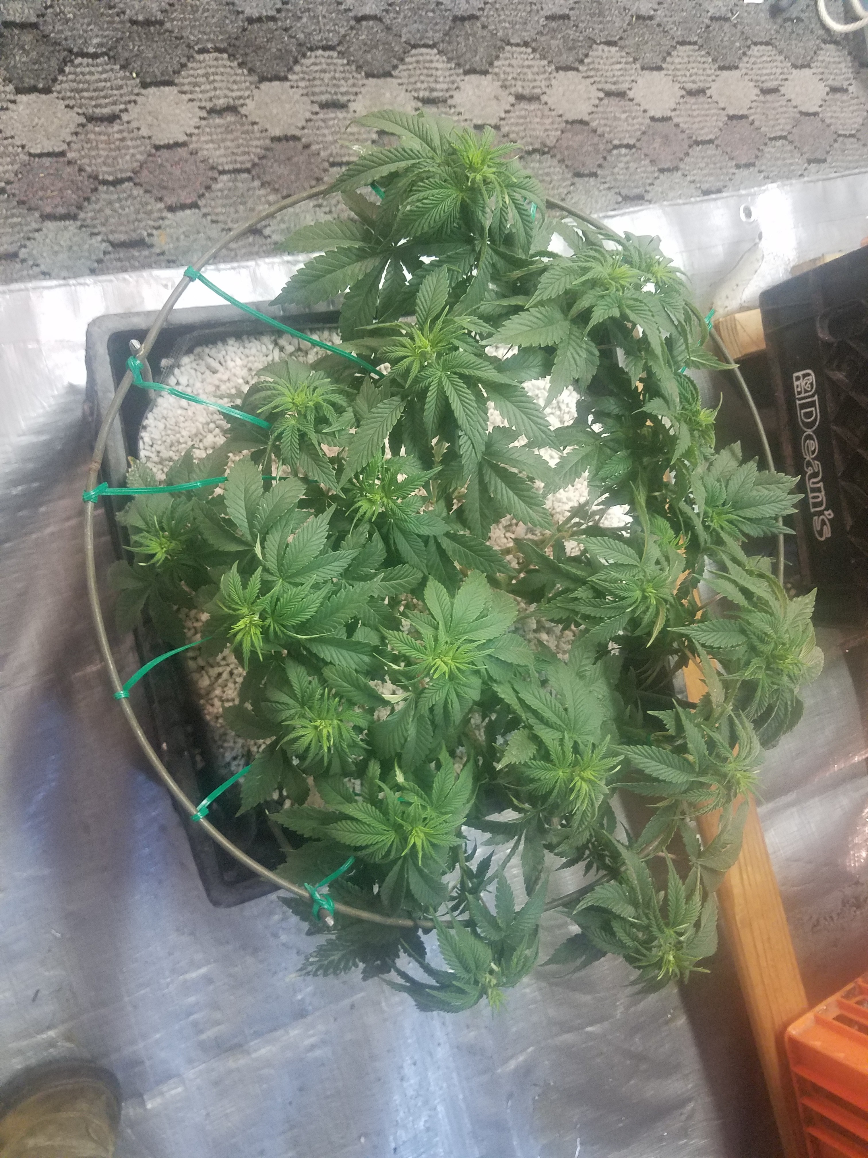 Just wanted to show pics 1 week after switch. 1st grow, 4x4 Room, HPS, LED, FF Nutrients and supplements. Wanted some variety, I have 2 Melon Gum (Dr. Underground), 2 Blueberry (Seedsman), 2 Chem Dawg (Seedsman), and 1 Tangerine Kush (Exotic). The reason for the single Tangerine Kush was a freebie, that came in a seperate order from a mix up with seedsman, all are female. I probably went way over my head with training, but I'm one to try and so far o feel it's worked out well. I vegged for 35 days. I followed Nebulas manifold to start, meaning I waited till I had 6 nodes, topped back to the 3rd. When I did that Nebs way said to crip everything below the 3rd, and build the manifold from there. The growth tips from my first and second nodes on all of them were so full, of decent size, and bigger than what I was going to manifold, so I left it all. I've exfoliated about 3 times, the last being the day I switched. Always only taking fans, I did top the 2nd time, again at the 3rd nodes, and this time I followed her instructions and stripped the 2nd node on both. I apologize for the pics, I did get rid of the bars from the magnetic ballasts, but, theres still the HPS, mixed with LED colors, but these are from today (Flower day 10), and if I can I'll add some from Sunday with better lighting. This is my first post so idk how many pics I can upload.