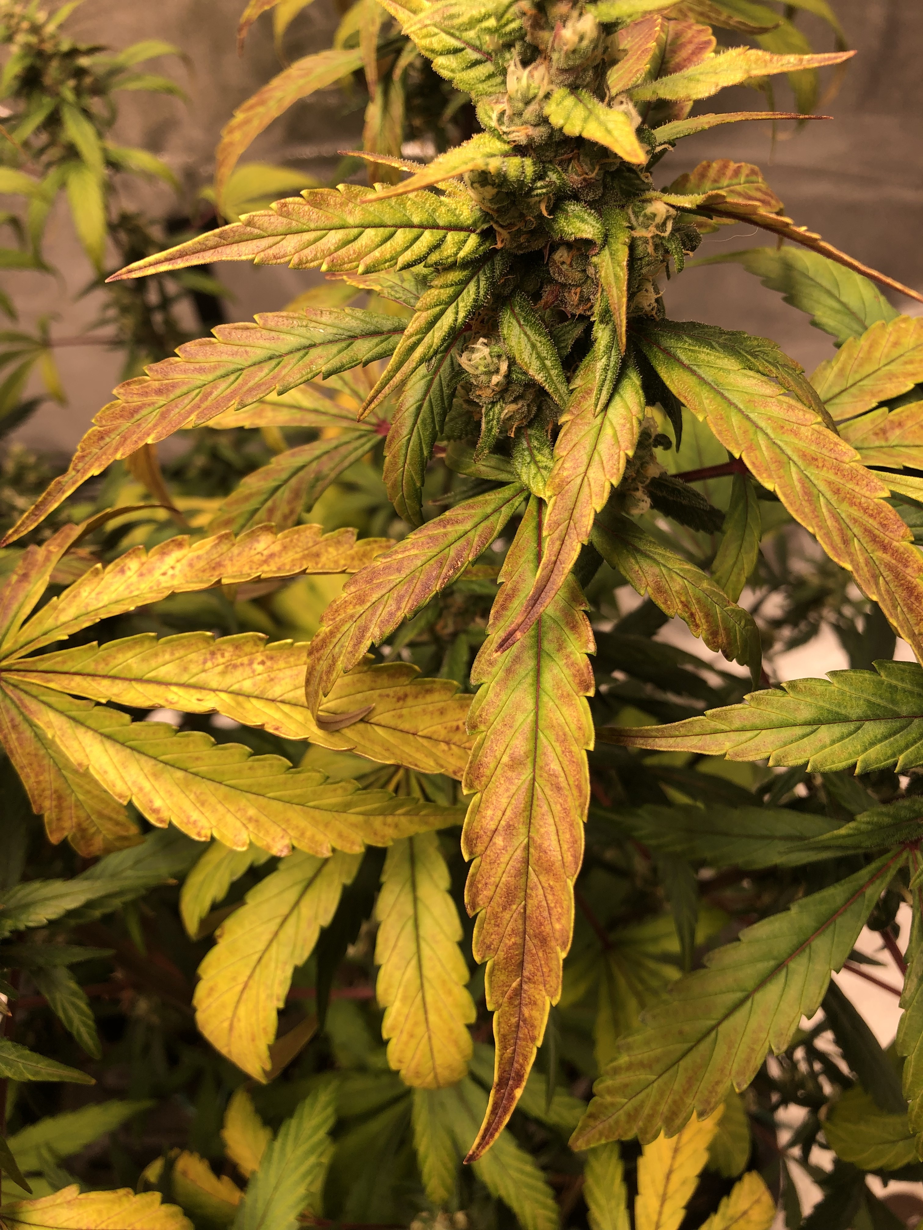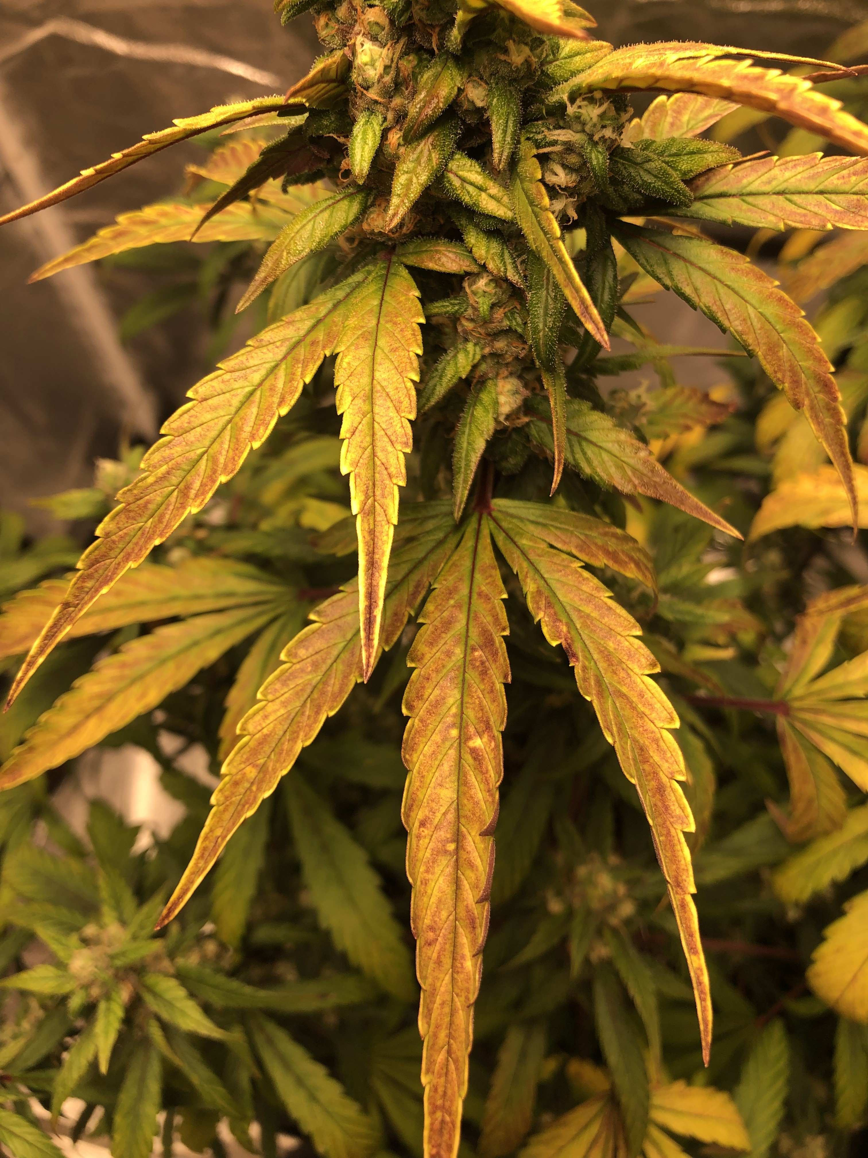 I am from Thailand, so my English is not good. My gorilla glue is 46 days(total), and about 5 days ago, it turns yellows with some black or purple spot on the leafs. My PH level is 6.8, Temp is 24-28c, and humidity is 50-65%. I am using Advance Nutrient as my fertilizer. What happen with my cannabis plants???