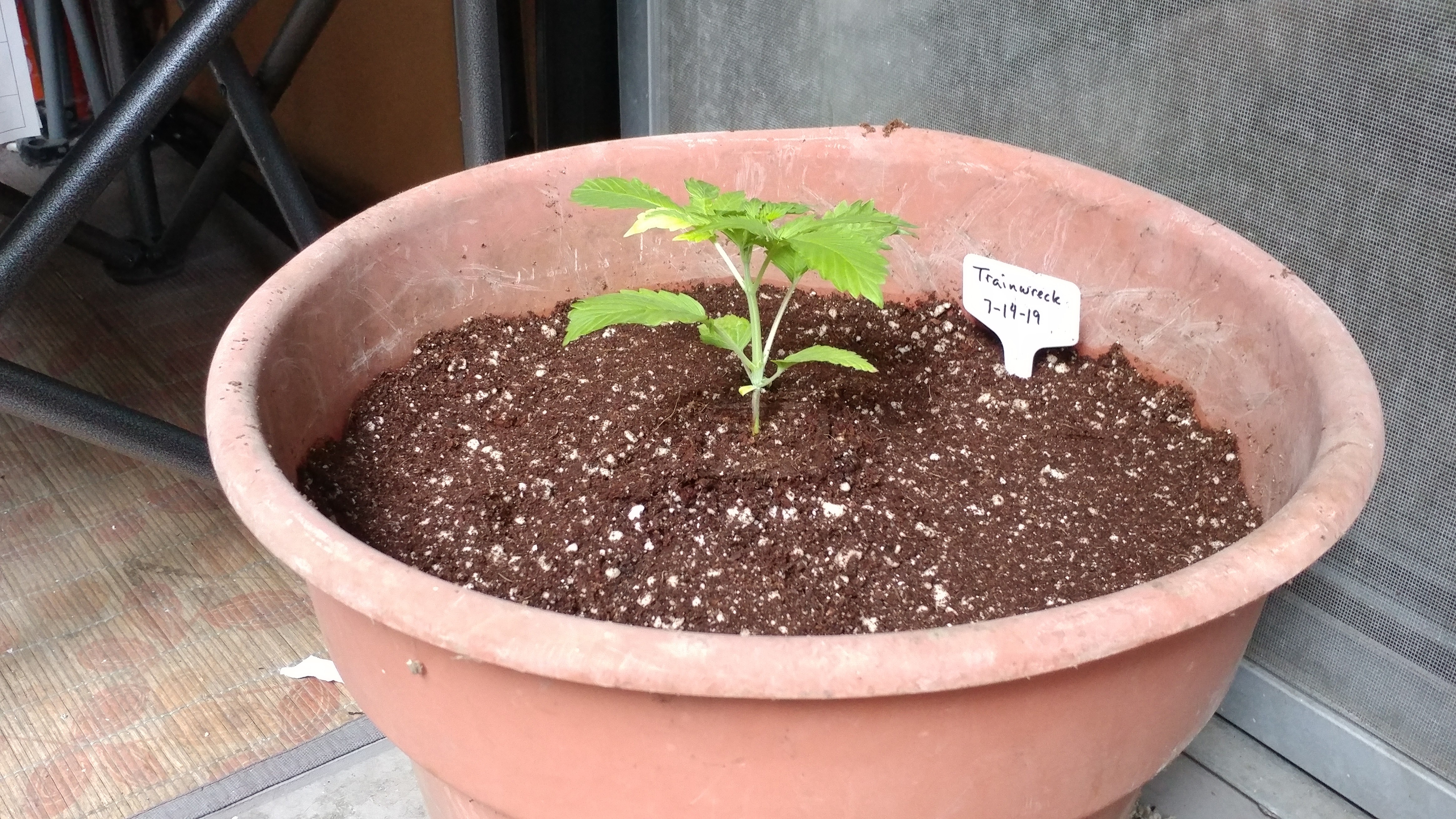 My porch pot. Small pot is Lemon Skunk and big pot is Trainwreck. Both started indoors, but weren't growing. Lemon Skunk was slow, and Train had weird deformed leaves. Placed them outside and they fixed themselves up. These are more play plants than hoping for good bud.